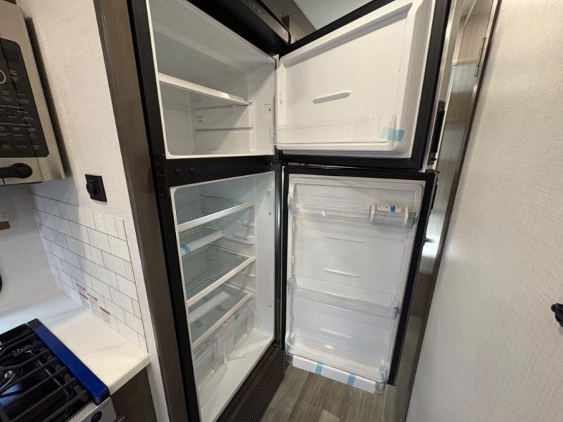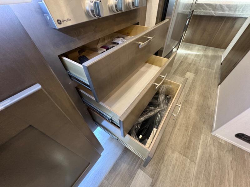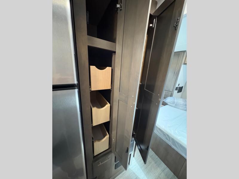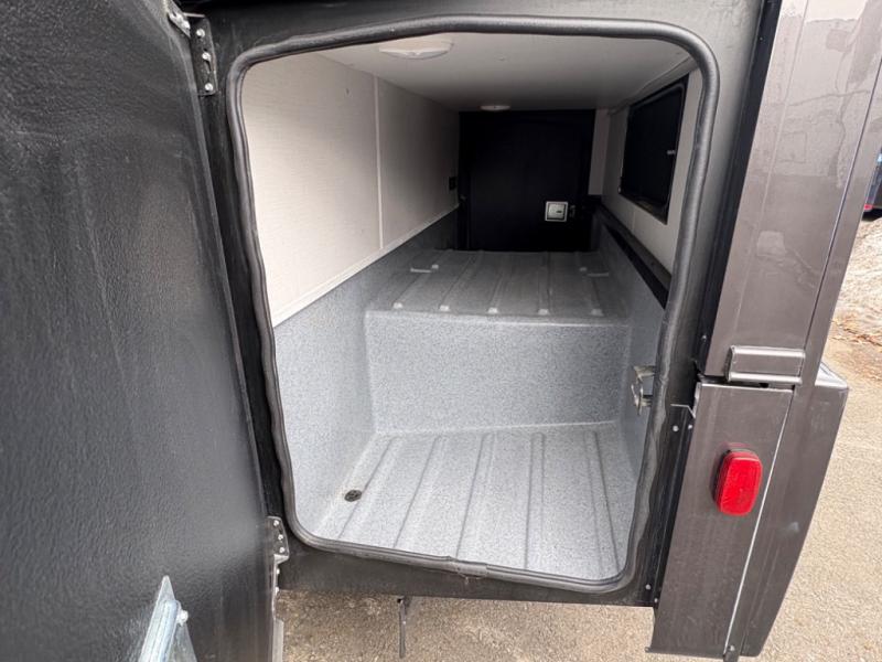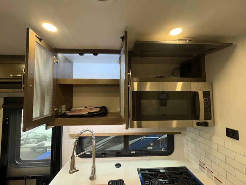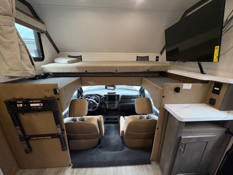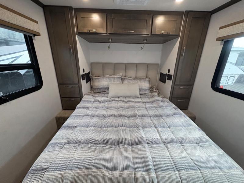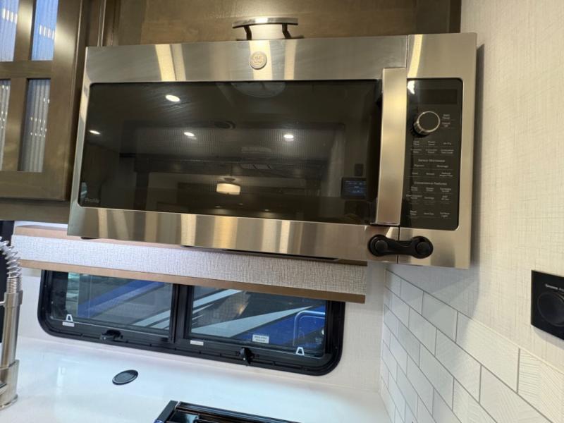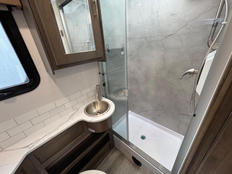 Inside, you’ll find upscale appointments that rival high-end condos—solid surface countertops, premium residential cabinetry, LED lighting, and a spacious full bath. The living area boasts a Dream Dinette, theater seating (optional), and an overhead bunk for added sleeping space.