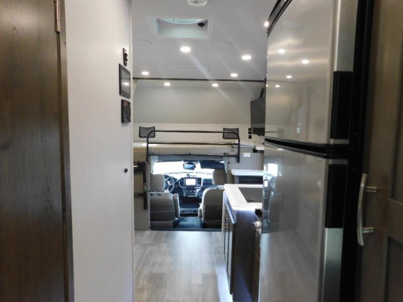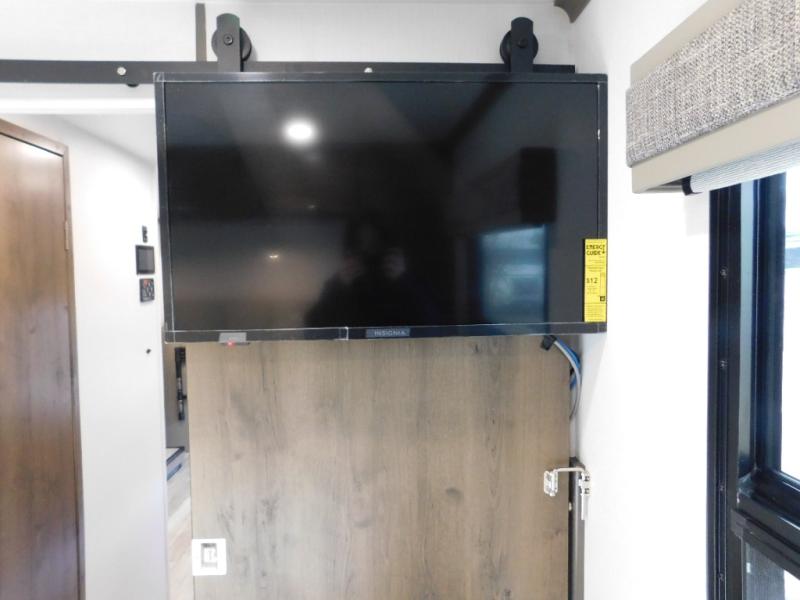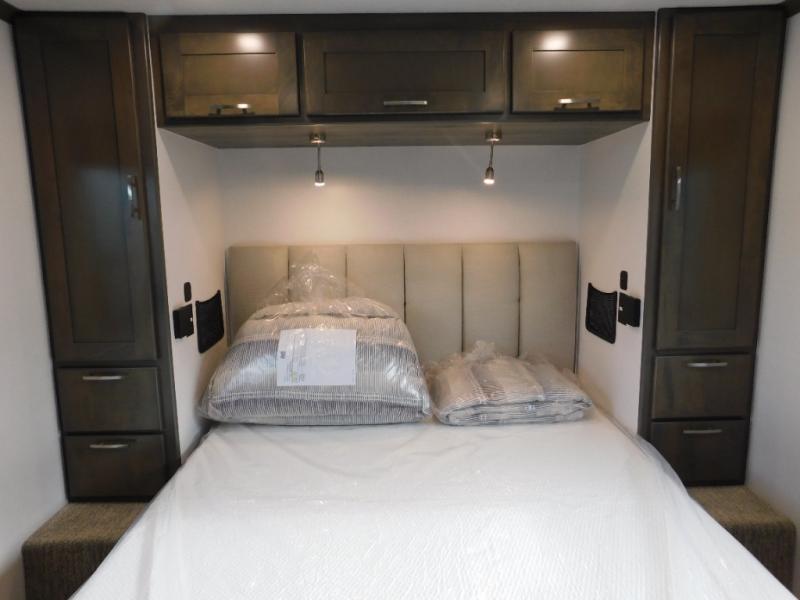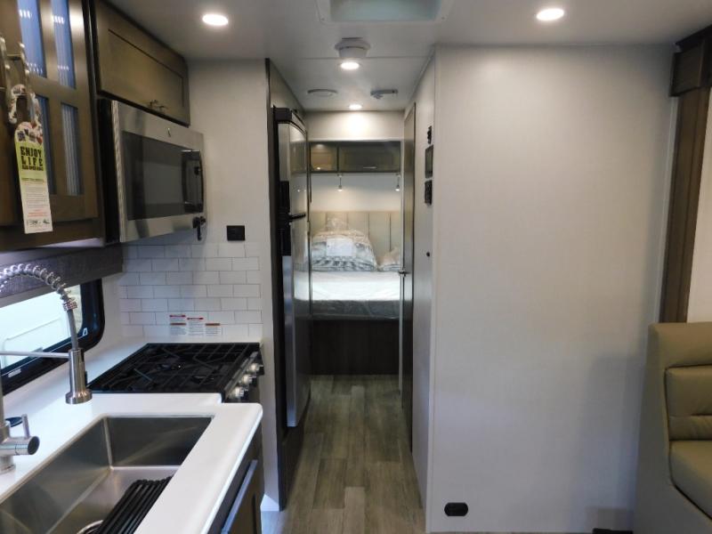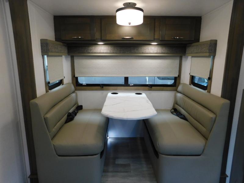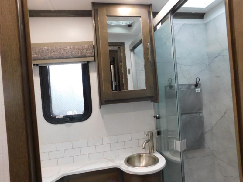 Pick a spot on the map and start traveling there in comfort with this motorhome! The rear private bedroom has a 60" x 75" gel-infused memory foam mattress for a good night's rest, LED reading lights, USB charging ports to charge your electronics while you recharge, and a 32" LED smart TV to watch movies in true comfort. The full bathroom has a designer shower with a skylight above for added head room and natural lighting and an Oxygenics body spa RV shower head for an even better showering experience on the road. The kitchen has everything you could need to prepare delicious home cooked meals including a countertop extension for more meal prepping space, and you can enjoy all of your meals at the booth dinette slide which can also transform into an extra sleeping space!