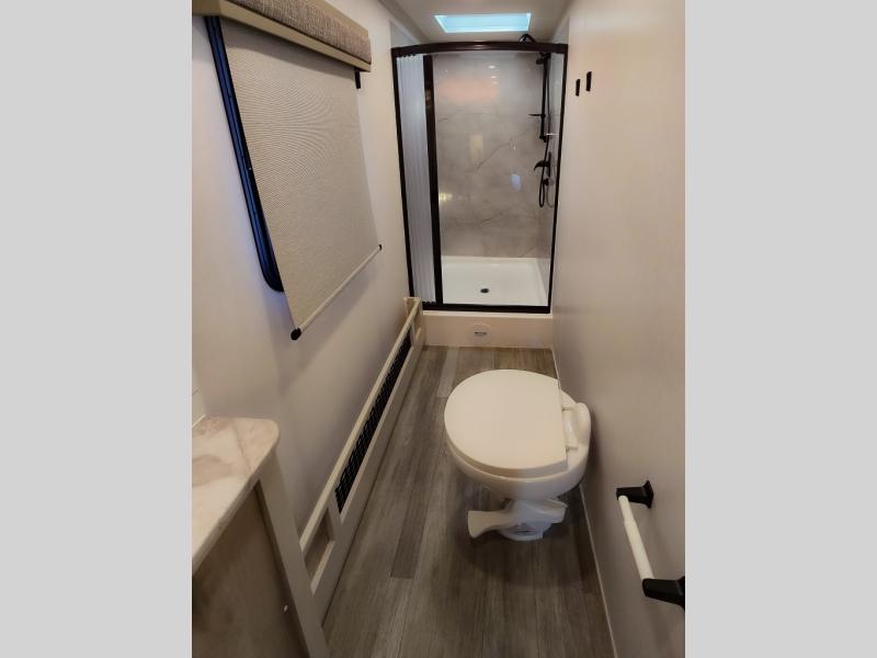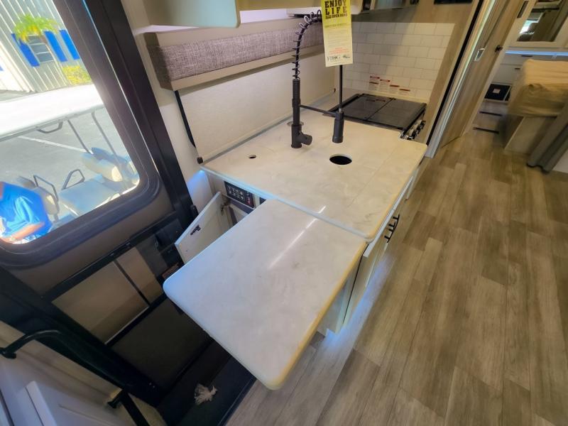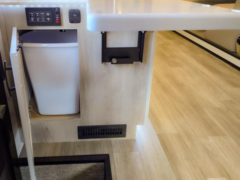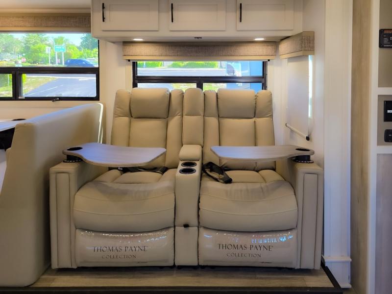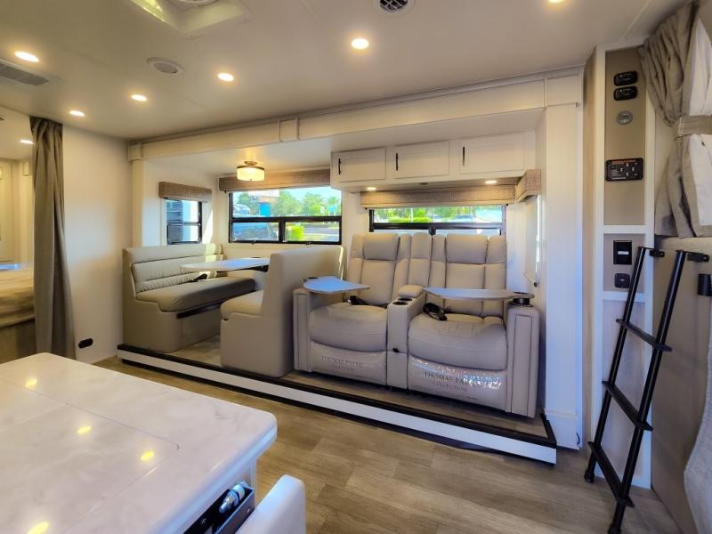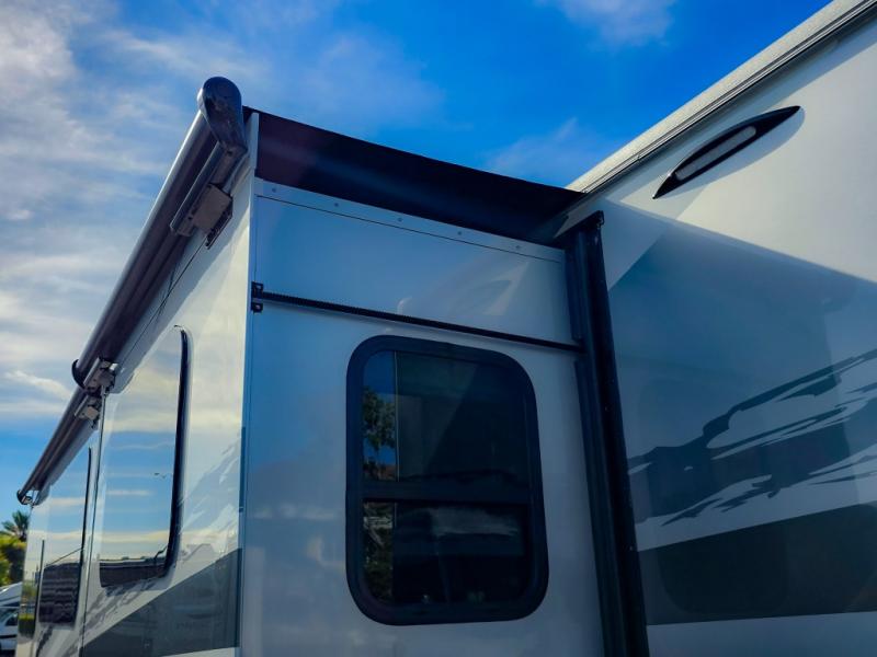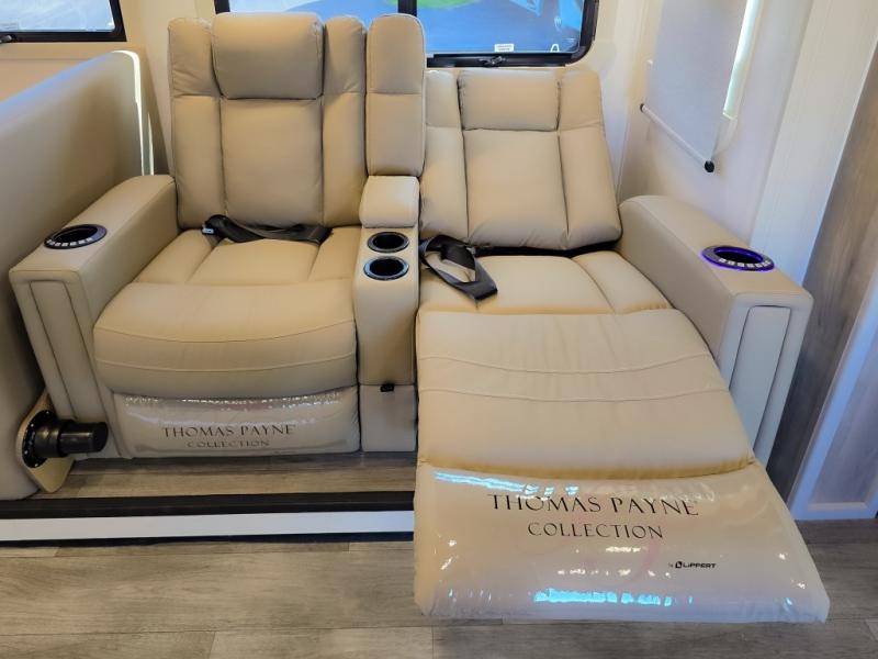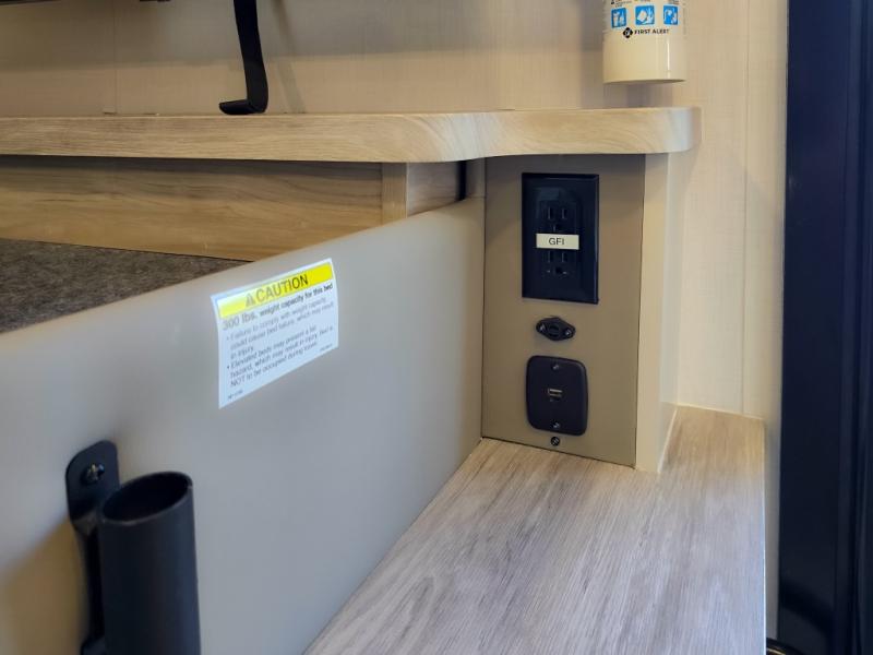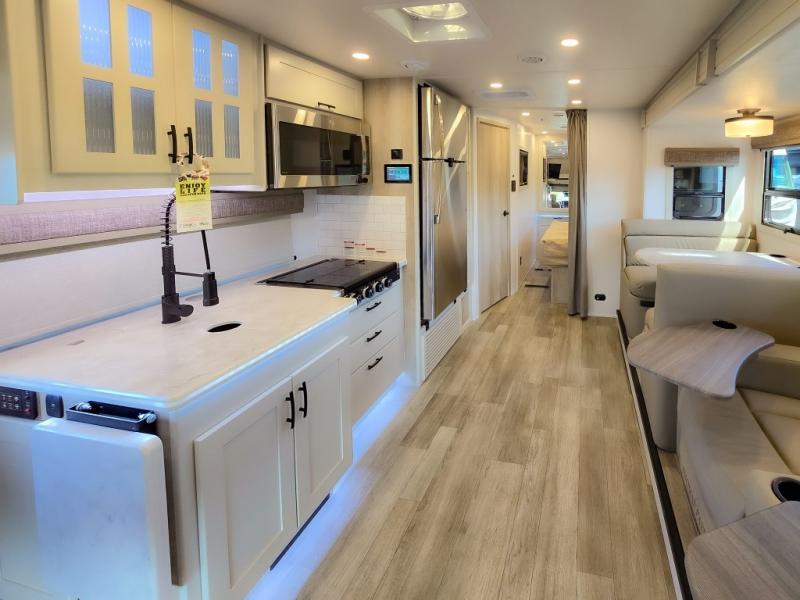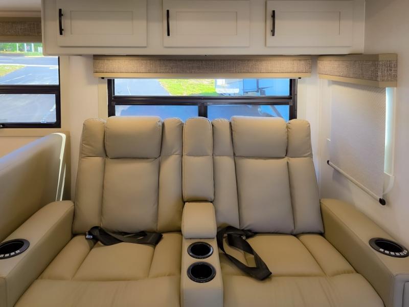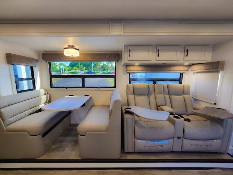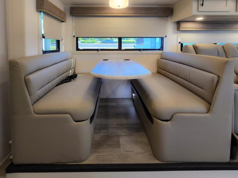 You will have plenty of space to walk about this motorhome with the dual slides! The booth dinette and sofa slide create an open concept living area and the sofa can be replaced for the optional theater seating if you prefer that instead. Freshen up after a long day of traveling in the rear corner bathroom with the designer shower that has a skylight above for more natural lighting and an Oxygenics body spa RV shower head for a more relaxing shower. Put on your comfy clothes stored in the wardrobe in the rear corner private bedroom then either lay on the 60" x 75" gel-infused memory foam mattress while you watch a movie on the 32" LED smart TV or head to the kitchen and whip up a meal with the three burner gas range and countertop extension. You could even head outside and watch a movie on the exterior 32" TV underneath the 16' dual-pitch armless awning!