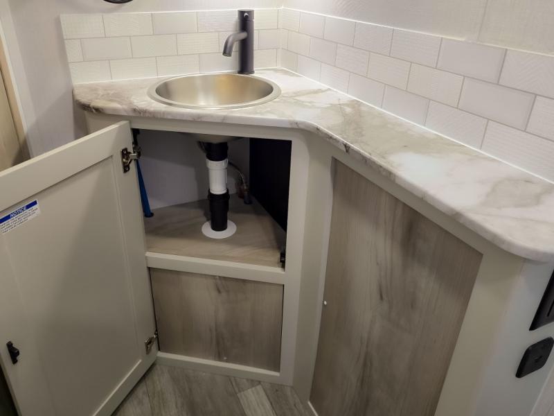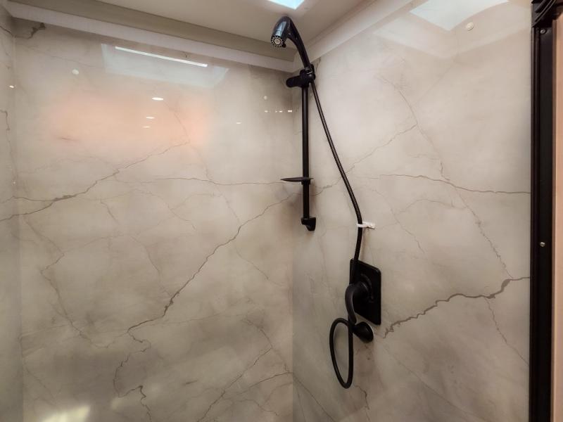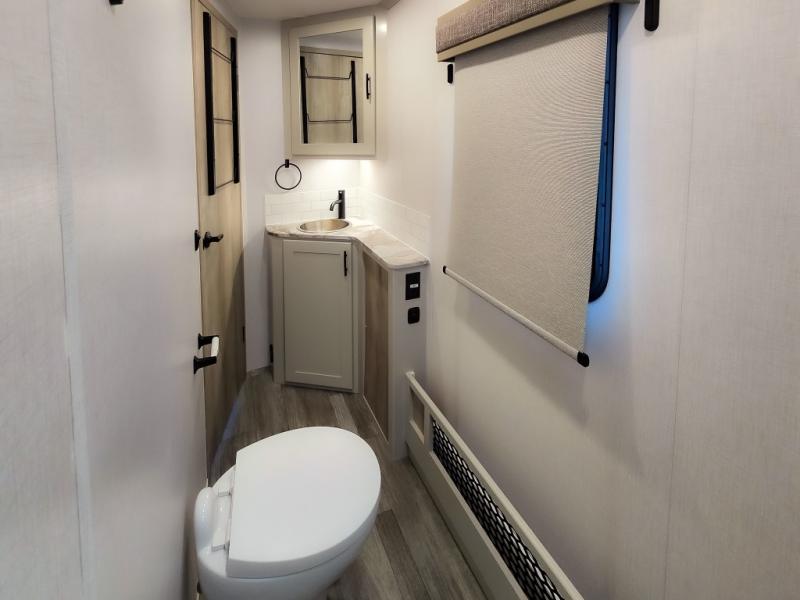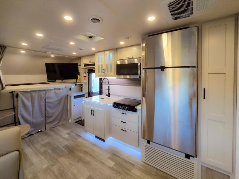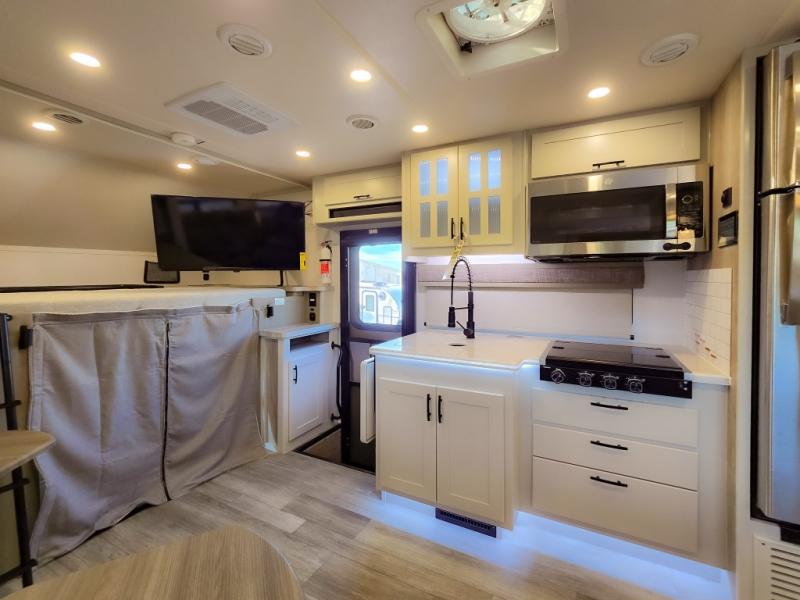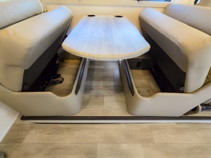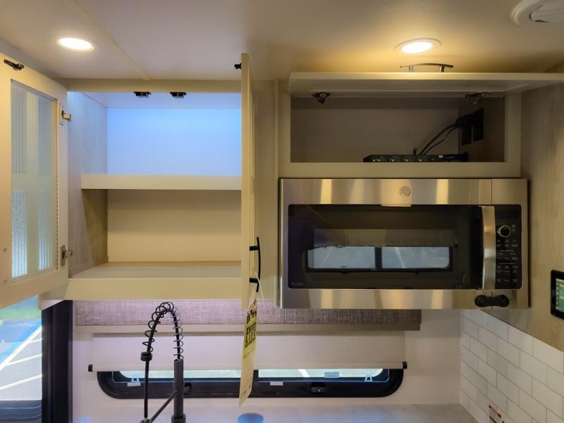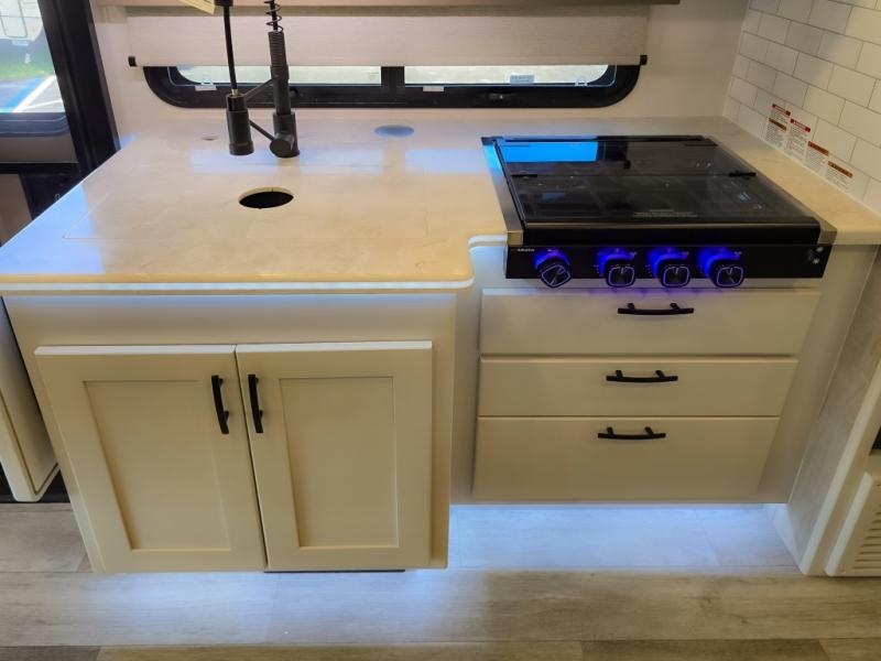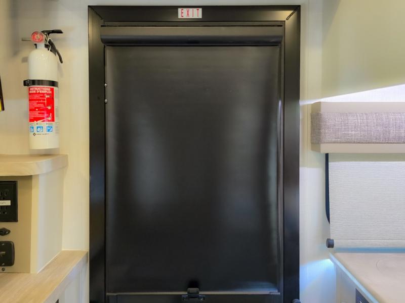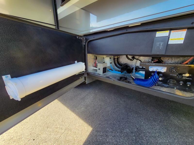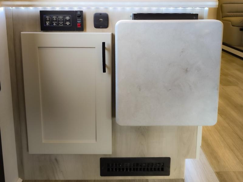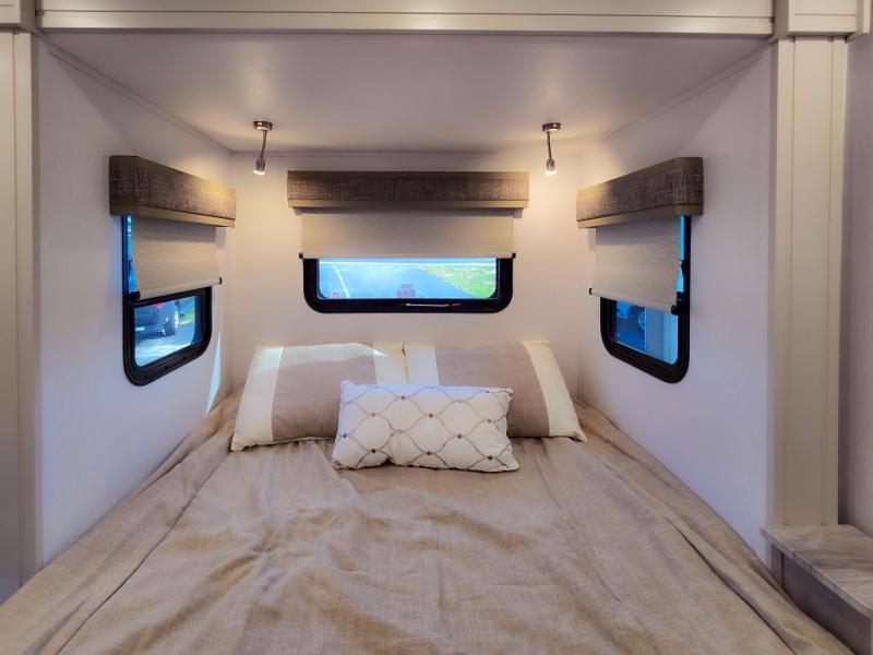 You will have plenty of space to walk about this motorhome with the dual slides! The booth dinette and sofa slide create an open concept living area and the sofa can be replaced for the optional theater seating if you prefer that instead. Freshen up after a long day of traveling in the rear corner bathroom with the designer shower that has a skylight above for more natural lighting and an Oxygenics body spa RV shower head for a more relaxing shower. Put on your comfy clothes stored in the wardrobe in the rear corner private bedroom then either lay on the 60" x 75" gel-infused memory foam mattress while you watch a movie on the 32" LED smart TV or head to the kitchen and whip up a meal with the three burner gas range and countertop extension. You could even head outside and watch a movie on the exterior 32" TV underneath the 16' dual-pitch armless awning!