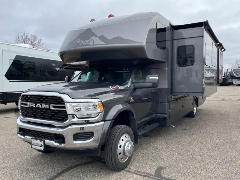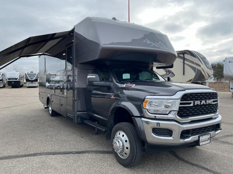 Each one of these Dynamax isata 5 Super C diesel motorhomes offer control, comfort, and stability thanks to the Ram 5500 SLT chassis with factory 4-wheel drive! They are powered by a Cummins 6.7L I6 turbo diesel engine and an AISIN HD 6-speed automatic transmission. Their construction consists of 2" aluminum-framed, laminated sidewalls with block foam insulation, composite exterior fiberglass, and a composite flooring substrate that is lightweight and moisture resistant. You will see their attention to detail everywhere you look including ambient lighting, premium cut and buffed paint finish, and a water filtration system for clean water where ever you go. They even have a single 190 watt solar panel with a 30 amp controller so you can go off the grid. Come check out your favorite model today!