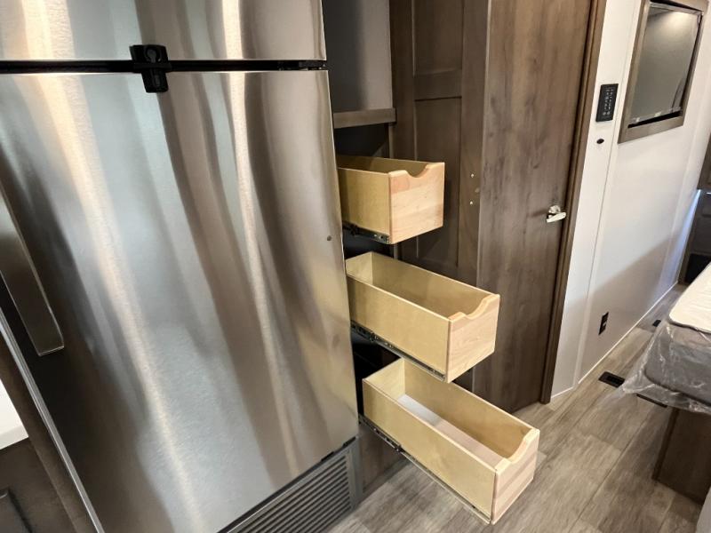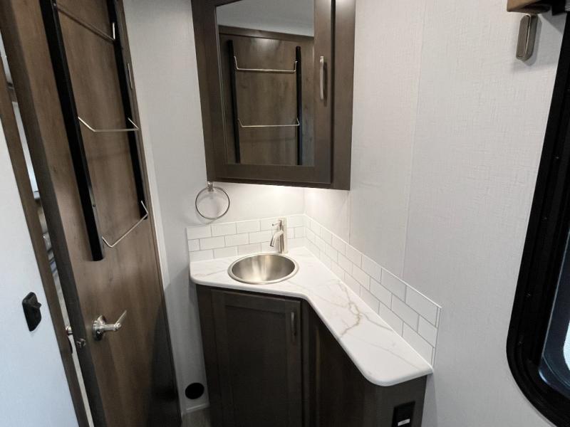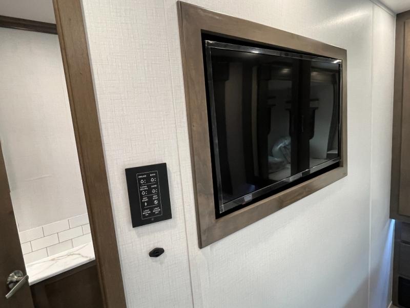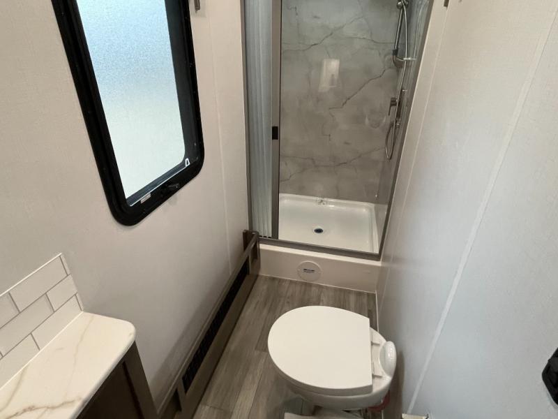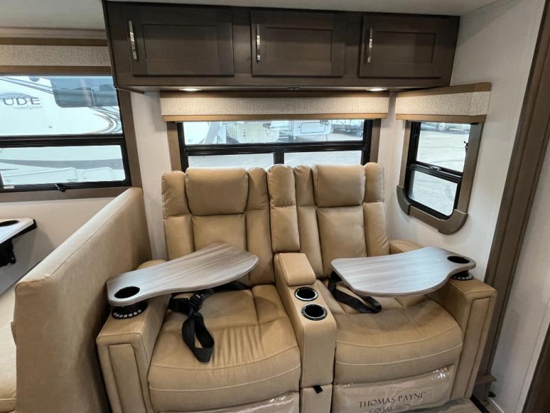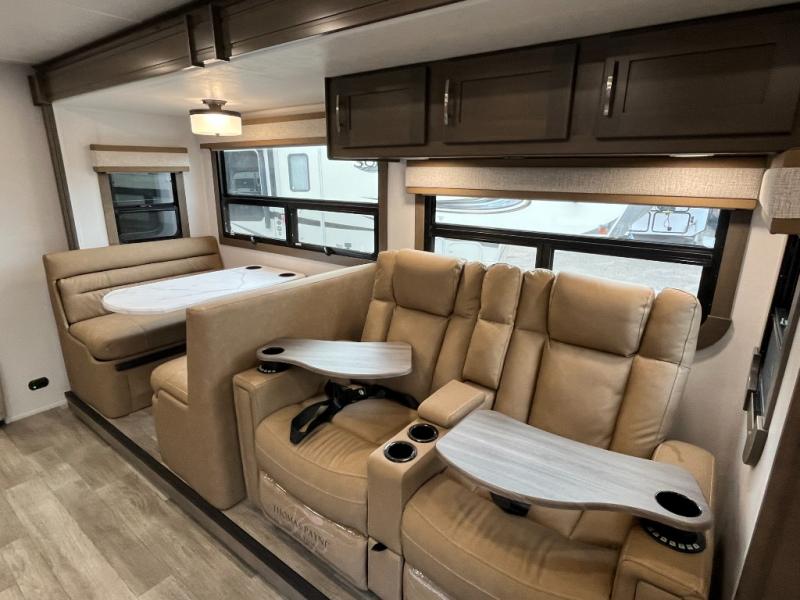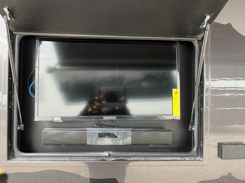 You will have plenty of space to walk about this motorhome with the dual slides! The booth dinette and sofa slide create an open concept living area and the sofa can be replaced for the optional theater seating if you prefer that instead. Freshen up after a long day of traveling in the rear corner bathroom with the designer shower that has a skylight above for more natural lighting and an Oxygenics body spa RV shower head for a more relaxing shower. Put on your comfy clothes stored in the wardrobe in the rear corner private bedroom then either lay on the 60" x 75" gel-infused memory foam mattress while you watch a movie on the 32" LED smart TV or head to the kitchen and whip up a meal with the three burner gas range and countertop extension. You could even head outside and watch a movie on the exterior 32" TV underneath the 16' dual-pitch armless awning!