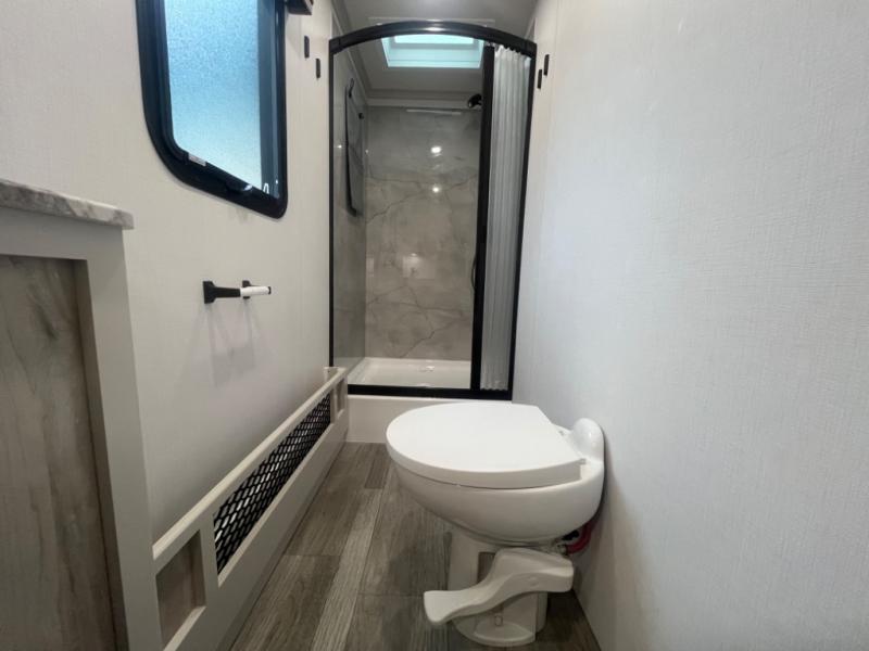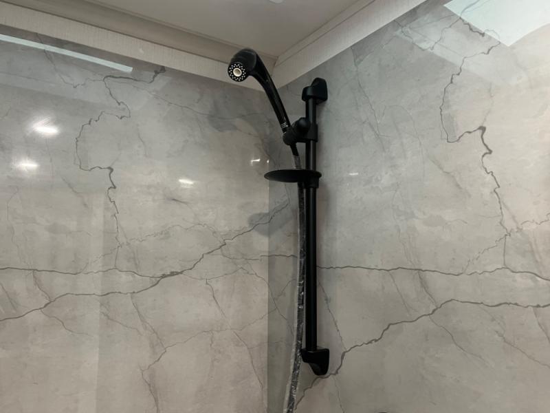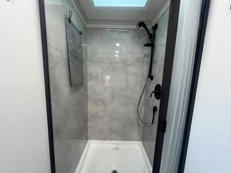 - Large one-piece fiberglass shower with skylight for extra headroom and natural light.