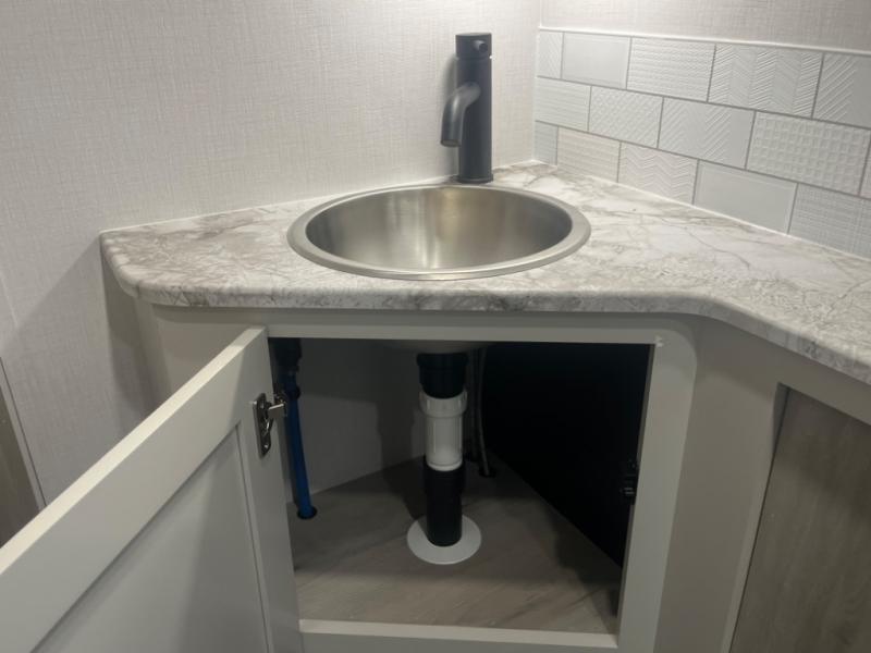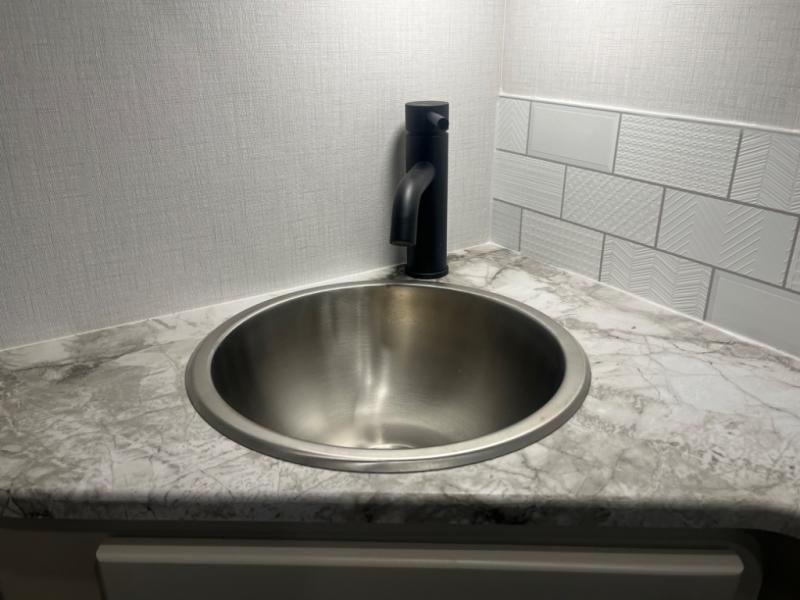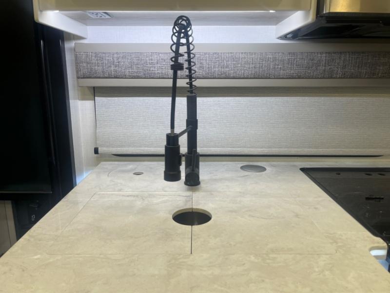 - Solid-surface countertops with a deep stainless steel sink for easy meal prep.