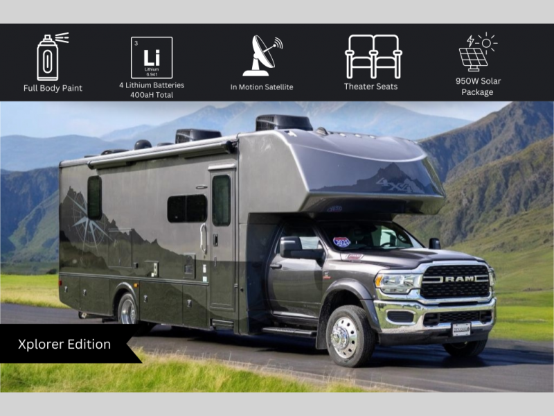 - Xplorer Package ( Dual-Pane, Dark-Tinted Frameless Windows, Insulated Cab Curtain, Four Lithium House Batteries (400aH Total), 950W Solar Package, Insulated Utility Bay with Secondary Tank Heater and Temperature Sensor.