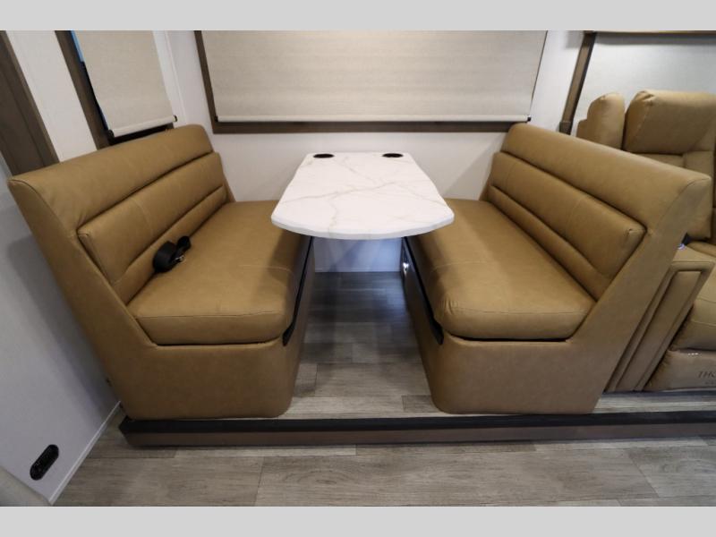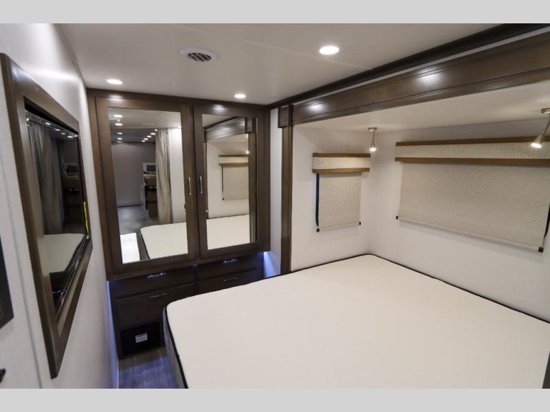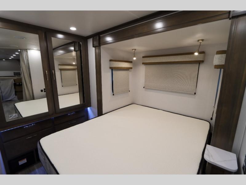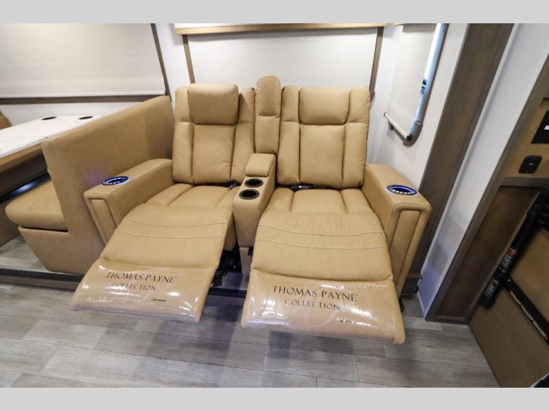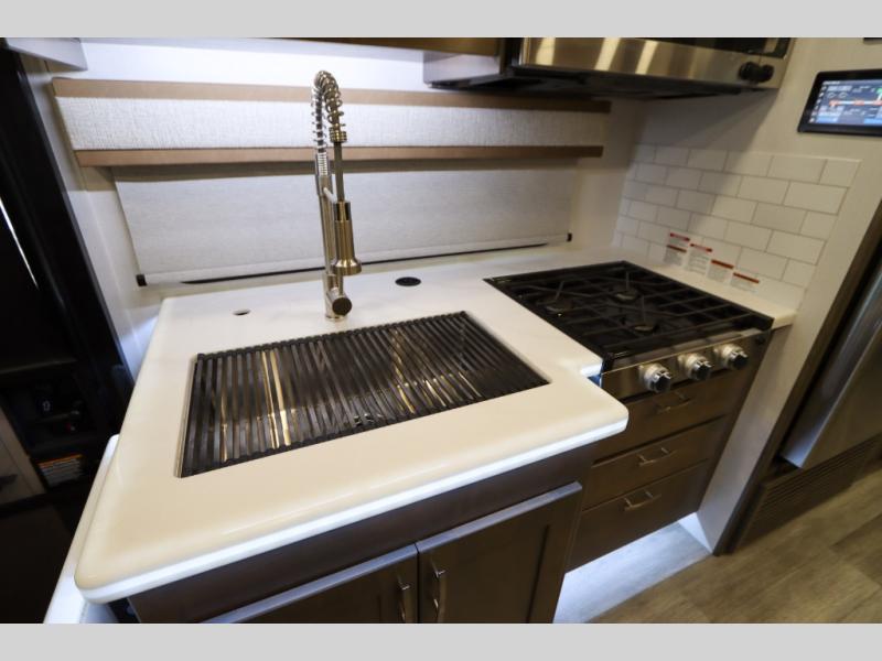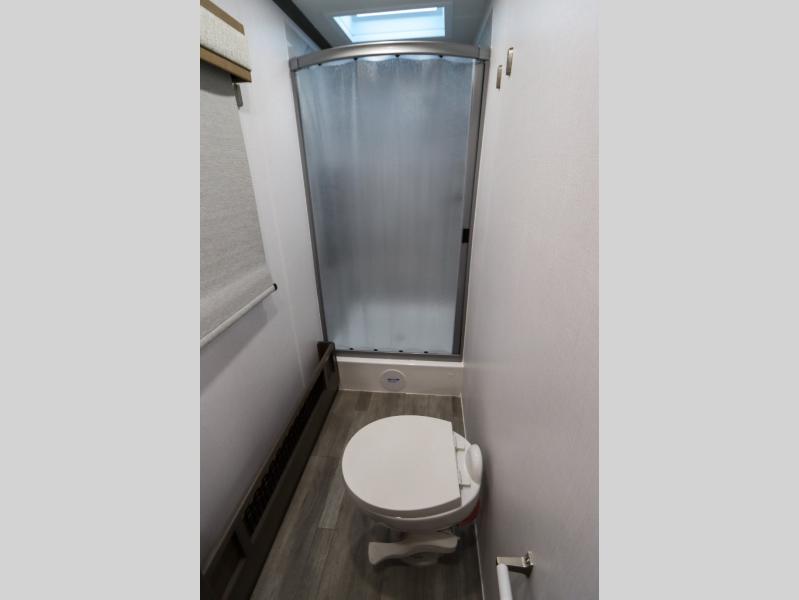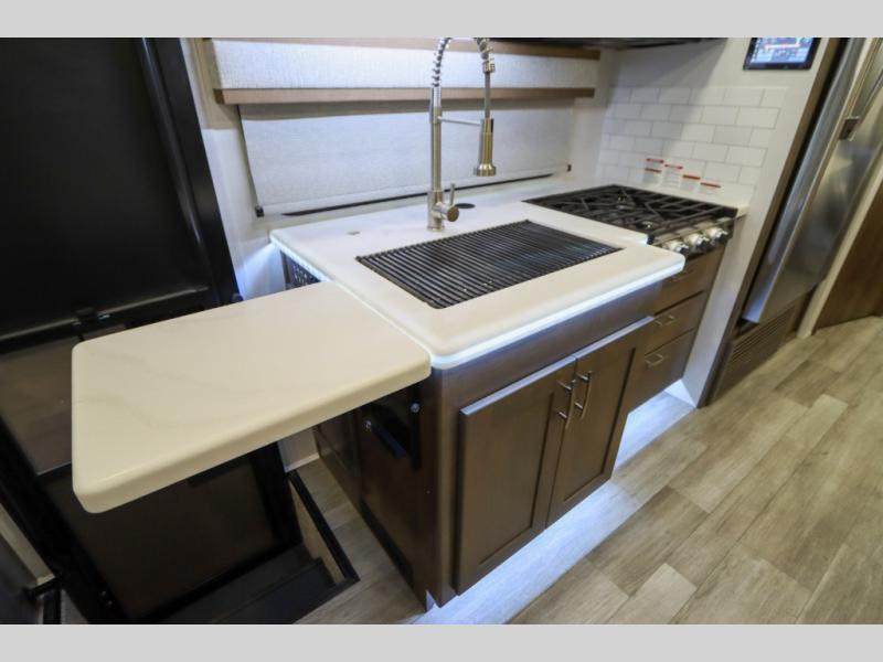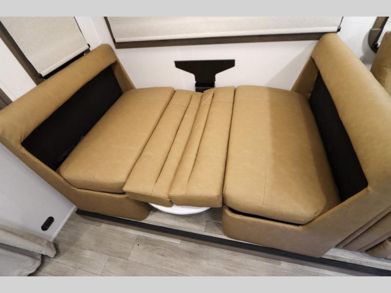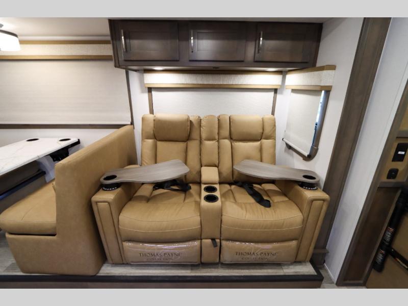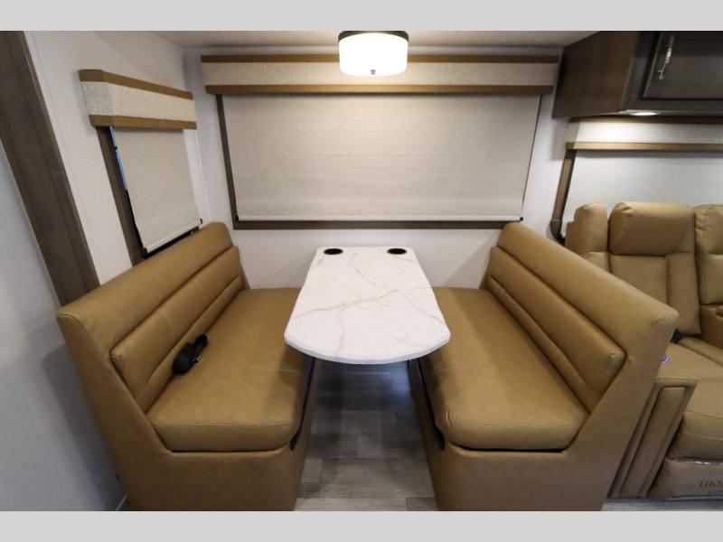 You will have plenty of space to walk about this motorhome with the dual slides! The booth dinette and sofa slide create an open concept living area and the sofa can be replaced for the optional theater seating if you prefer that instead. Freshen up after a long day of traveling in the rear corner bathroom with the designer shower that has a skylight above for more natural lighting and an Oxygenics body spa RV shower head for a more relaxing shower. Put on your comfy clothes stored in the wardrobe in the rear corner private bedroom then either lay on the 60" x 75" gel-infused memory foam mattress while you watch a movie on the 32" LED smart TV or head to the kitchen and whip up a meal with the three burner gas range and countertop extension. You could even head outside and watch a movie on the exterior 32" TV underneath the 16' dual-pitch armless awning!