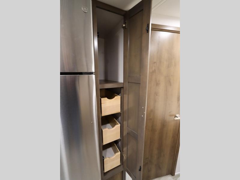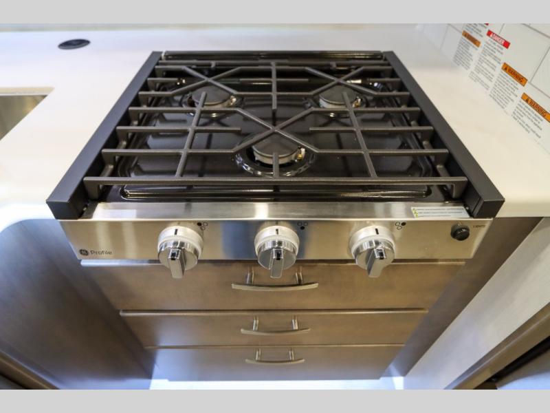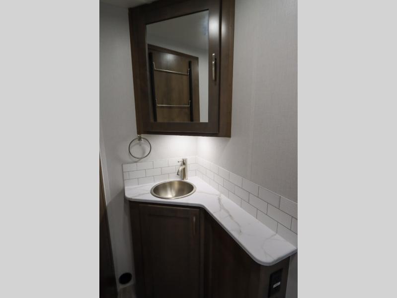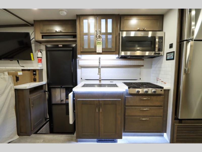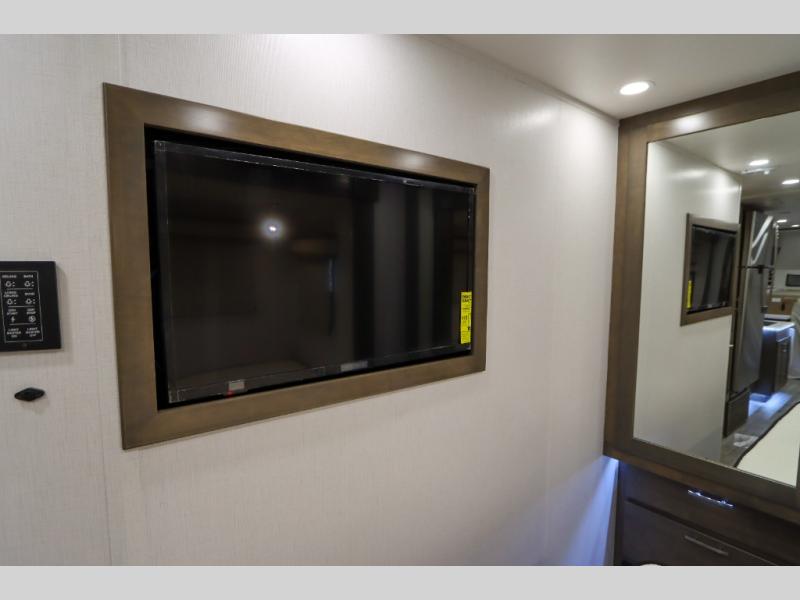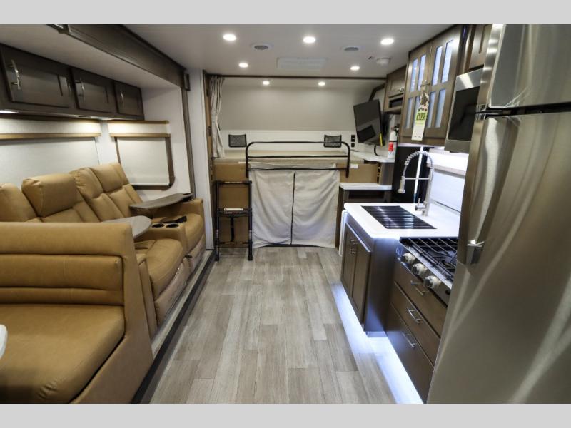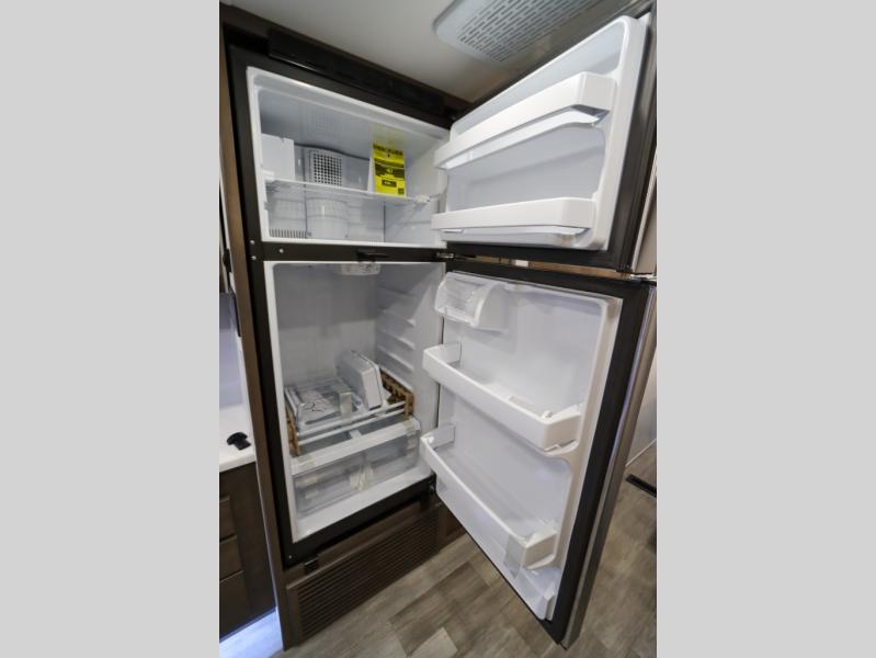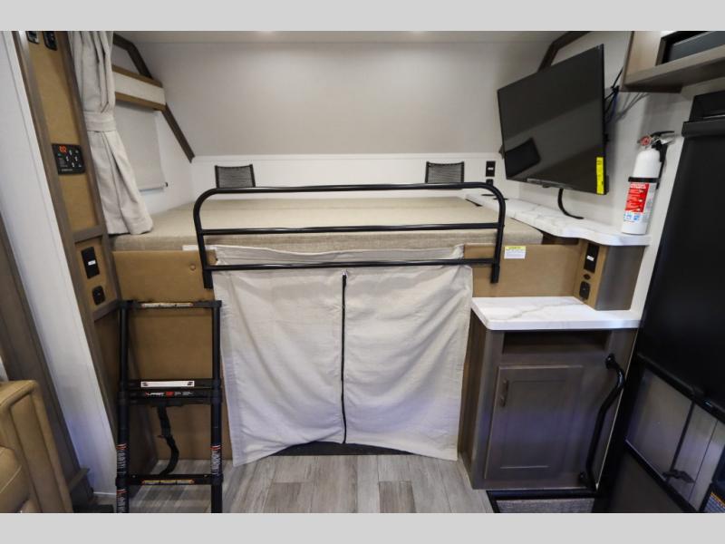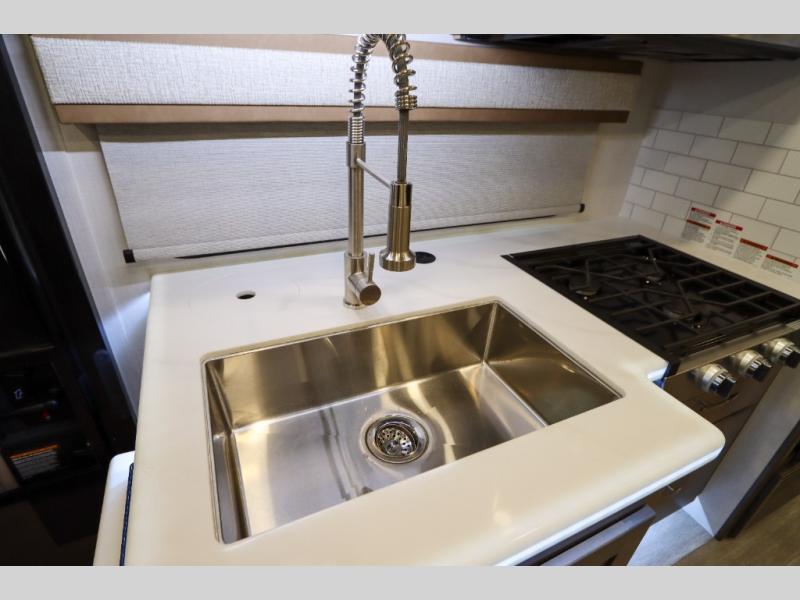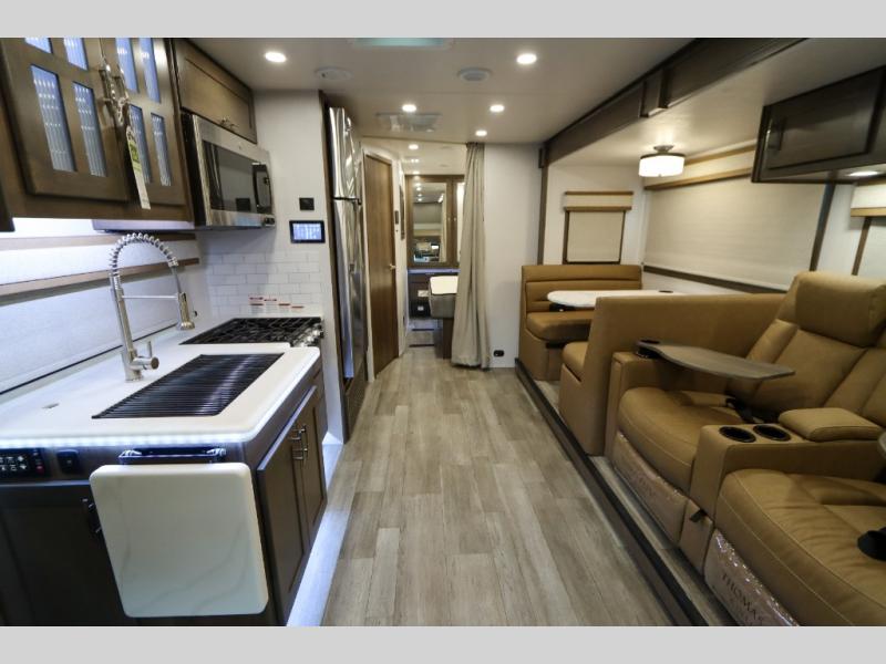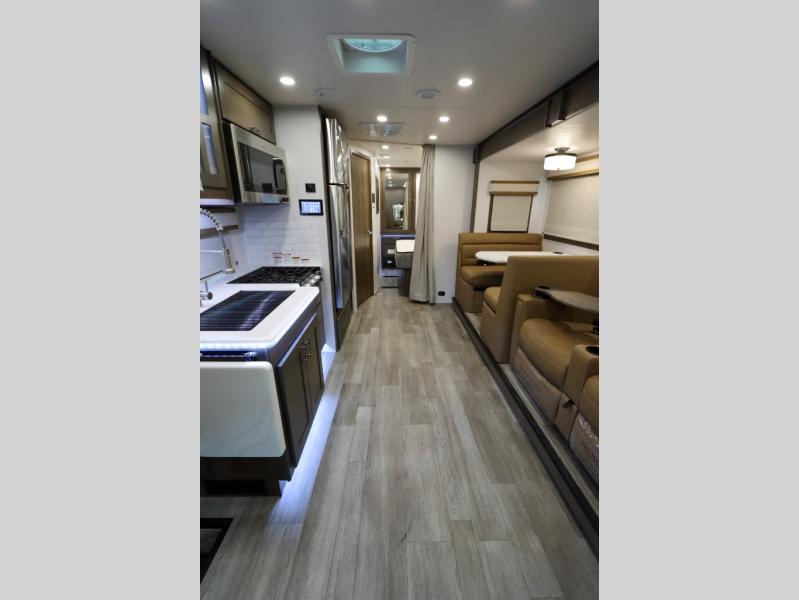You will have plenty of space to walk about this motorhome with the dual slides! The booth dinette and sofa slide create an open concept living area and the sofa can be replaced for the optional theater seating if you prefer that instead. Freshen up after a long day of traveling in the rear corner bathroom with the designer shower that has a skylight above for more natural lighting and an Oxygenics body spa RV shower head for a more relaxing shower. Put on your comfy clothes stored in the wardrobe in the rear corner private bedroom then either lay on the 60" x 75" gel-infused memory foam mattress while you watch a movie on the 32" LED smart TV or head to the kitchen and whip up a meal with the three burner gas range and countertop extension. You could even head outside and watch a movie on the exterior 32" TV underneath the 16' dual-pitch armless awning!