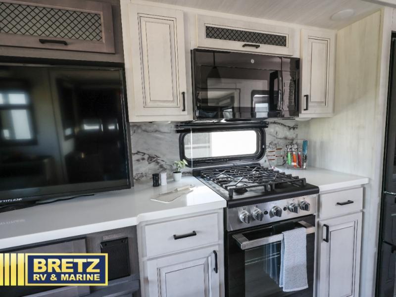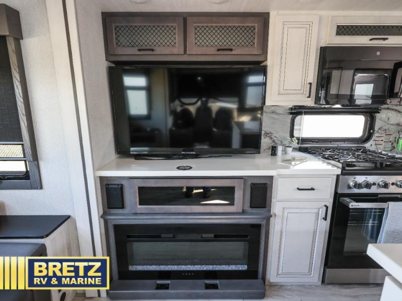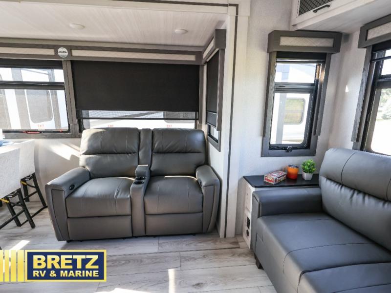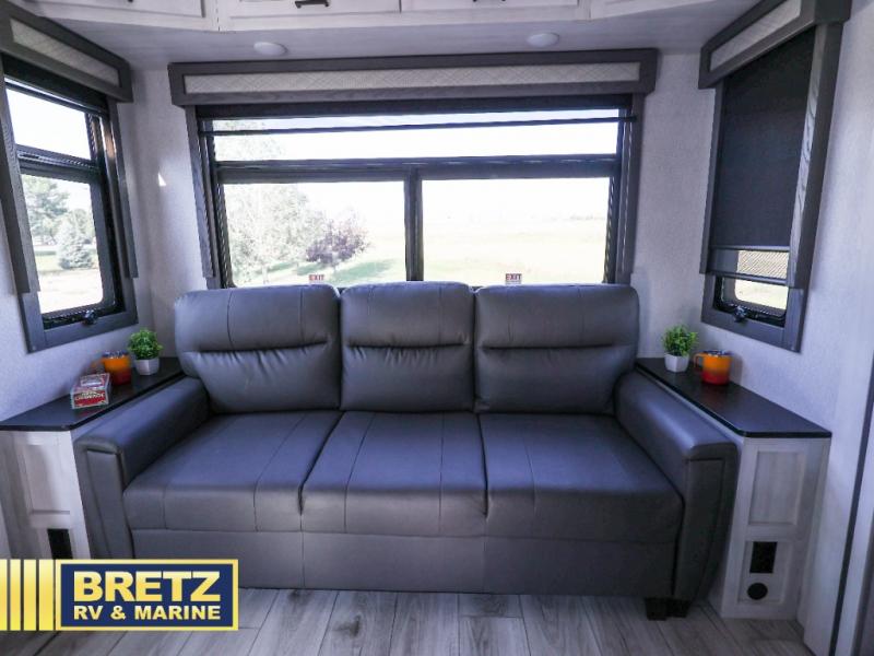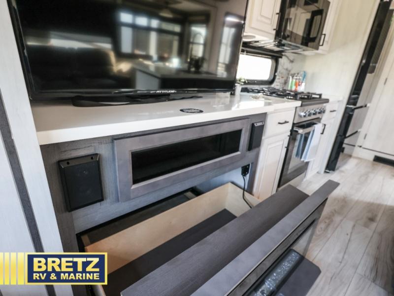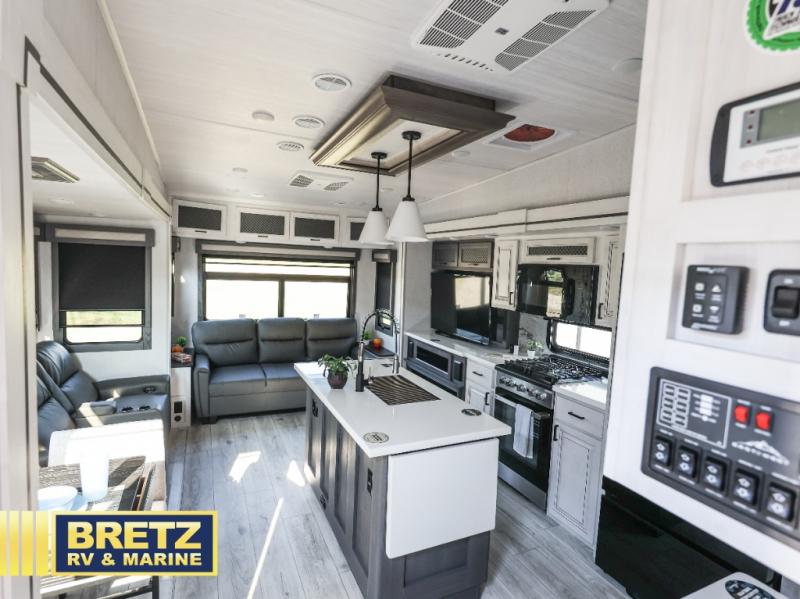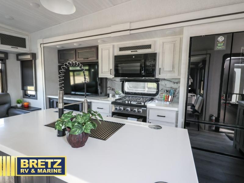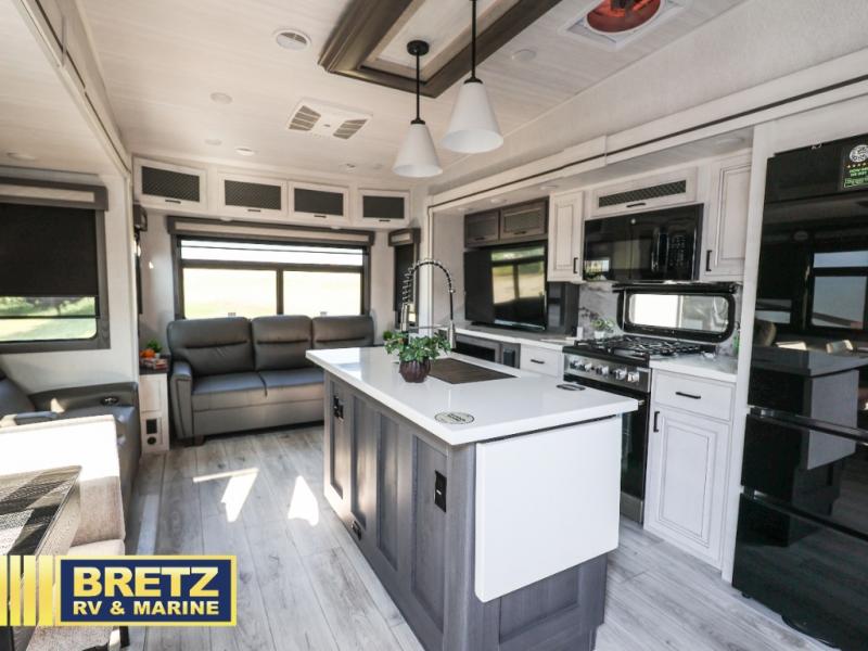 There isn't a thing you won't love about this Ahara fifth wheel! It offers you an excellent master suite that has a king bed slide with drawers under the bed, a sliding dresser top with hidden storage across from the bed for adding a TV, a closet with washer/dryer prep, and a large closet with sliding doors for your clothes. The kitchen is also quite amazing with its pantry, hutch, 16-cubic foot 12V refrigerator, four-burner range, 30" microwave, residential LED pendant lights, roll-up stainless steel drying rack, and kitchen island with countertop extensions. As you sit back on the theater seating or 78" sofa, you'll be kept warm by the 5,100 BTU electric fireplace below the TV, and you can also sit in one of the chairs at the free-standing dinette if you need to work on the computer.