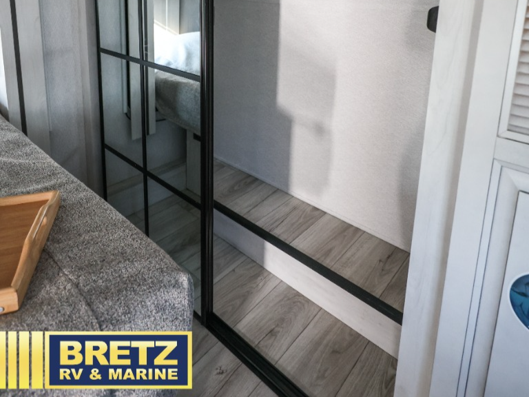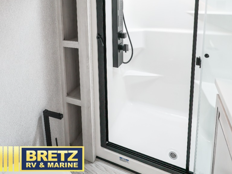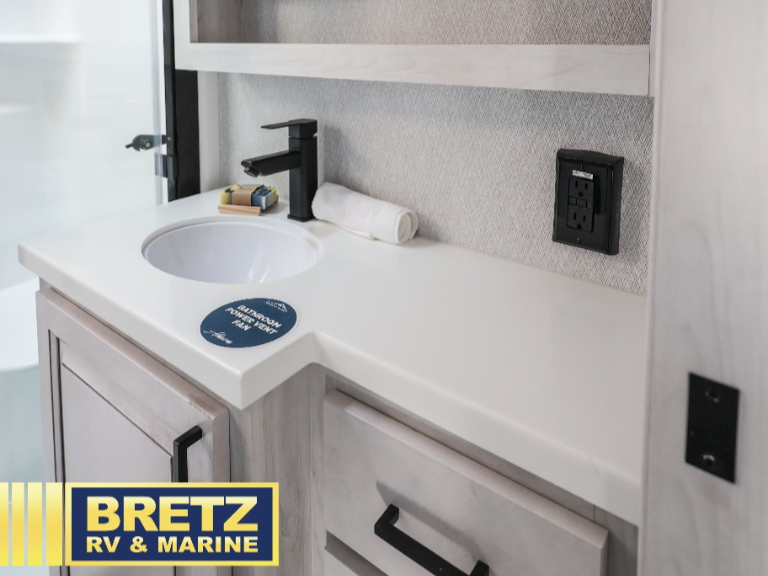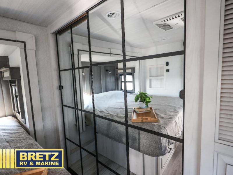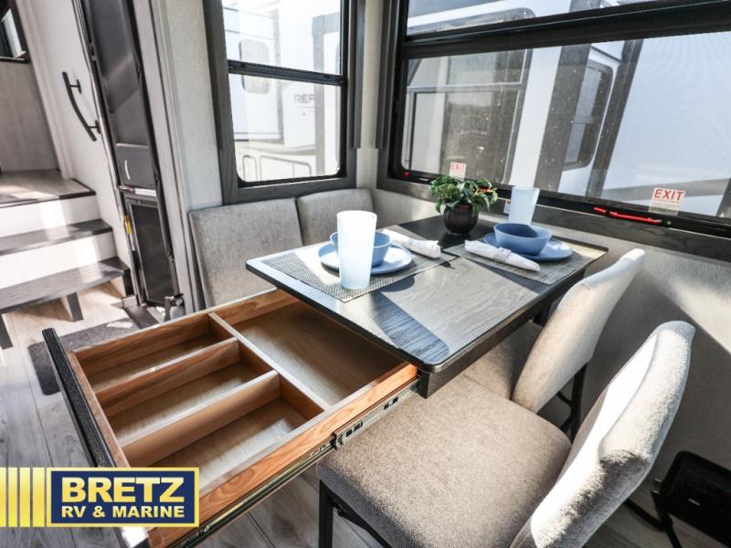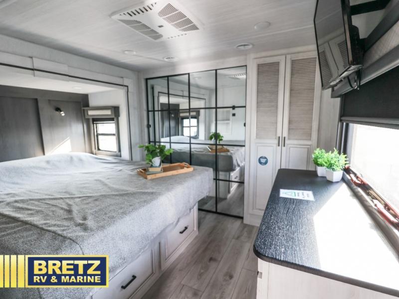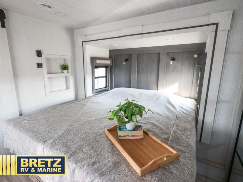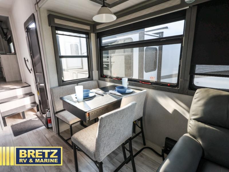 There isn't a thing you won't love about this Ahara fifth wheel! It offers you an excellent master suite that has a king bed slide with drawers under the bed, a sliding dresser top with hidden storage across from the bed for adding a TV, a closet with washer/dryer prep, and a large closet with sliding doors for your clothes. The kitchen is also quite amazing with its pantry, hutch, 16-cubic foot 12V refrigerator, four-burner range, 30" microwave, residential LED pendant lights, roll-up stainless steel drying rack, and kitchen island with countertop extensions. As you sit back on the theater seating or 78" sofa, you'll be kept warm by the 5,100 BTU electric fireplace below the TV, and you can also sit in one of the chairs at the free-standing dinette if you need to work on the computer.