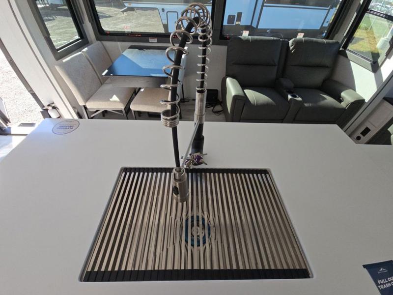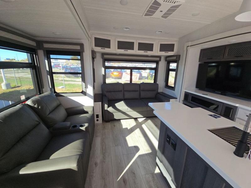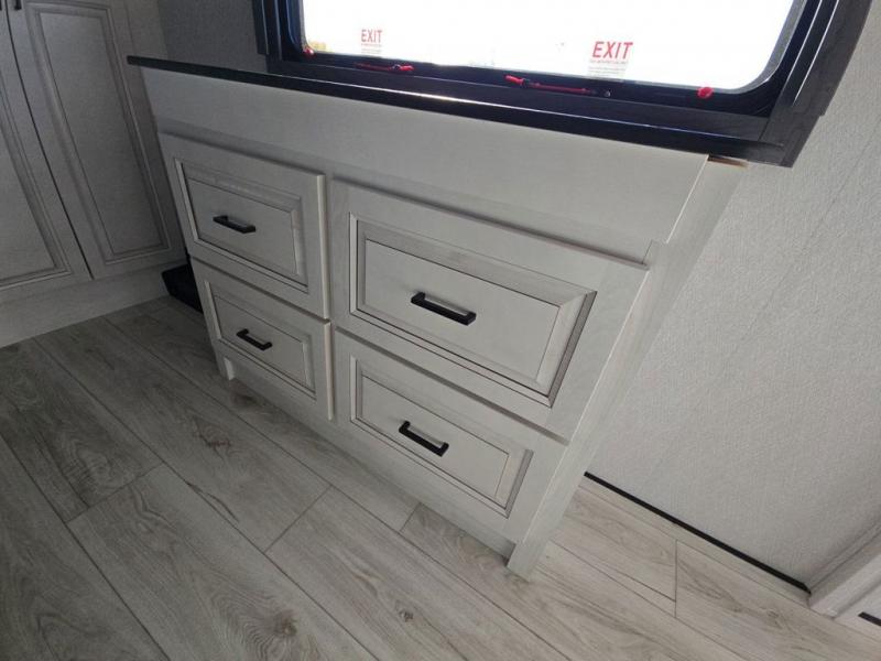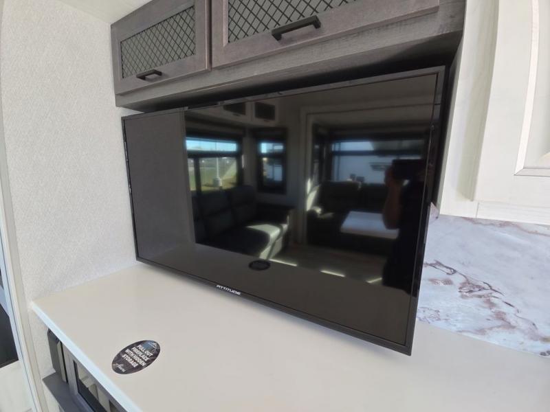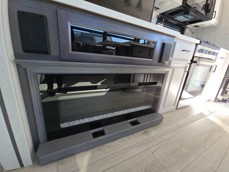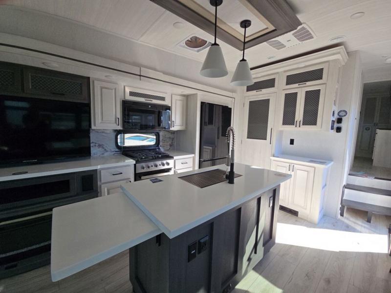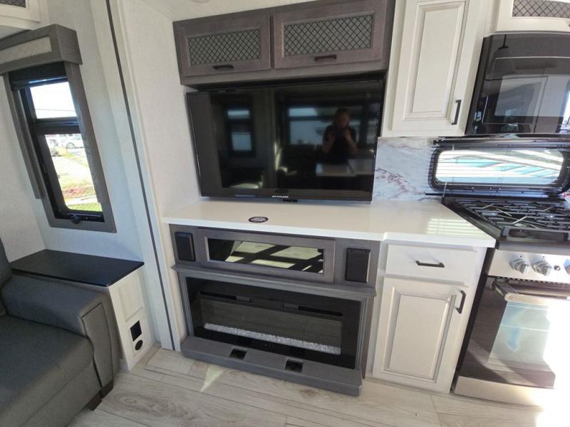 There isn't a thing you won't love about this Ahara fifth wheel! It offers you an excellent master suite that has a king bed slide with drawers under the bed, a dresser across from the bed for adding a TV, a closet with washer/dryer prep, and a large closet with sliding doors for your clothes. The kitchen is also quite amazing with its pantry, hutch, 16-cubic foot 12V refrigerator, four-burner range, 30" microwave, residential LED pendant lights, roll-up stainless steel drying rack, and kitchen island with countertop extensions. As you sit back on the theater seating or 78" sofa, you'll be kept warm by the 5,100 BTU electric fireplace below the TV, and you can also sit in one of the chairs at the free-standing dinette if you need to work on the computer.