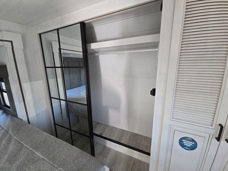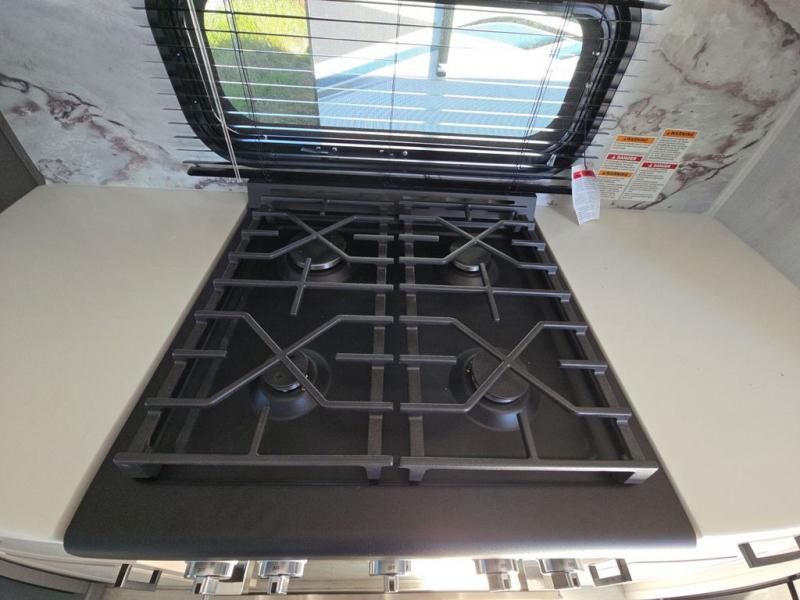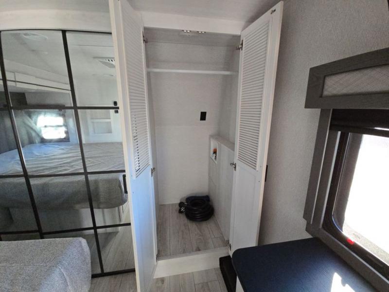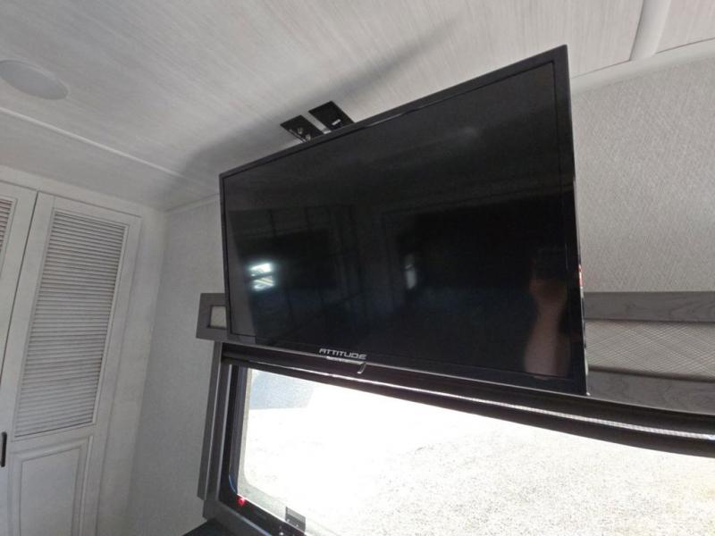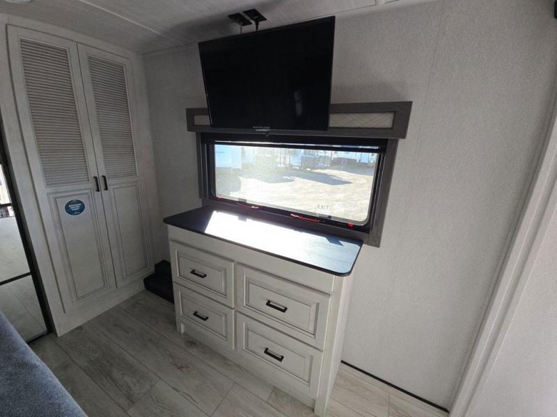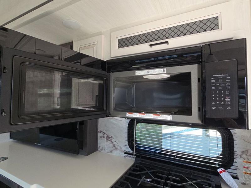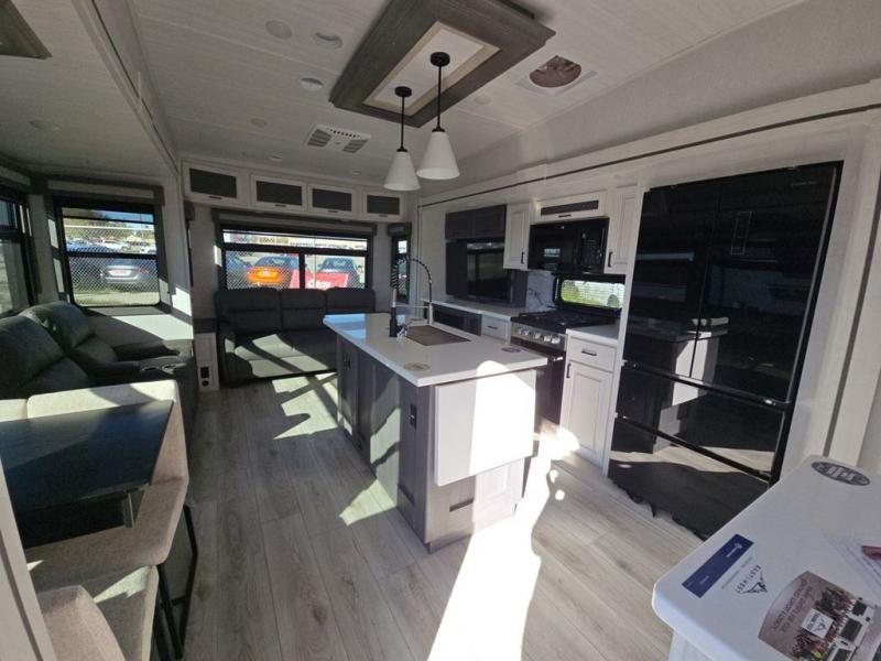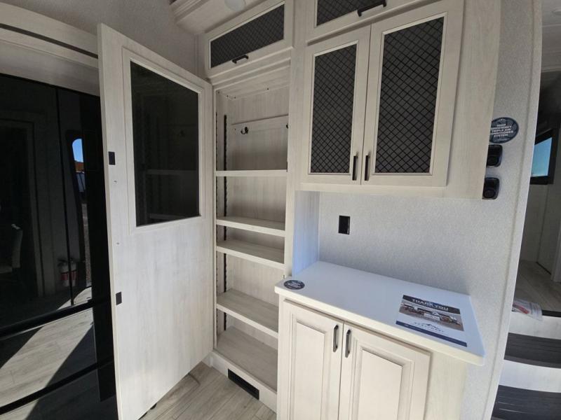 There isn't a thing you won't love about this Ahara fifth wheel! It offers you an excellent master suite that has a king bed slide with drawers under the bed, a dresser across from the bed for adding a TV, a closet with washer/dryer prep, and a large closet with sliding doors for your clothes. The kitchen is also quite amazing with its pantry, hutch, 16-cubic foot 12V refrigerator, four-burner range, 30" microwave, residential LED pendant lights, roll-up stainless steel drying rack, and kitchen island with countertop extensions. As you sit back on the theater seating or 78" sofa, you'll be kept warm by the 5,100 BTU electric fireplace below the TV, and you can also sit in one of the chairs at the free-standing dinette if you need to work on the computer.