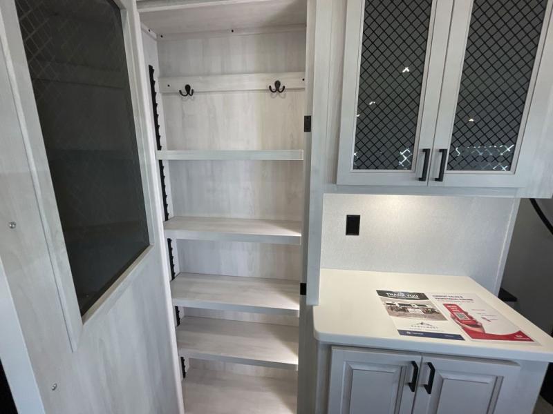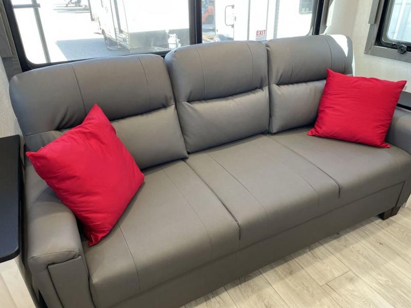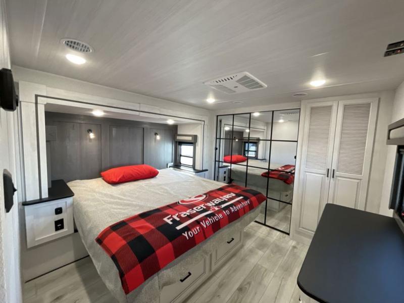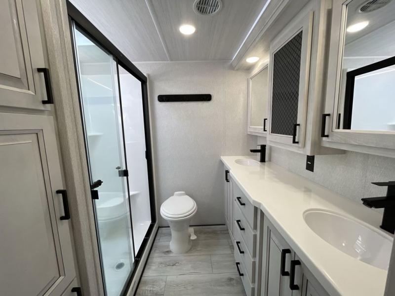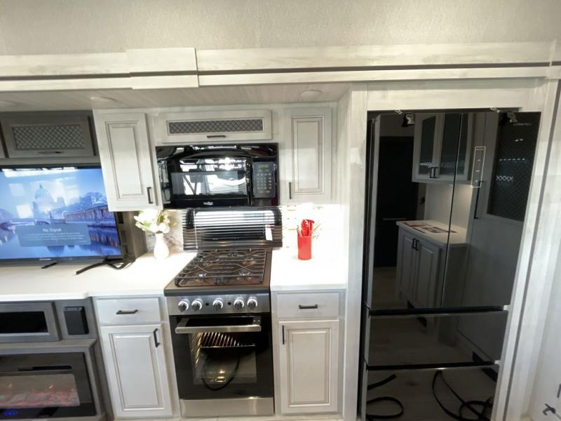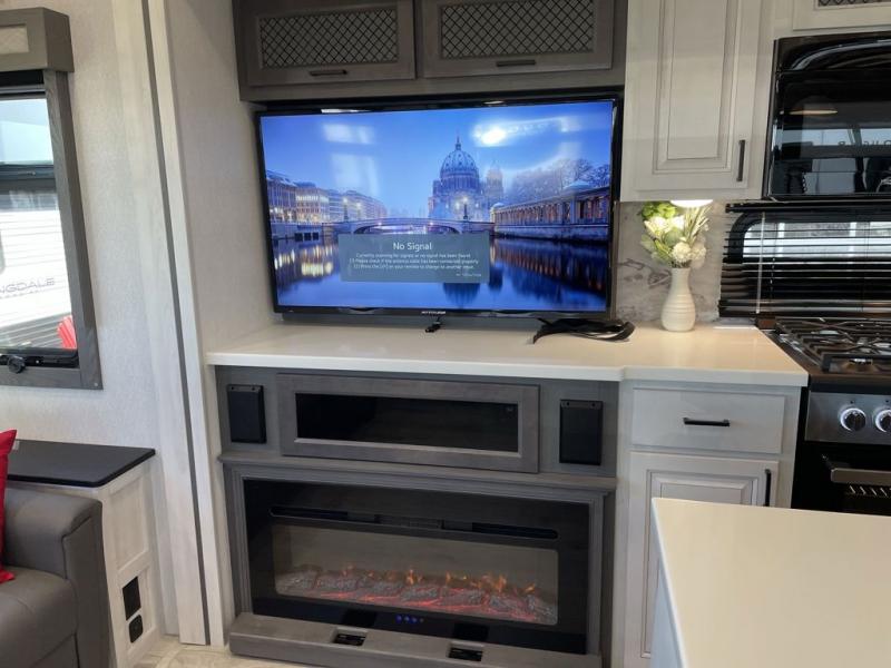 Besides the dimensions and the weights, the only real difference between this Ahara fifth wheel and model 325RL is the bedroom and bathroom configuration. This model offers you a private bedroom that has a king bed slide with drawers under the bed, a sliding dresser top with hidden storage across from the bed for adding a TV, a closet with washer/dryer prep, and a large closet with sliding doors for your clothes. The full bathroom is located right next to the bedroom, but it is separate from the bedroom so that it can offer you a dual-sink vanity which is helpful because it allows two people to wash their face and brush their teeth at the same time. The kitchen is quite amazing with its kitchen island with countertop extensions, pantry and hutch, 16-cubic foot 12V refrigerator, and 24" residential oven. As you sit back on the theater seating or 78" sofa, you'll be kept warm by the 5,100 BTU electric fireplace below the TV.
