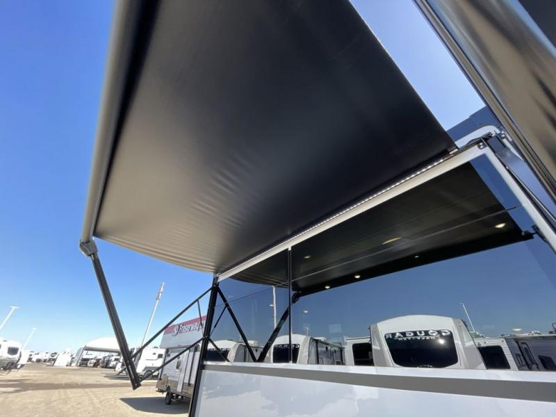 There is just too much luxury to name on the EAST TO WEST Ahara fifth wheel! These units are quite impressive, and once you see them, you'll know what we mean. The Ahara first grabs your attention with its hi-gloss gel-coated fiberglass exterior which showcases two power awnings with LED lights, an LP quick connect, an exterior cable/satellite hookup, and a universal all-in-one docking station. For towing, you'll find a MORryde CRE 3000 suspension, Dexter Gladiator thick-wall 7,000-LB axles with Nev-R-Adjust brakes, and preparations for a rearview camera. Traveling during all seasons is also made easy with the high-efficiency triple A/C system, a 40,000 BTU high-capacity furnace, a heated, insulated, and enclosed underbelly and dump valves with circulating heat, and Radiant Technology Composites insulation in the roof, front cap, and underbelly.