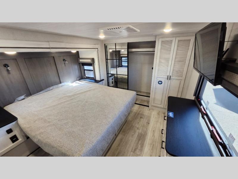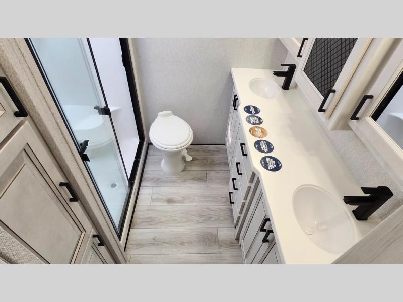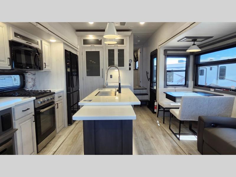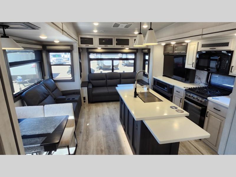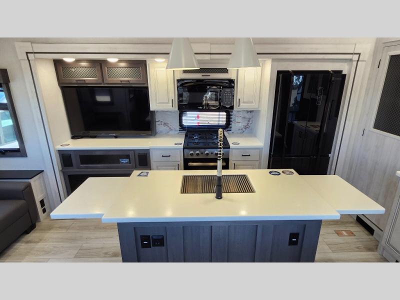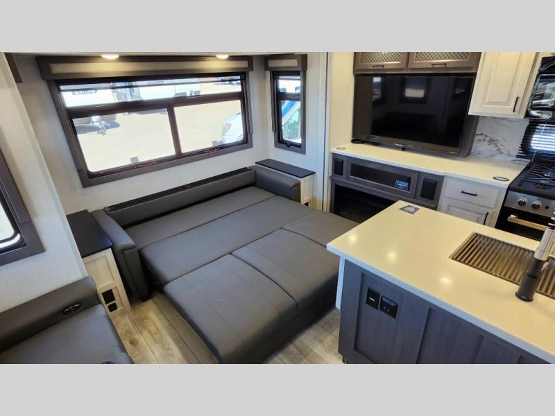 Besides the dimensions and the weights, the only real difference between this Ahara fifth wheel and model 325RL is the bedroom and bathroom configuration. This model offers you a private bedroom that has a king bed slide with drawers under the bed, a sliding dresser top with hidden storage across from the bed for adding a TV, a closet with washer/dryer prep, and a large closet with sliding doors for your clothes. The full bathroom is located right next to the bedroom, but it is separate from the bedroom so that it can offer you a dual-sink vanity which is helpful because it allows two people to wash their face and brush their teeth at the same time. The kitchen is quite amazing with its kitchen island with countertop extensions, pantry and hutch, 16-cubic foot 12V refrigerator, and 24" residential oven. As you sit back on the theater seating or 78" sofa, you'll be kept warm by the 5,100 BTU electric fireplace below the TV.
