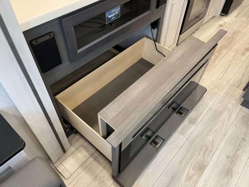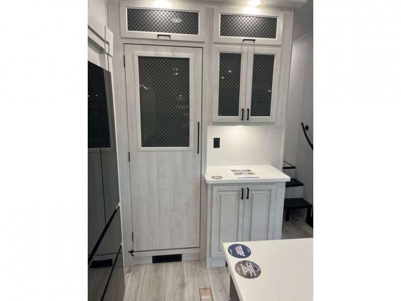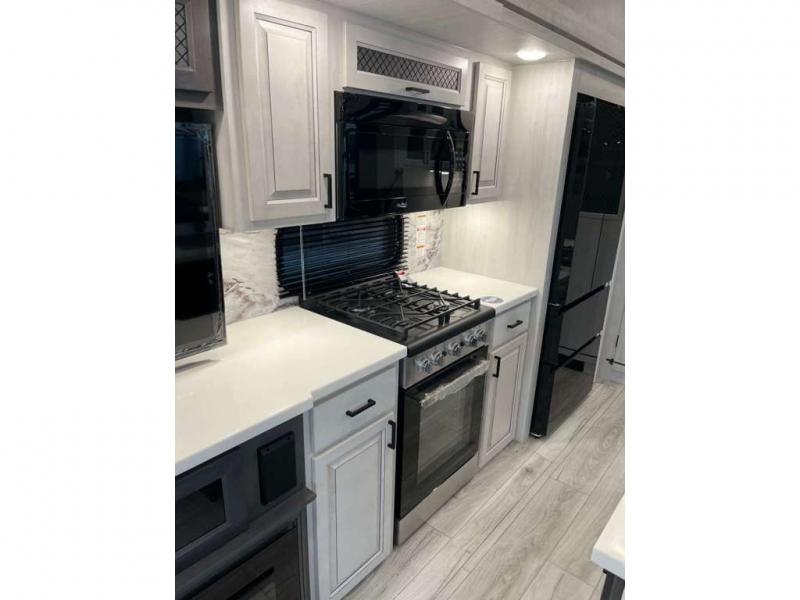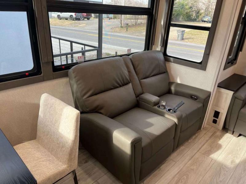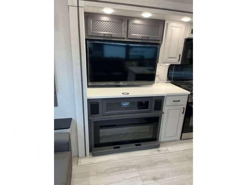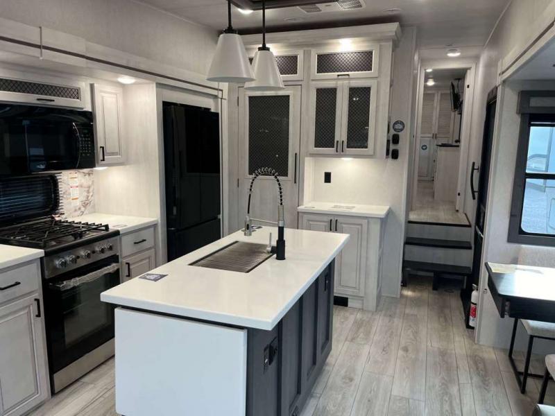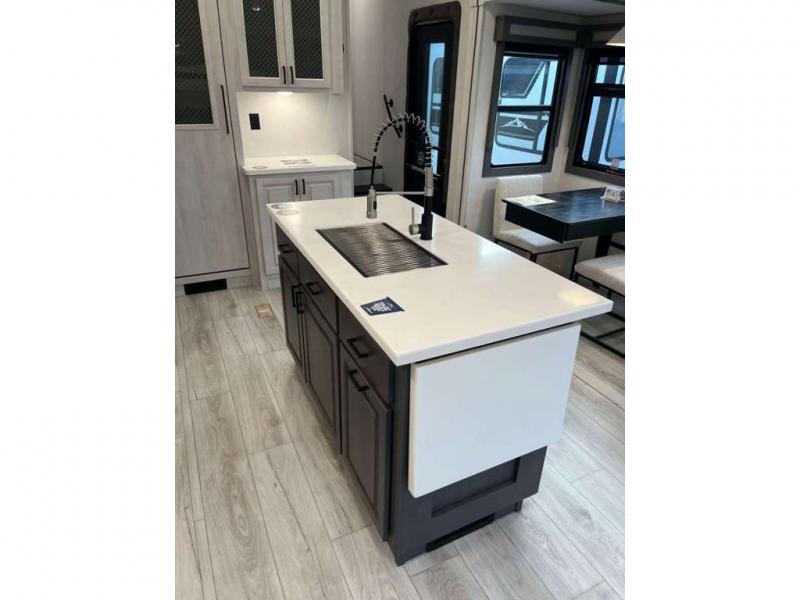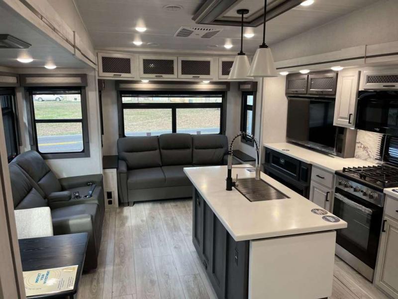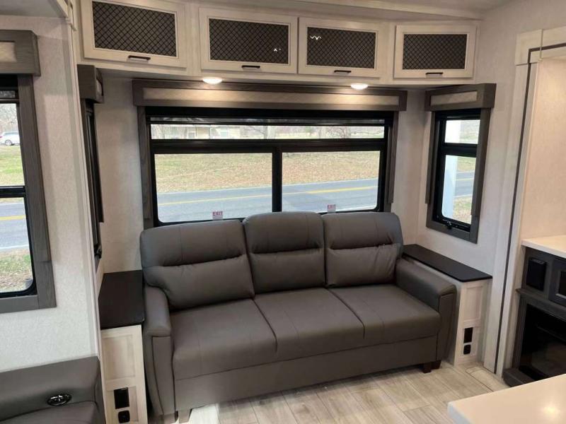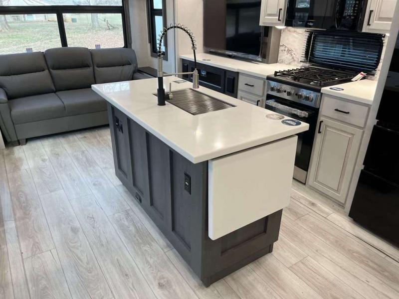 Besides the dimensions and the weights, the only real difference between this Ahara fifth wheel and model 325RL is the bedroom and bathroom configuration. This model offers you a private bedroom that has a king bed slide with drawers under the bed, a sliding dresser top with hidden storage across from the bed for adding a TV, a closet with washer/dryer prep, and a large closet with sliding doors for your clothes. The full bathroom is located right next to the bedroom, but it is separate from the bedroom so that it can offer you a dual-sink vanity which is helpful because it allows two people to wash their face and brush their teeth at the same time. The kitchen is quite amazing with its kitchen island with countertop extensions, pantry and hutch, 16-cubic foot 12V refrigerator, and 24" residential oven. As you sit back on the theater seating or 78" sofa, you'll be kept warm by the 5,100 BTU electric fireplace below the TV.