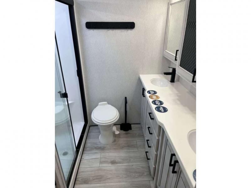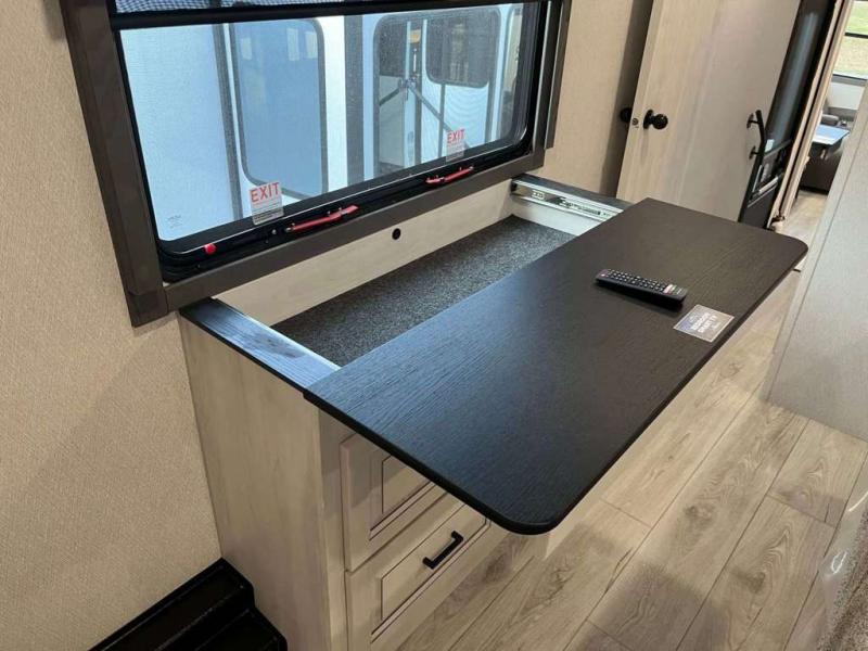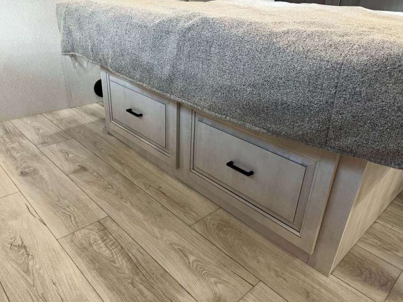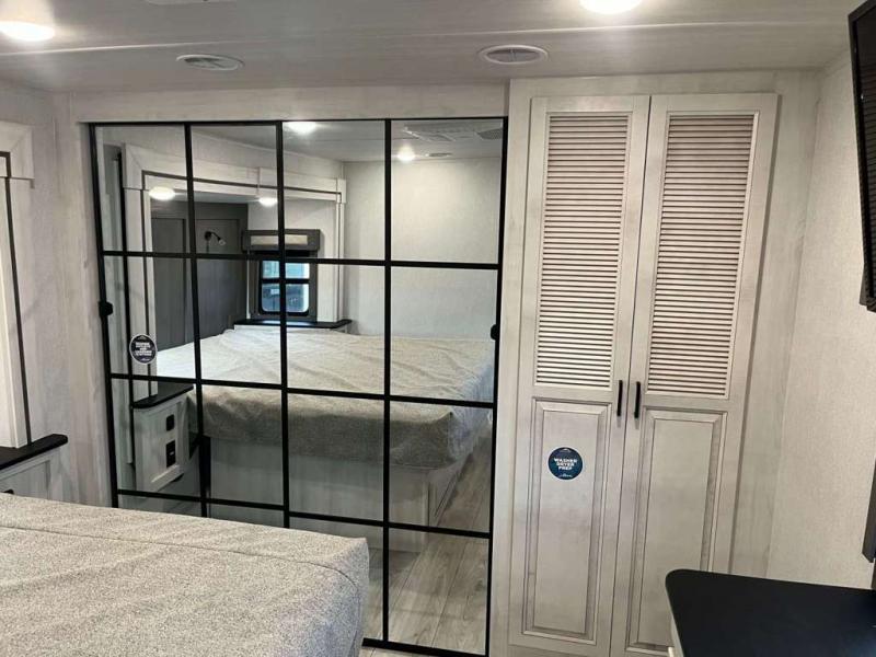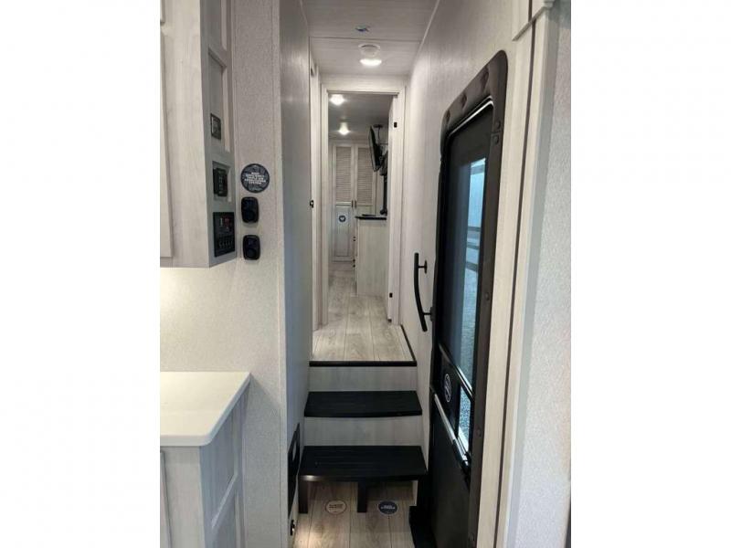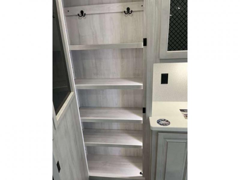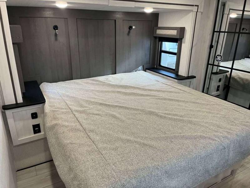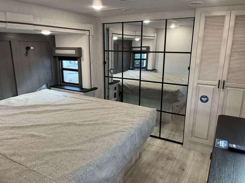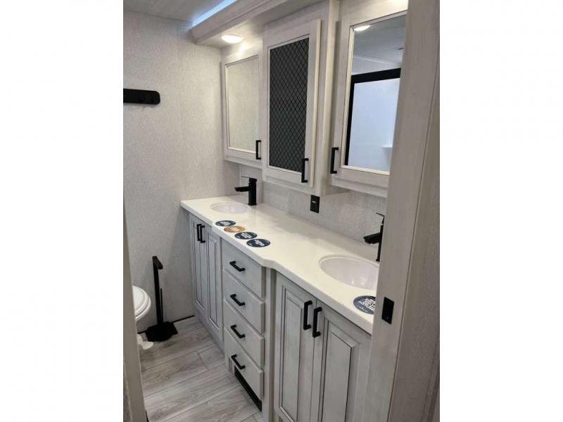 Besides the dimensions and the weights, the only real difference between this Ahara fifth wheel and model 325RL is the bedroom and bathroom configuration. This model offers you a private bedroom that has a king bed slide with drawers under the bed, a sliding dresser top with hidden storage across from the bed for adding a TV, a closet with washer/dryer prep, and a large closet with sliding doors for your clothes. The full bathroom is located right next to the bedroom, but it is separate from the bedroom so that it can offer you a dual-sink vanity which is helpful because it allows two people to wash their face and brush their teeth at the same time. The kitchen is quite amazing with its kitchen island with countertop extensions, pantry and hutch, 16-cubic foot 12V refrigerator, and 24" residential oven. As you sit back on the theater seating or 78" sofa, you'll be kept warm by the 5,100 BTU electric fireplace below the TV.