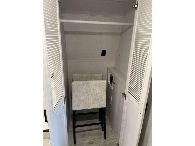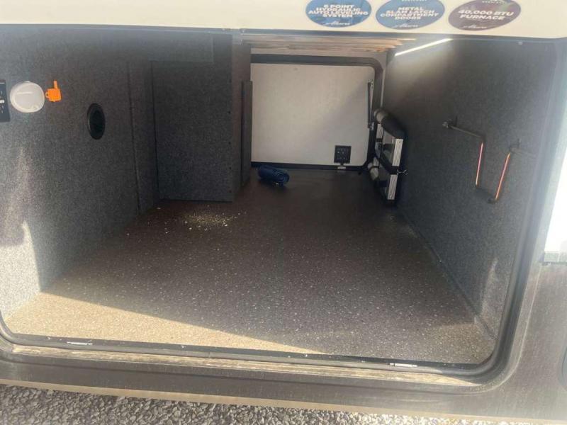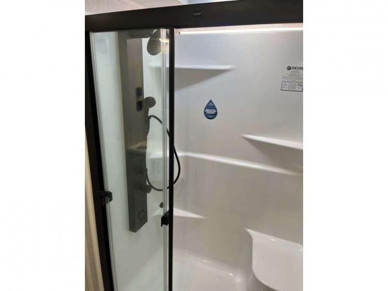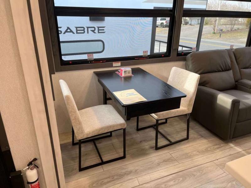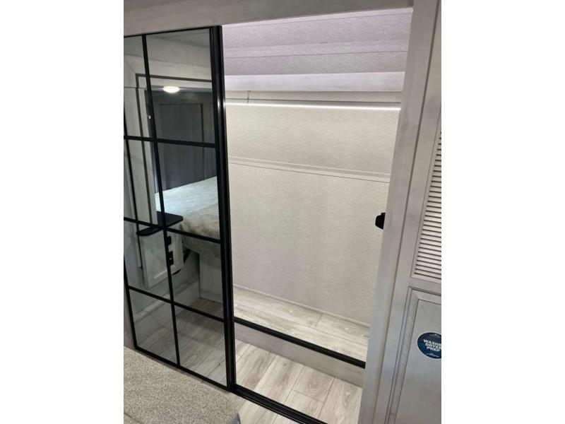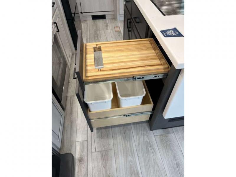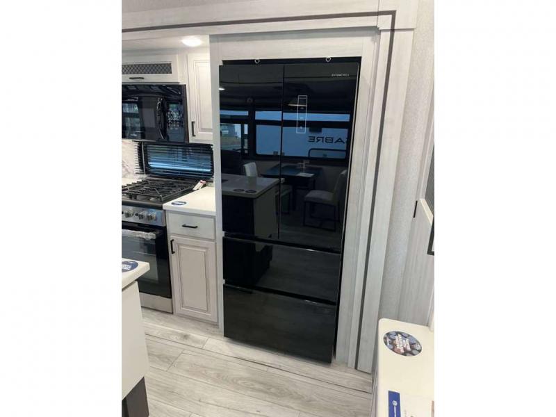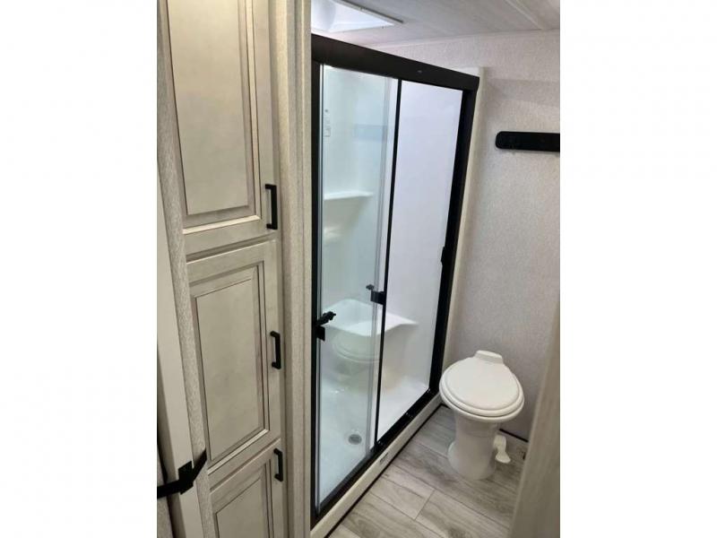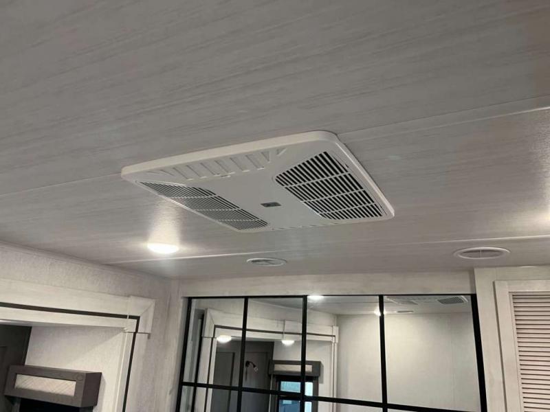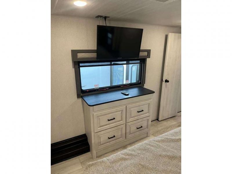 Besides the dimensions and the weights, the only real difference between this Ahara fifth wheel and model 325RL is the bedroom and bathroom configuration. This model offers you a private bedroom that has a king bed slide with drawers under the bed, a sliding dresser top with hidden storage across from the bed for adding a TV, a closet with washer/dryer prep, and a large closet with sliding doors for your clothes. The full bathroom is located right next to the bedroom, but it is separate from the bedroom so that it can offer you a dual-sink vanity which is helpful because it allows two people to wash their face and brush their teeth at the same time. The kitchen is quite amazing with its kitchen island with countertop extensions, pantry and hutch, 16-cubic foot 12V refrigerator, and 24" residential oven. As you sit back on the theater seating or 78" sofa, you'll be kept warm by the 5,100 BTU electric fireplace below the TV.