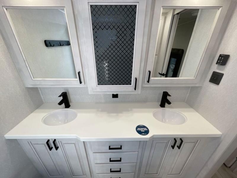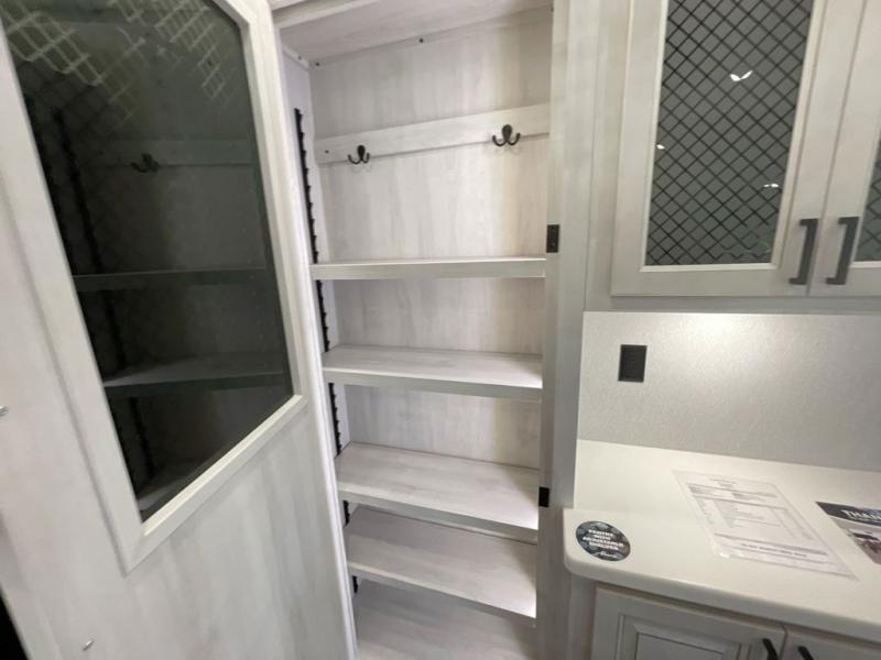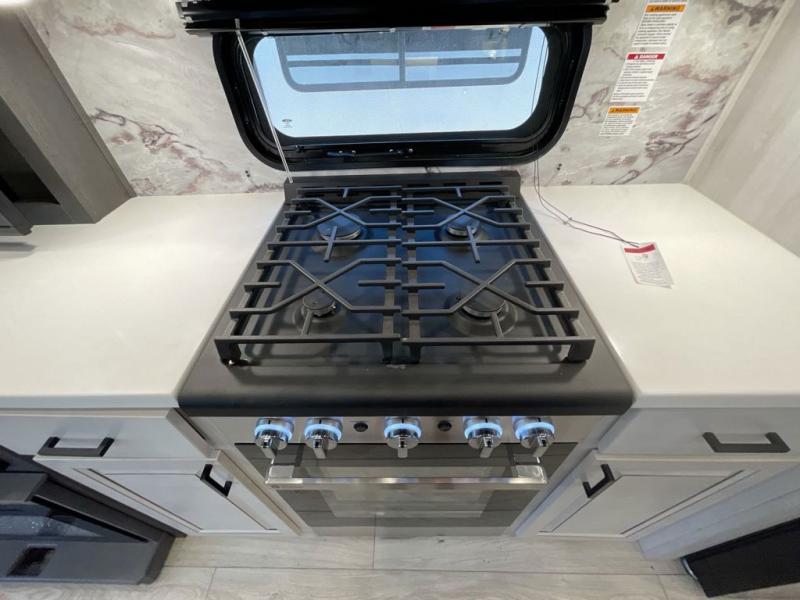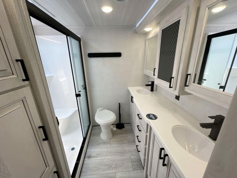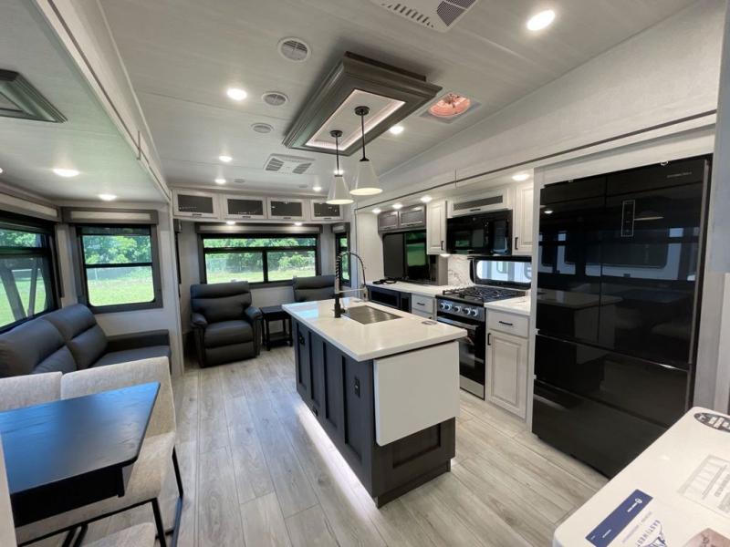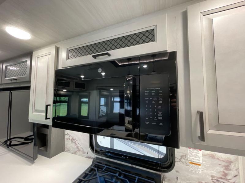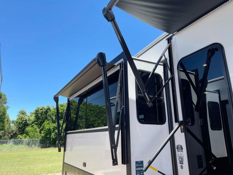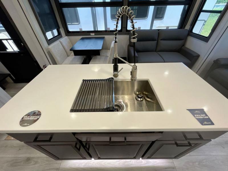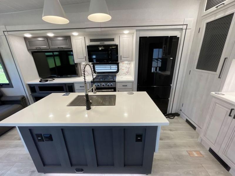 Besides the dimensions and the weights, the only real difference between this Ahara fifth wheel and model 325RL is the bedroom and bathroom configuration. This model offers you a private bedroom that has a king bed slide with drawers under the bed, a sliding dresser top with hidden storage across from the bed for adding a TV, a closet with washer/dryer prep, and a large closet with sliding doors for your clothes. The full bathroom is located right next to the bedroom, but it is separate from the bedroom so that it can offer you a dual-sink vanity which is helpful because it allows two people to wash their face and brush their teeth at the same time. The kitchen is quite amazing with its kitchen island with countertop extensions, pantry and hutch, 16-cubic foot 12V refrigerator, and 24" residential oven. As you sit back on the theater seating or 78" sofa, you'll be kept warm by the 5,100 BTU electric fireplace below the TV.