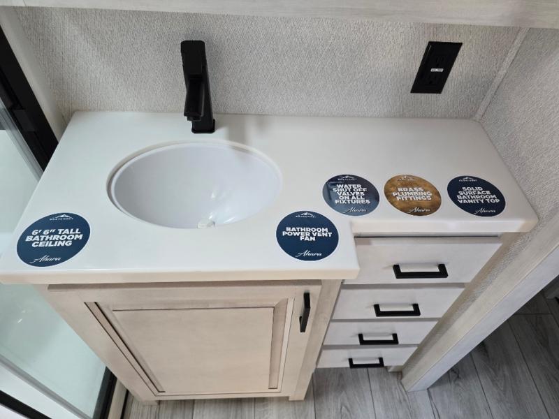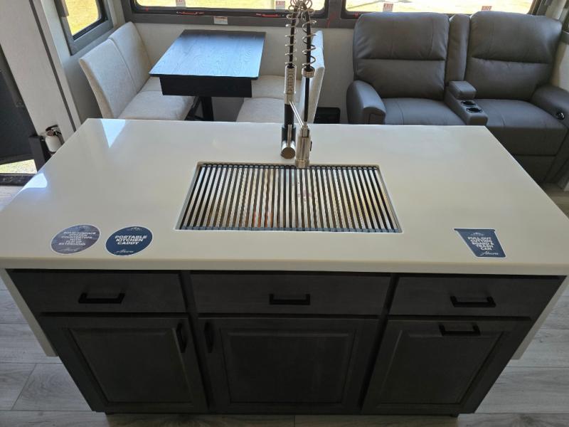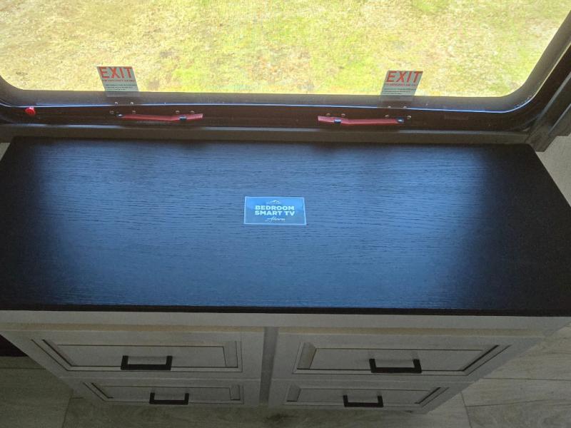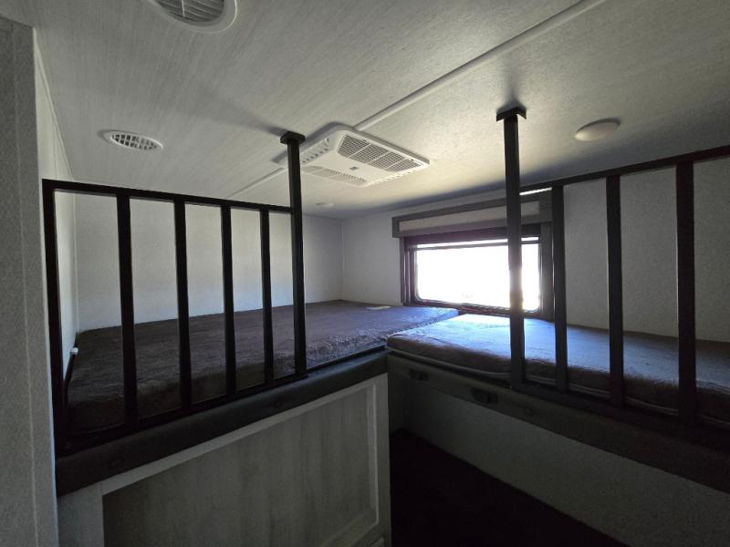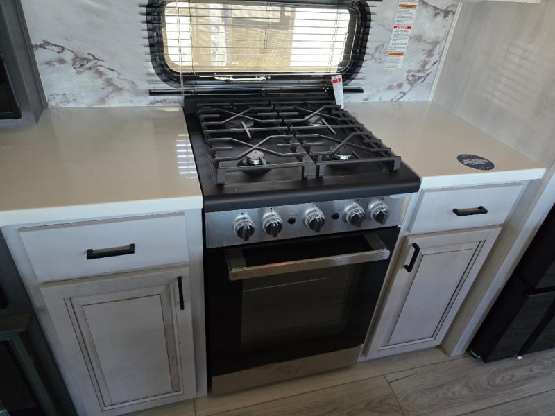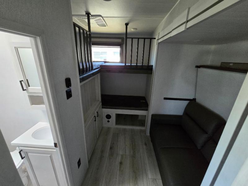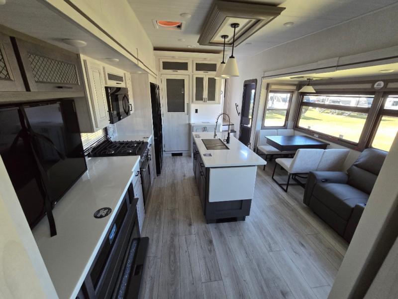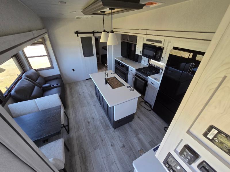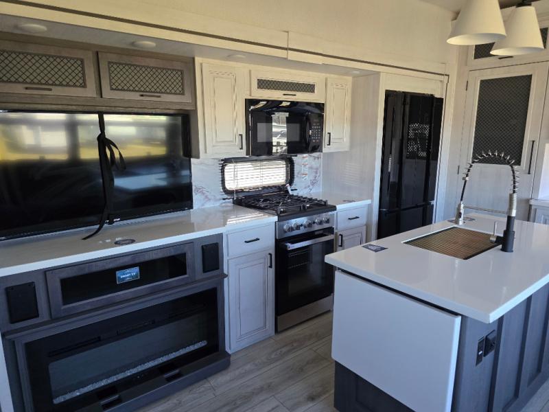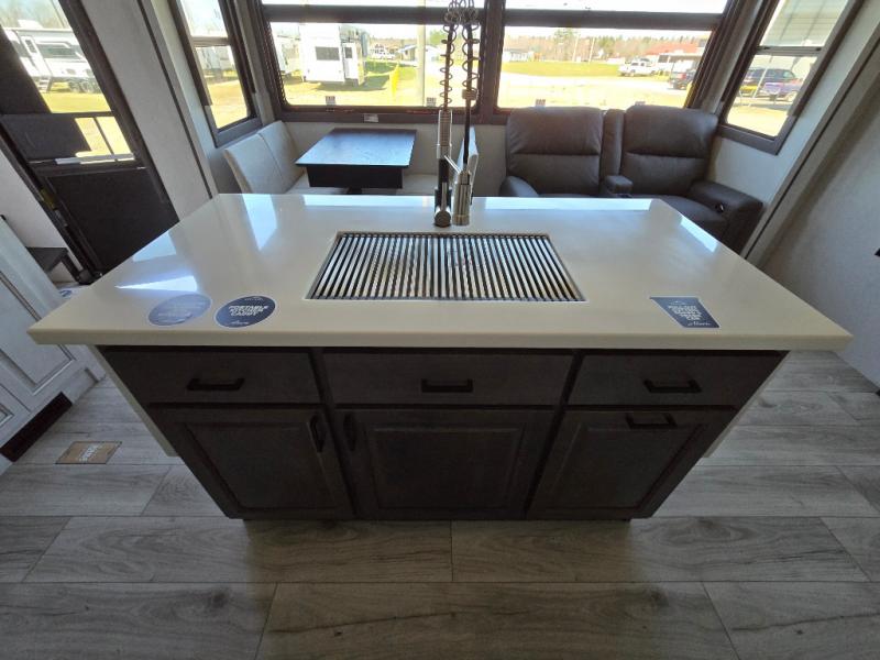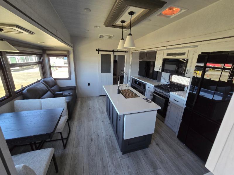This Ahara fifth wheel is the exact answer to your prayers if you need an RV that provides you with a large private sleeping area for many children or guests! The rear bunkhouse suite has a fold-down bunk, EZ-out sofa, a set of 28" bunks, and a 54" x 72" bunk, so it can easily sleep five. Plus, it also has its very own half bathroom which makes it extremely easy for your kids to use the bathroom at night or get ready in the morning, and the second exterior entry door is also included in this space. You'll have your own bedroom to retreat to at the front, and this space includes a king bed slide with drawers under the bed, sliding dresser top with hidden storage and TV, closet to keep clothes tidy, plus a second closet with washer/dryer prep! The chef of your group will love the spacious kitchen with its kitchen island with countertops extensions, a 24" residential oven with a four burner cooktop, a spacious pantry, plus a 16 cu. ft. 12V French door refrigerator with a double drawer freezer.