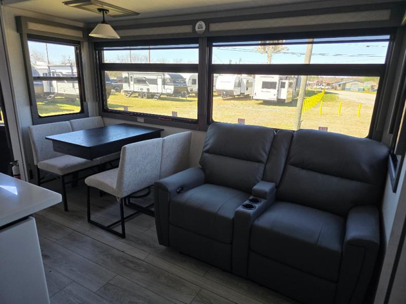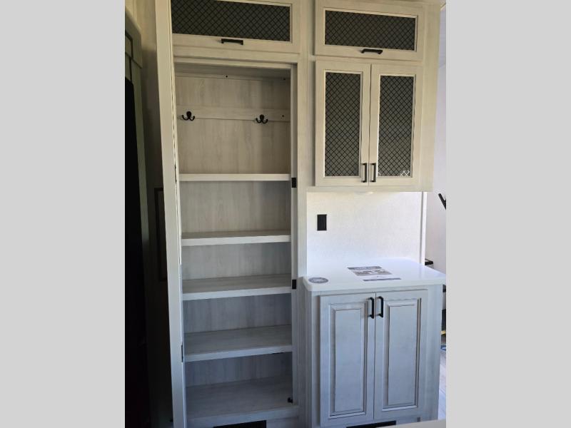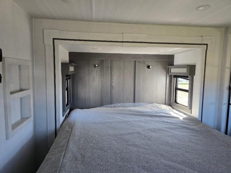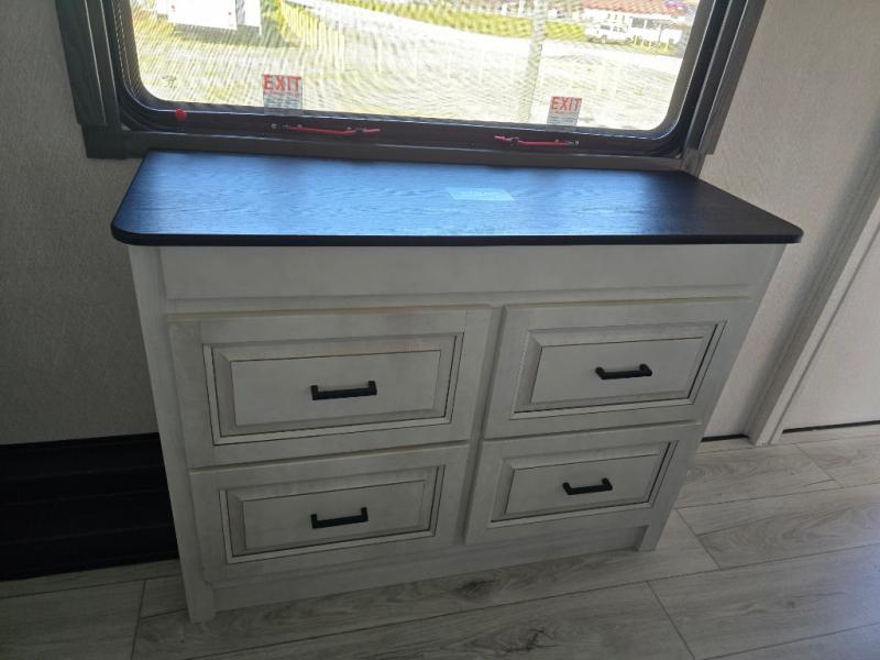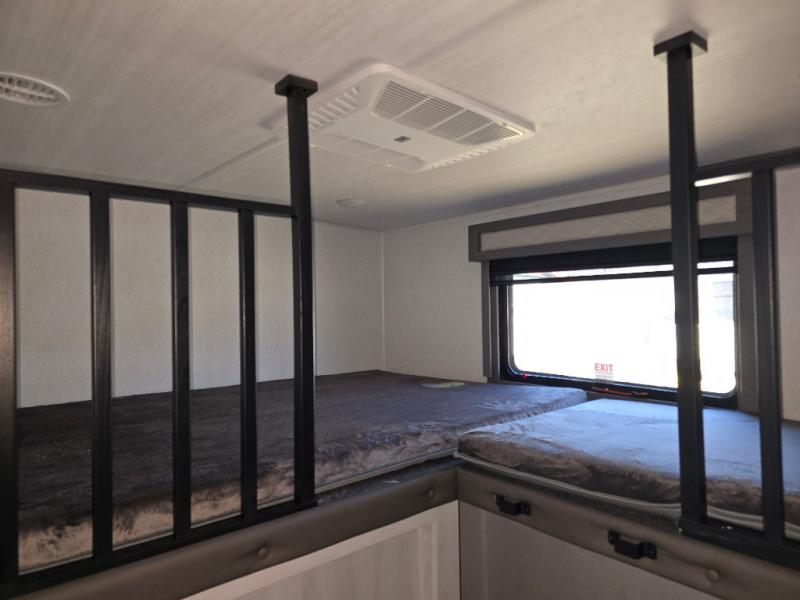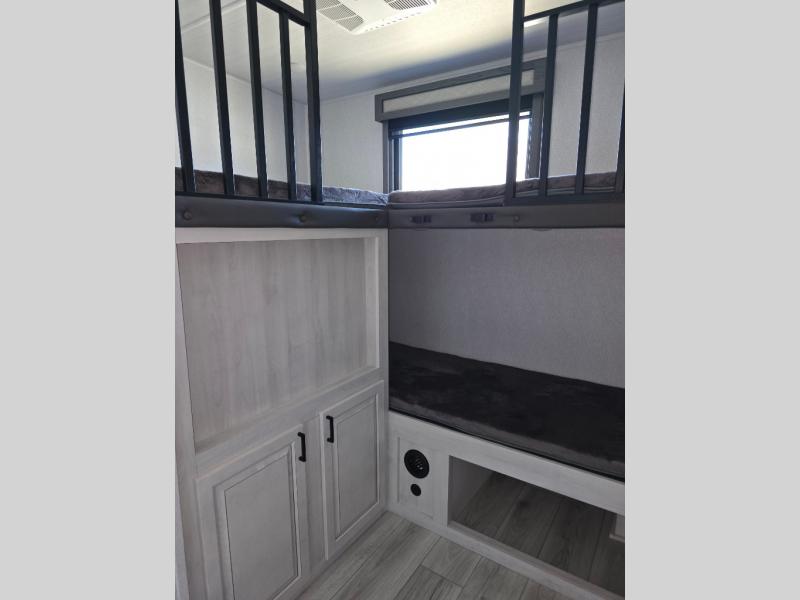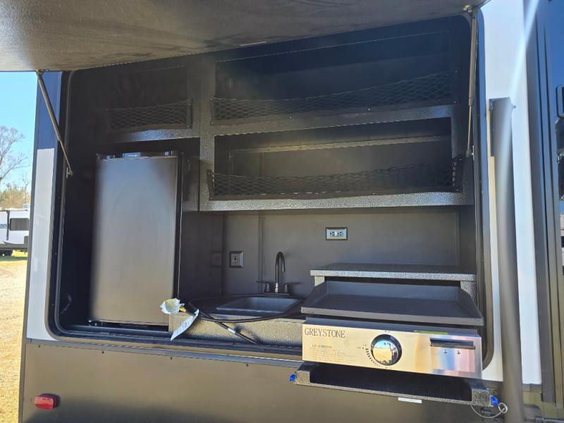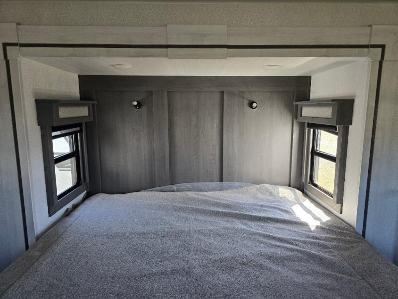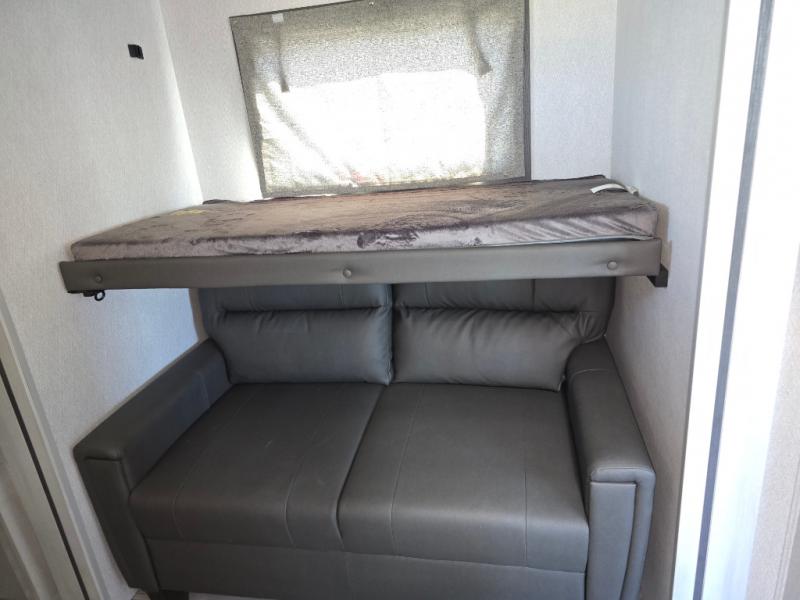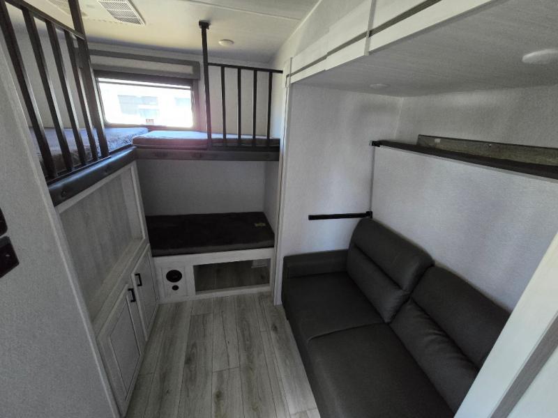 This Ahara fifth wheel is the exact answer to your prayers if you need an RV that provides you with a large private sleeping area for many children or guests! The rear bunkhouse suite has a fold-down bunk, EZ-out sofa, a set of 28" bunks, and a 54" x 72" bunk, so it can easily sleep five. Plus, it also has its very own half bathroom which makes it extremely easy for your kids to use the bathroom at night or get ready in the morning, and the second exterior entry door is also included in this space. You'll have your own bedroom to retreat to at the front, and this space includes a king bed slide with drawers under the bed, sliding dresser top with hidden storage and TV, closet to keep clothes tidy, plus a second closet with washer/dryer prep! The chef of your group will love the spacious kitchen with its kitchen island with countertops extensions, a 24" residential oven with a four burner cooktop, a spacious pantry, plus a 16 cu. ft. 12V French door refrigerator with a double drawer freezer.