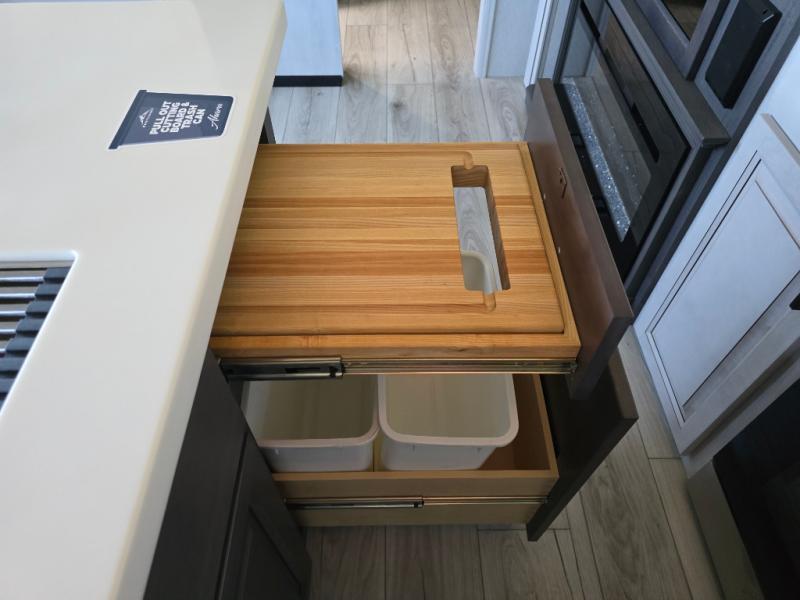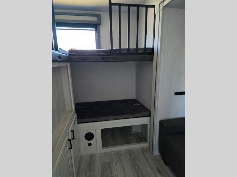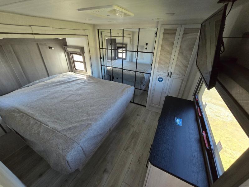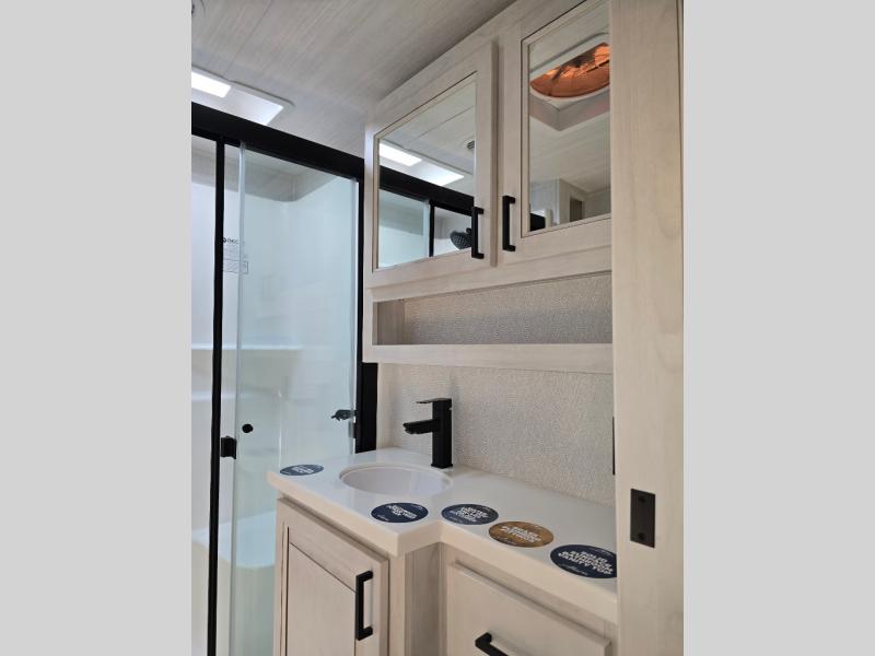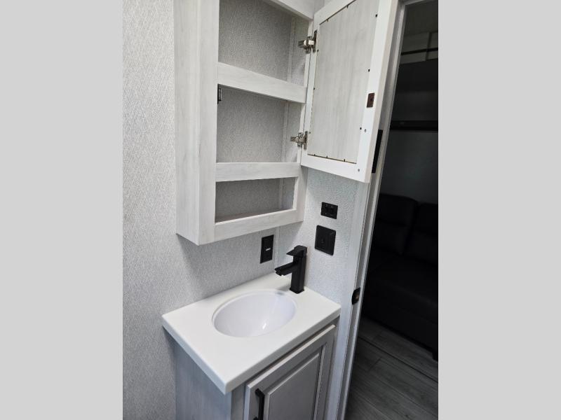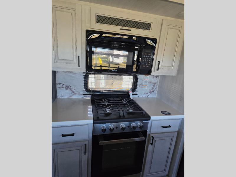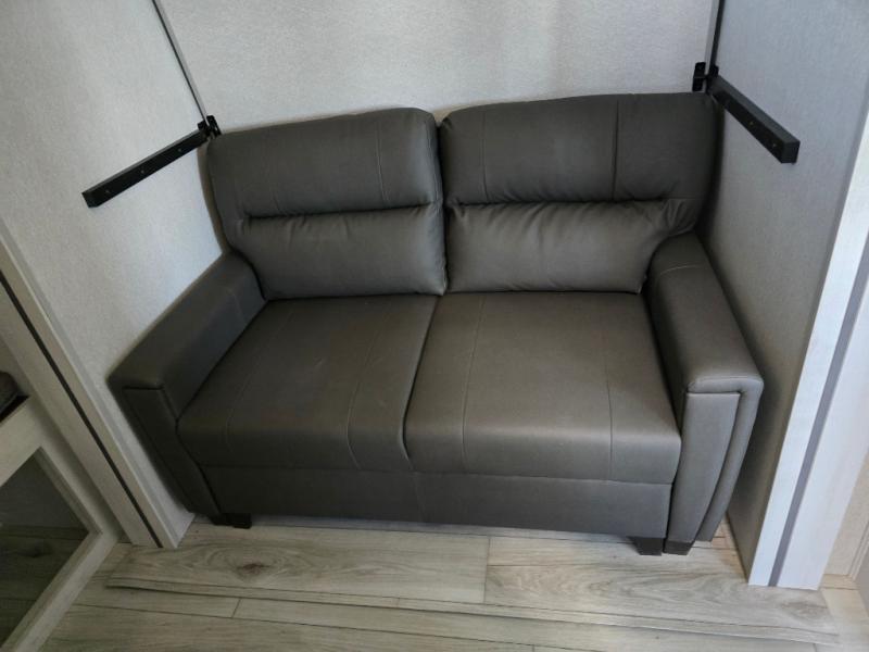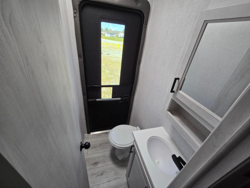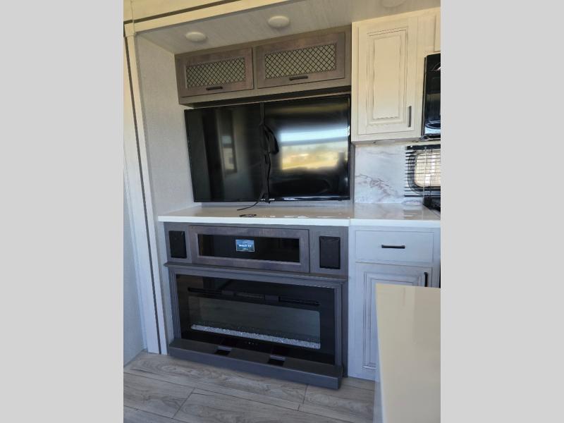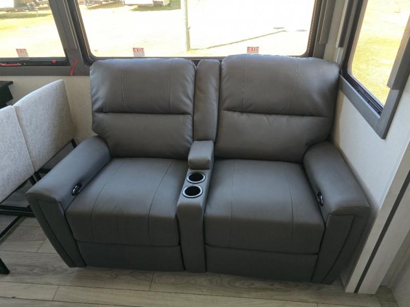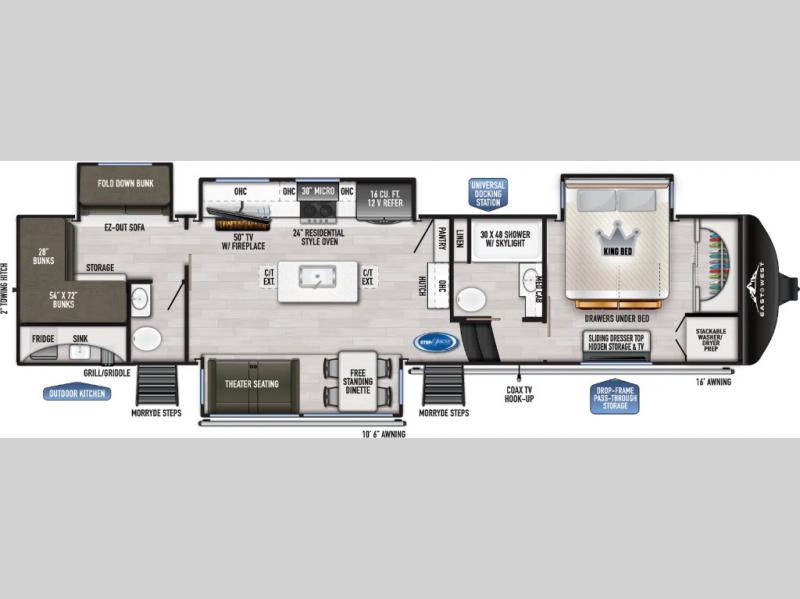This Ahara fifth wheel is the exact answer to your prayers if you need an RV that provides you with a large private sleeping area for many children or guests! The rear bunkhouse suite has a fold-down bunk, EZ-out sofa, a set of 28" bunks, and a 54" x 72" bunk, so it can easily sleep five. Plus, it also has its very own half bathroom which makes it extremely easy for your kids to use the bathroom at night or get ready in the morning, and the second exterior entry door is also included in this space. You'll have your own bedroom to retreat to at the front, and this space includes a king bed slide with drawers under the bed, sliding dresser top with hidden storage and TV, closet to keep clothes tidy, plus a second closet with washer/dryer prep! The chef of your group will love the spacious kitchen with its kitchen island with countertops extensions, a 24" residential oven with a four burner cooktop, a spacious pantry, plus a 16 cu. ft. 12V French door refrigerator with a double drawer freezer.
