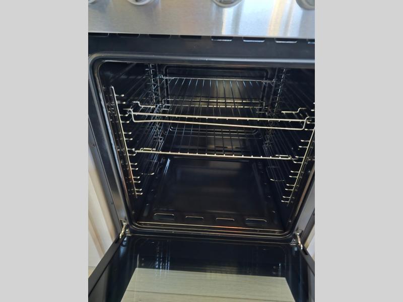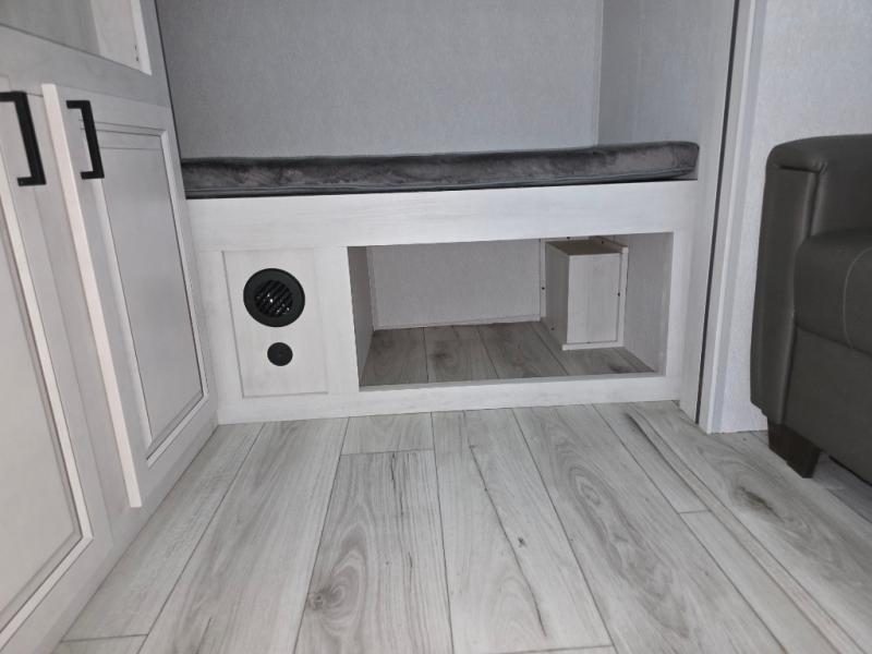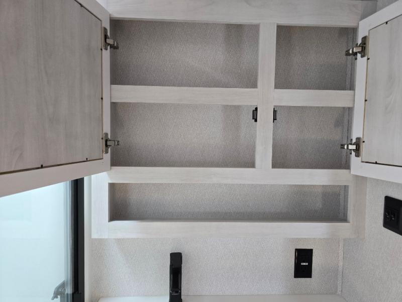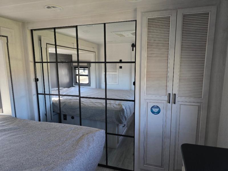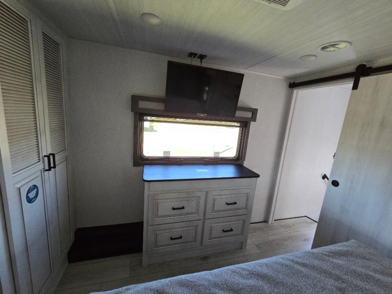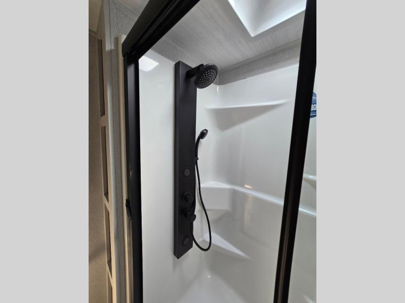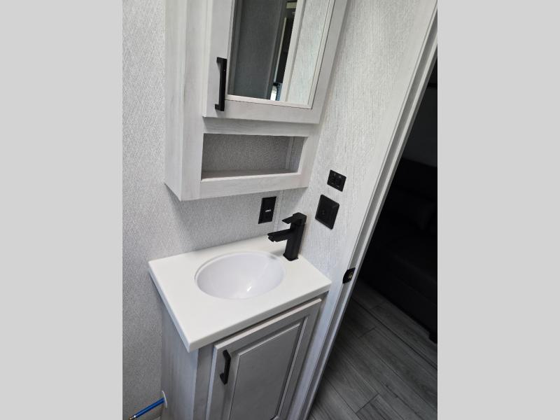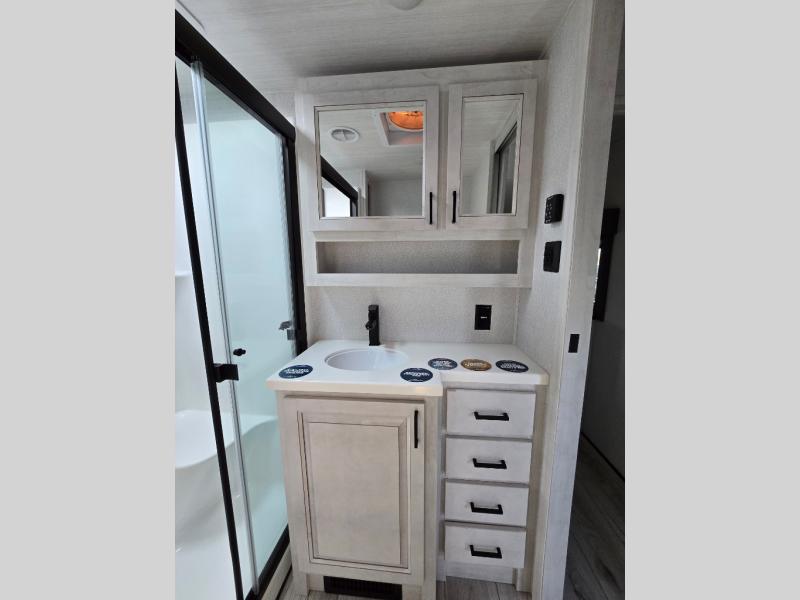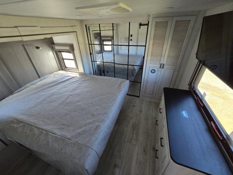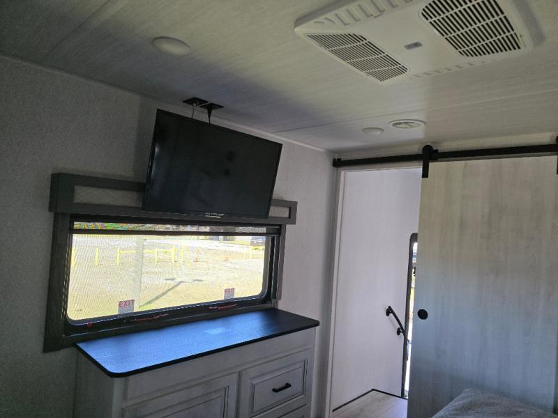 This Ahara fifth wheel is the exact answer to your prayers if you need an RV that provides you with a large private sleeping area for many children or guests! The rear bunkhouse suite has a fold-down bunk, EZ-out sofa, a set of 28" bunks, and a 54" x 72" bunk, so it can easily sleep five. Plus, it also has its very own half bathroom which makes it extremely easy for your kids to use the bathroom at night or get ready in the morning, and the second exterior entry door is also included in this space. You'll have your own bedroom to retreat to at the front, and this space includes a king bed slide with drawers under the bed, sliding dresser top with hidden storage and TV, closet to keep clothes tidy, plus a second closet with washer/dryer prep! The chef of your group will love the spacious kitchen with its kitchen island with countertops extensions, a 24" residential oven with a four burner cooktop, a spacious pantry, plus a 16 cu. ft. 12V French door refrigerator with a double drawer freezer.