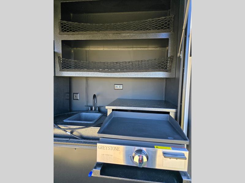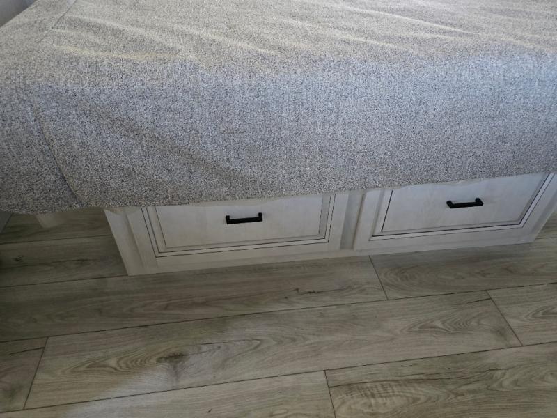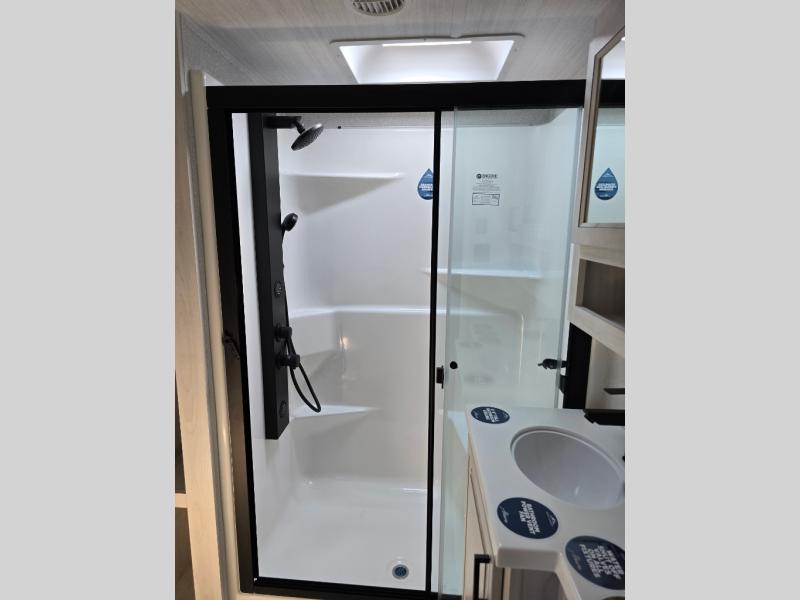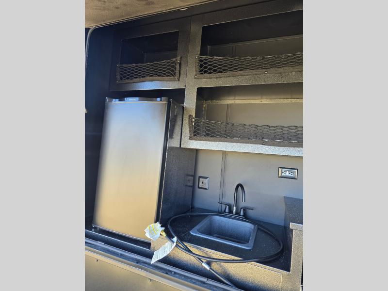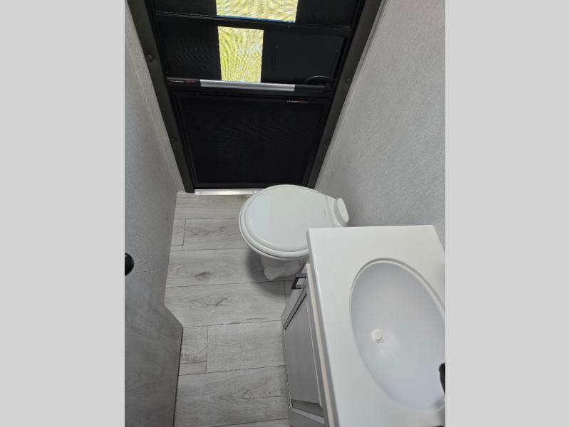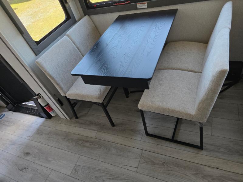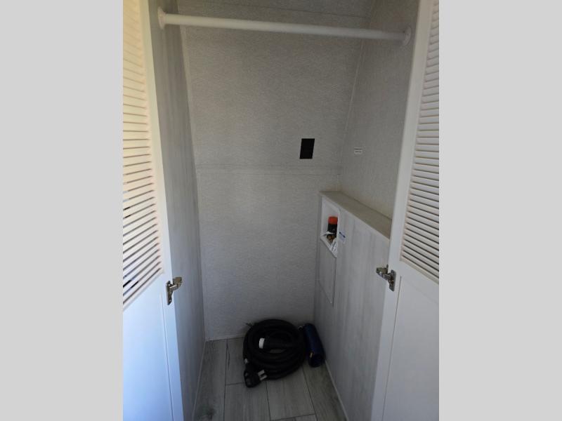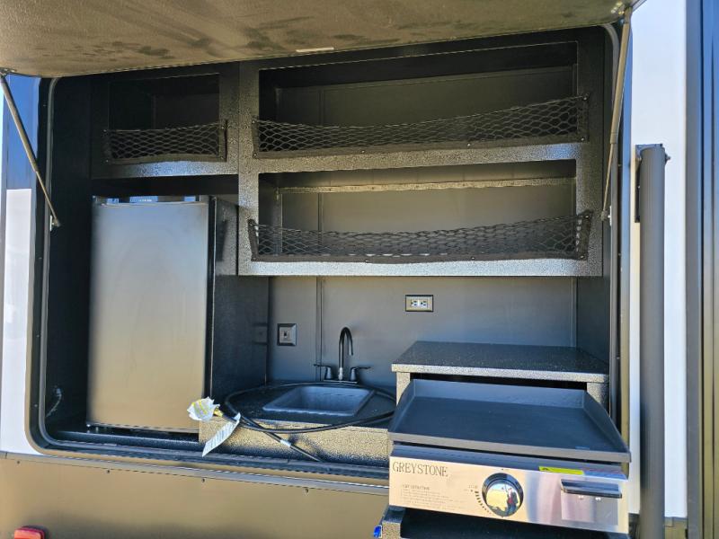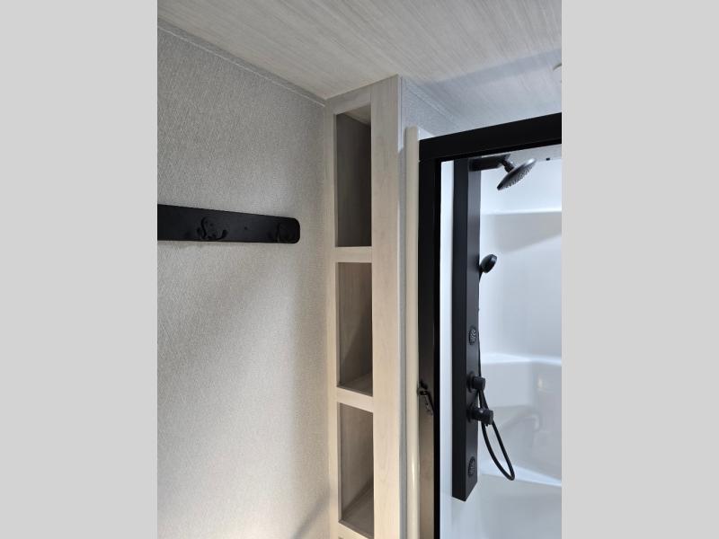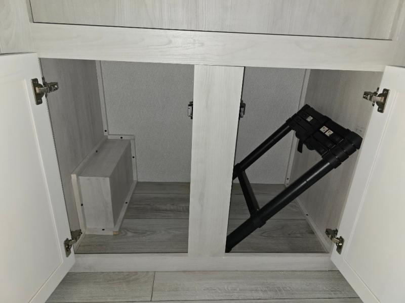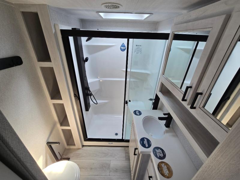 This Ahara fifth wheel is the exact answer to your prayers if you need an RV that provides you with a large private sleeping area for many children or guests! The rear bunkhouse suite has a fold-down bunk, EZ-out sofa, a set of 28" bunks, and a 54" x 72" bunk, so it can easily sleep five. Plus, it also has its very own half bathroom which makes it extremely easy for your kids to use the bathroom at night or get ready in the morning, and the second exterior entry door is also included in this space. You'll have your own bedroom to retreat to at the front, and this space includes a king bed slide with drawers under the bed, sliding dresser top with hidden storage and TV, closet to keep clothes tidy, plus a second closet with washer/dryer prep! The chef of your group will love the spacious kitchen with its kitchen island with countertops extensions, a 24" residential oven with a four burner cooktop, a spacious pantry, plus a 16 cu. ft. 12V French door refrigerator with a double drawer freezer.