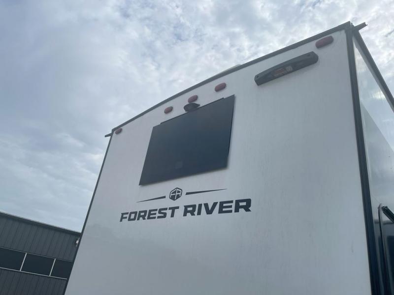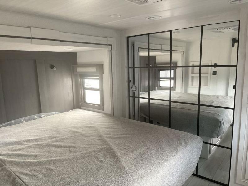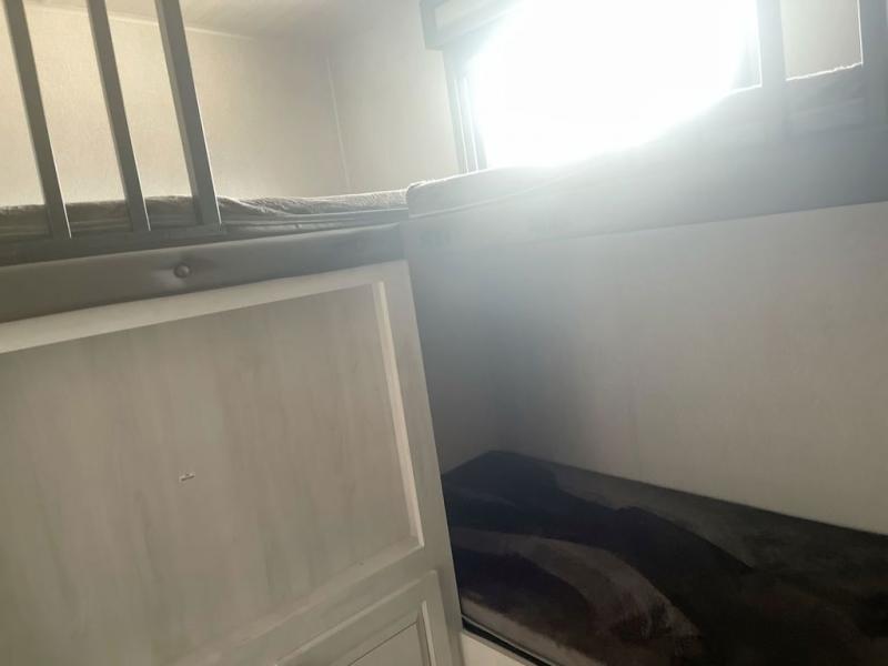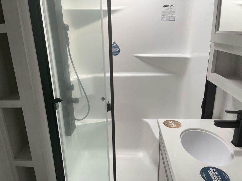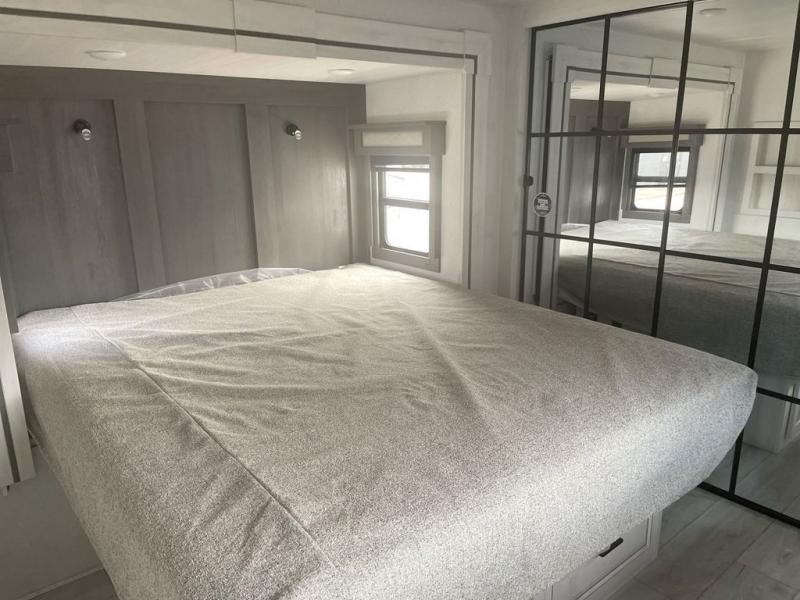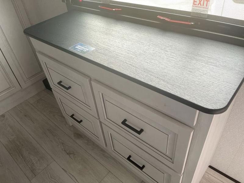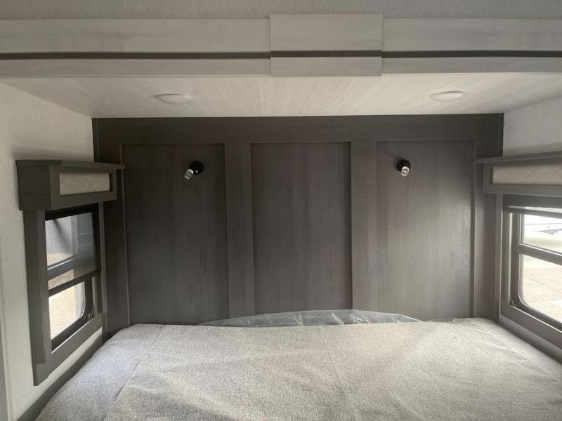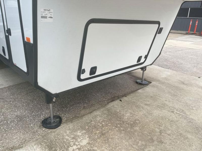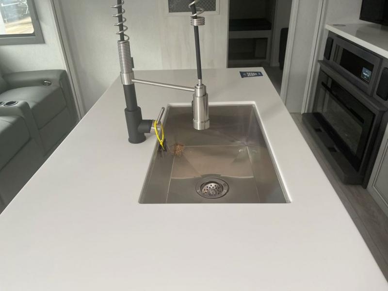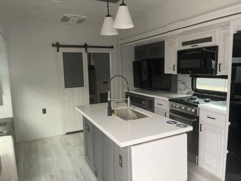This Ahara fifth wheel is the exact answer to your prayers if you need an RV that provides you with a large private sleeping area for many children or guests! The rear bunkhouse suite has a fold-down bunk, EZ-out sofa, a set of 28" bunks, and a 54" x 72" bunk, so it can easily sleep five. Plus, it also has its very own half bathroom which makes it extremely easy for your kids to use the bathroom at night or get ready in the morning, and the second exterior entry door is also included in this space. You'll have your own bedroom to retreat to at the front, and this space includes a king bed slide with drawers under the bed, sliding dresser top with hidden storage and TV, closet to keep clothes tidy, plus a second closet with washer/dryer prep! The chef of your group will love the spacious kitchen with its kitchen island with countertops extensions, a 24" residential oven with a four burner cooktop, a spacious pantry, plus a 16 cu. ft. 12V French door refrigerator with a double drawer freezer.