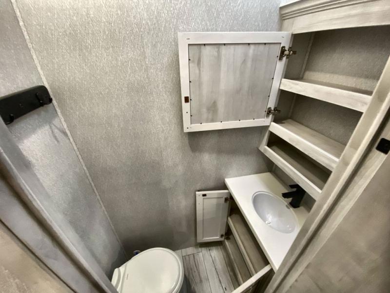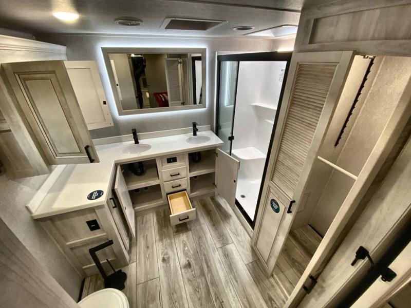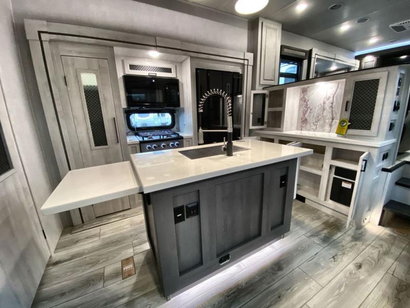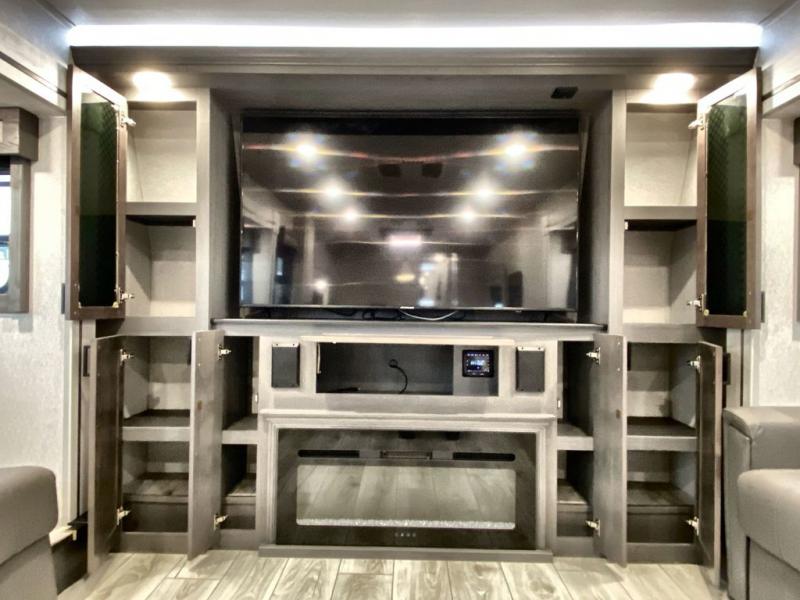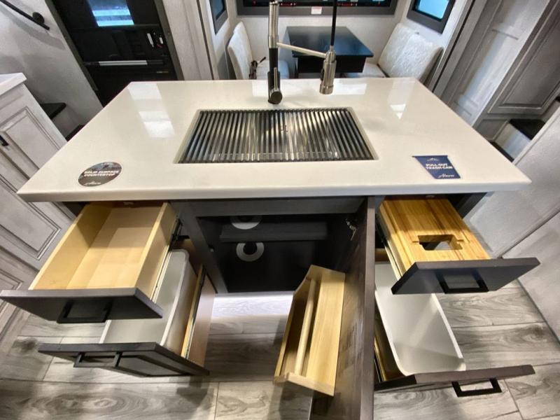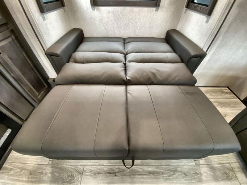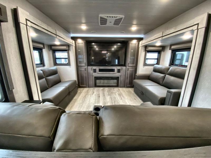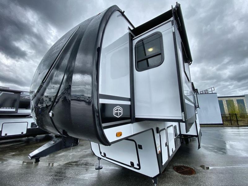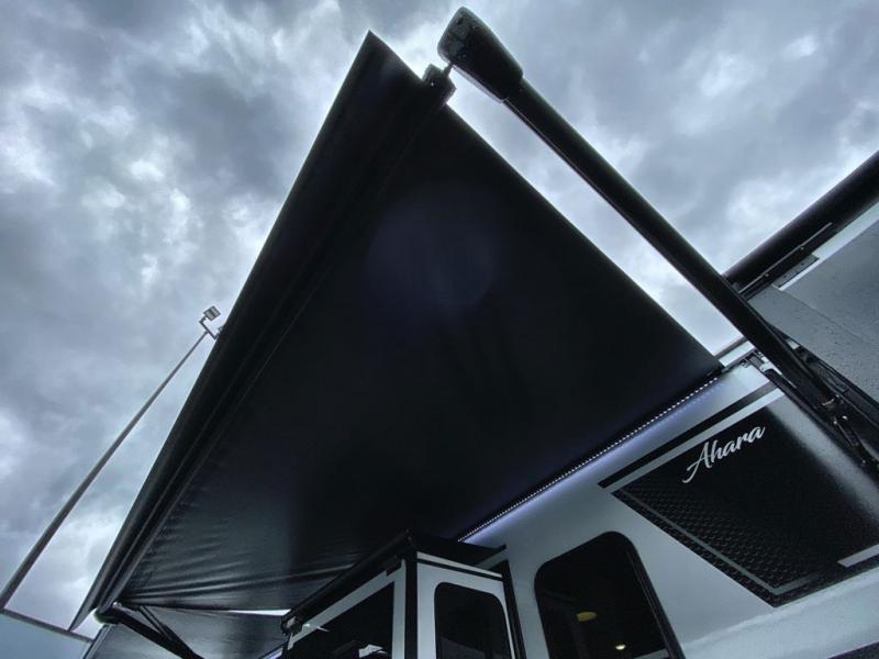If you've been looking for a luxury fifth wheel to call your new home away from home, take a look at this Ahara! The front living area will be a favorite hangout spot with its dual hide-a-bed sofa, theater seating, and 65" TV with a fireplace. And since there are dual opposing slides here, your guests will have plenty of space to fold down the sofas at night for a great night's rest. If you're looking for your bedroom, head to the back and you'll enjoy a king bed slide out, a dresser with TV, two closets, plus your own full rear bath. The dual bath sinks are sure to come in handy when you're both getting ready for bed, and the spacious shower with a skylight will provide natural light as you clean up in the morning. There is even a closet with washer and dryer prep if you plan to go full-time. In the morning you can prepare breakfast on the four burner cooktop or in the 30" over-the-range residential microwave, and the 16 cu. ft. 12V French door refrigerator includes a double drawer freezer to hold more food. There is a free-standing dinette, a hutch to store nice dishes, and the half bath is located off of this room for convenience!