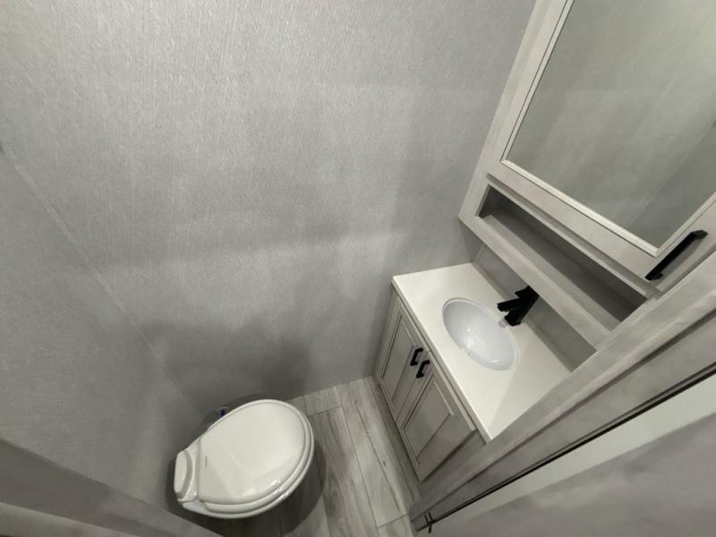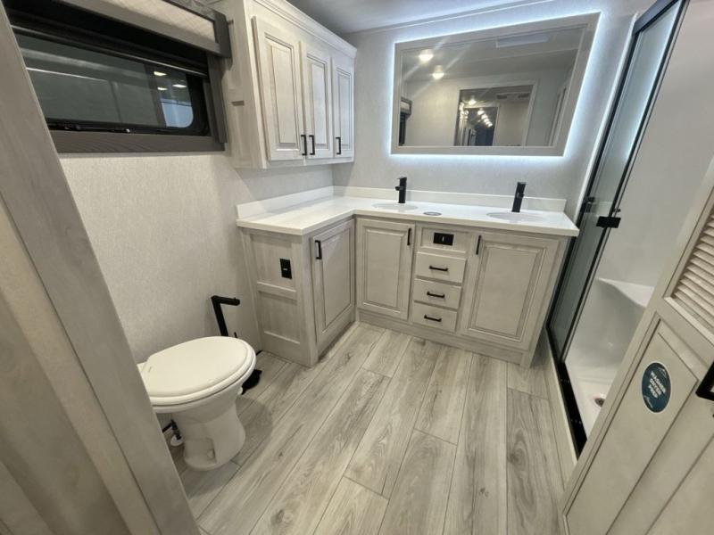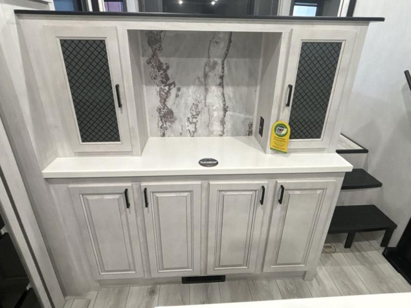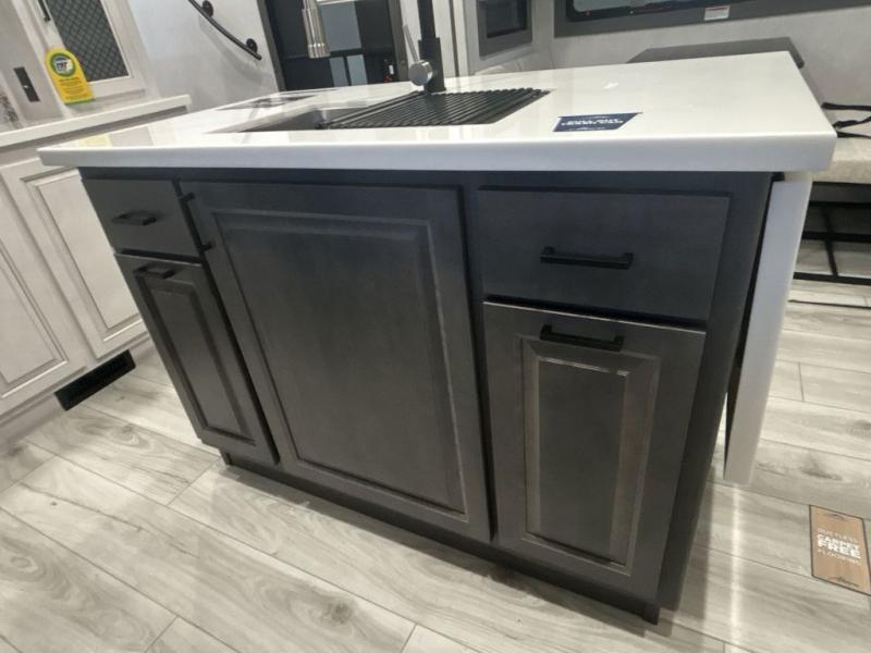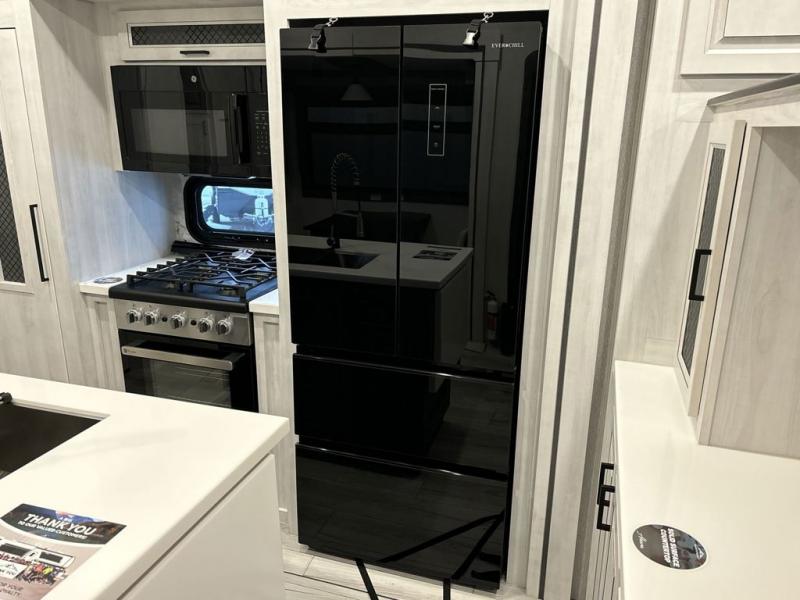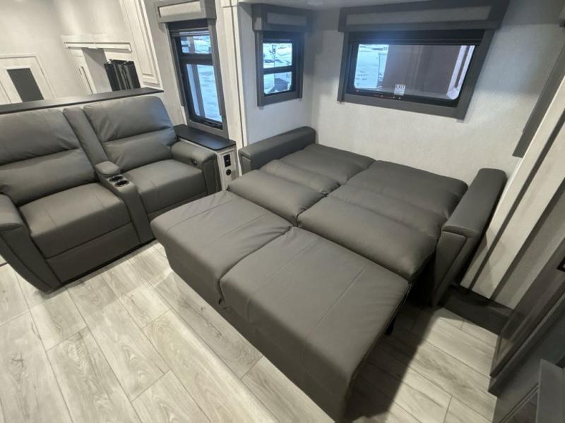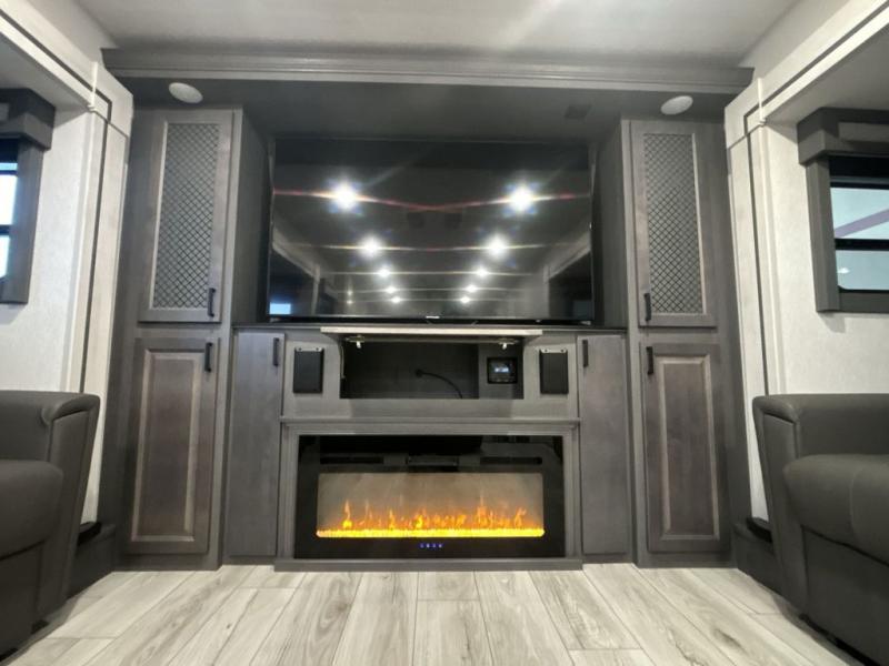 If you've been looking for a luxury fifth wheel to call your new home away from home, take a look at this Ahara! The front living area will be a favorite hangout spot with its dual hide-a-bed sofa, theater seating, and 65" TV with a fireplace. And since there are dual opposing slides here, your guests will have plenty of space to fold down the sofas at night for a great night's rest. If you're looking for your bedroom, head to the back and you'll enjoy a king bed slide out, a dresser with TV, two closets, plus your own full rear bath. The dual bath sinks are sure to come in handy when you're both getting ready for bed, and the spacious shower with a skylight will provide natural light as you clean up in the morning. There is even a closet with washer and dryer prep if you plan to go full-time. In the morning you can prepare breakfast on the four burner cooktop or in the 30" over-the-range residential microwave, and the 16 cu. ft. 12V French door refrigerator includes a double drawer freezer to hold more food. There is a free-standing dinette, a hutch to store nice dishes, and the half bath is located off of this room for convenience!