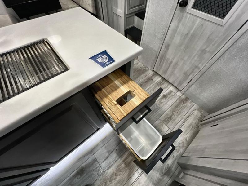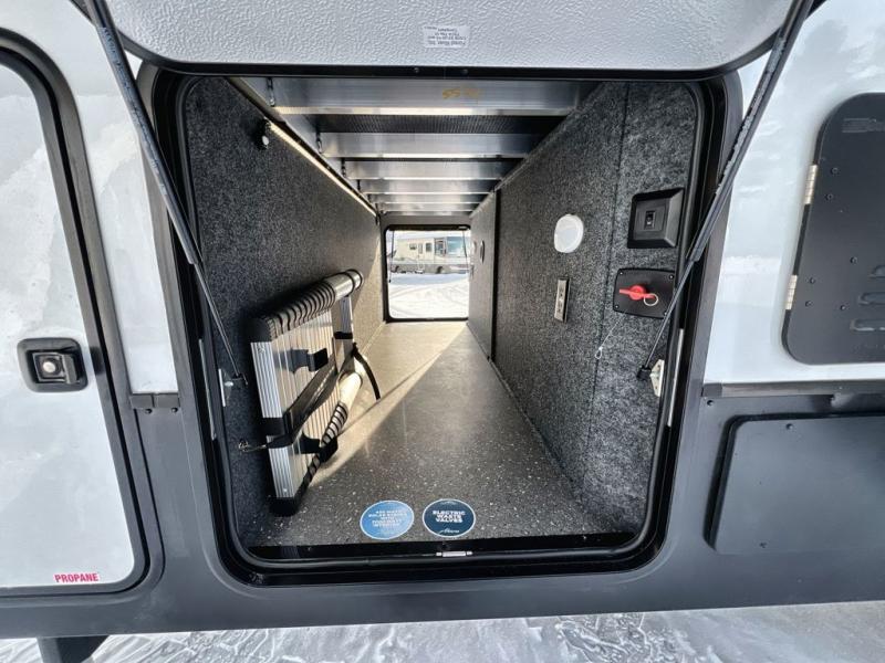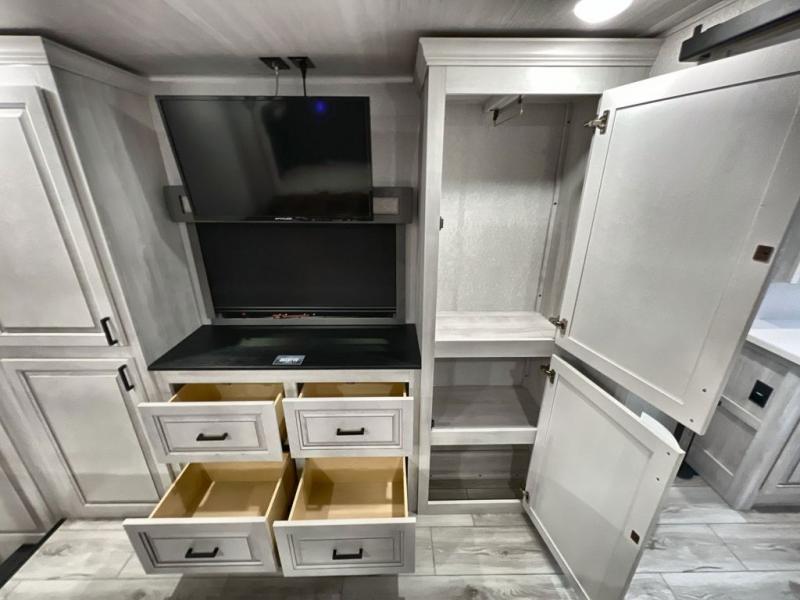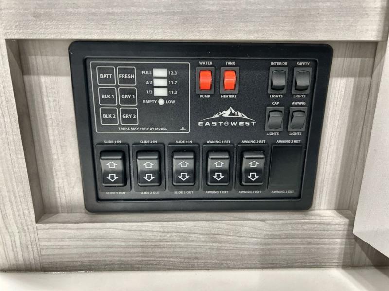 There is just too much luxury to name on the EAST TO WEST Ahara fifth wheel! These units are quite impressive, and once you see them, you'll know what we mean. The Ahara first grabs your attention with its hi-gloss gel-coated fiberglass exterior which showcases two power awnings with LED lights, an LP quick connect, an exterior cable/satellite hookup, and a universal all-in-one docking station. For towing, you'll find a MORryde CRE 3000 suspension, Dexter Gladiator thick-wall 7,000-LB axles with Nev-R-Adjust brakes, and preparations for a rearview camera. Traveling during all seasons is also made easy with the high-efficiency triple A/C system, a 40,000 BTU high-capacity furnace, a heated, insulated, and enclosed underbelly and dump valves with circulating heat, and Radiant Technology Composites insulation in the roof, front cap, and underbelly.