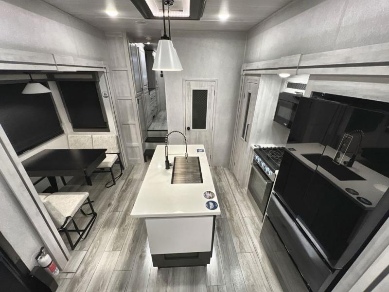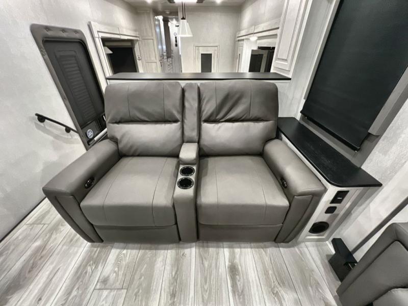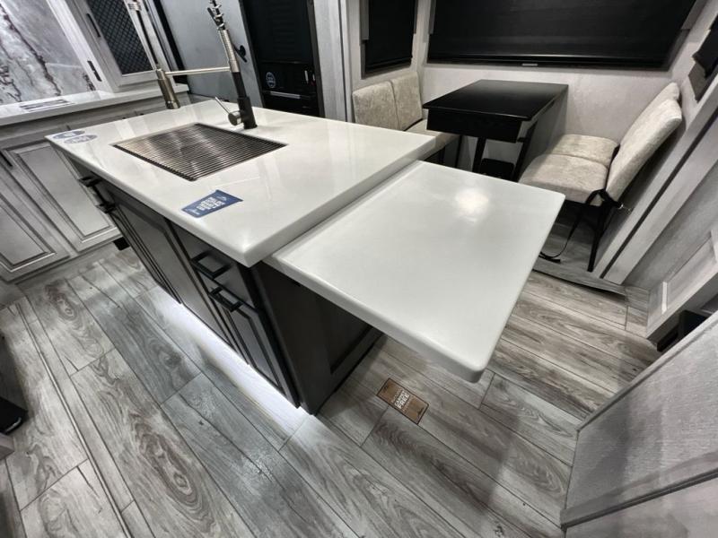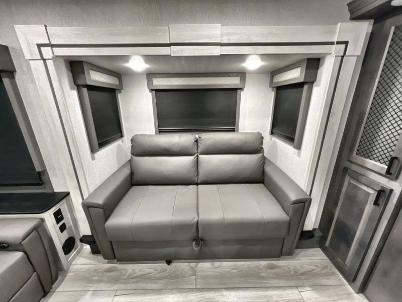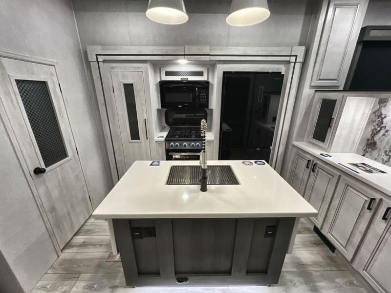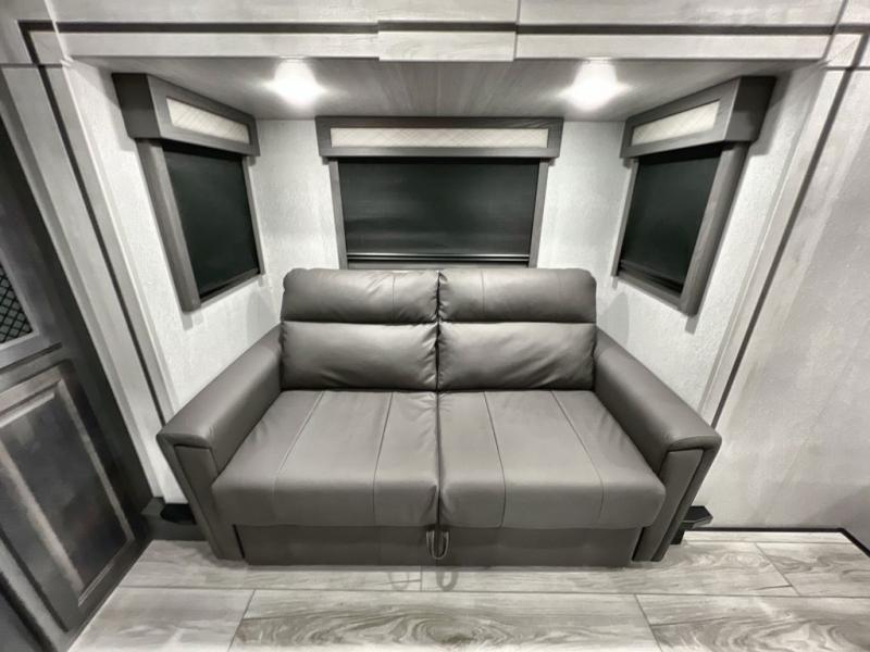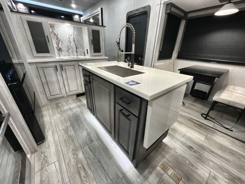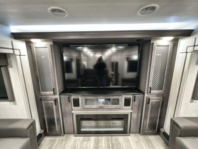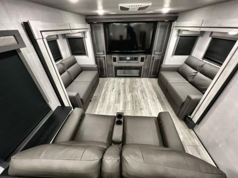 If you've been looking for a luxury fifth wheel to call your new home away from home, take a look at this Ahara! The front living area will be a favorite hangout spot with its dual hide-a-bed sofa, theater seating, and 65" TV with a fireplace. And since there are dual opposing slides here, your guests will have plenty of space to fold down the sofas at night for a great night's rest. If you're looking for your bedroom, head to the back and you'll enjoy a king bed slide out, a dresser with TV, two closets, plus your own full rear bath. The dual bath sinks are sure to come in handy when you're both getting ready for bed, and the spacious shower with a skylight will provide natural light as you clean up in the morning. There is even a closet with washer and dryer prep if you plan to go full-time. In the morning you can prepare breakfast on the four burner cooktop or in the 30" over-the-range residential microwave, and the 16 cu. ft. 12V French door refrigerator includes a double drawer freezer to hold more food. There is a free-standing dinette, a hutch to store nice dishes, and the half bath is located off of this room for convenience!