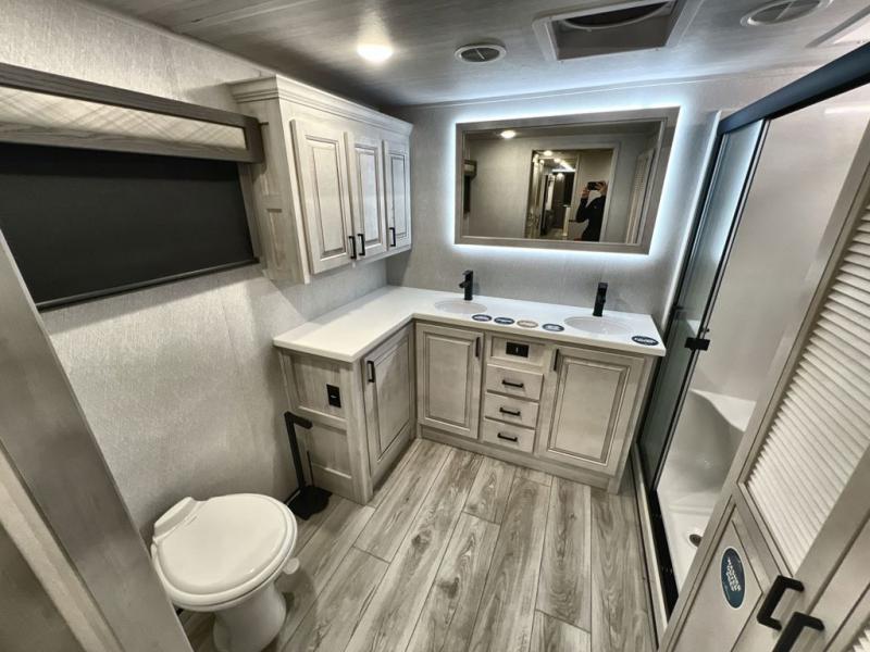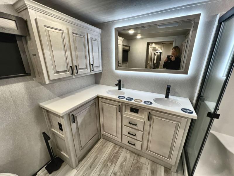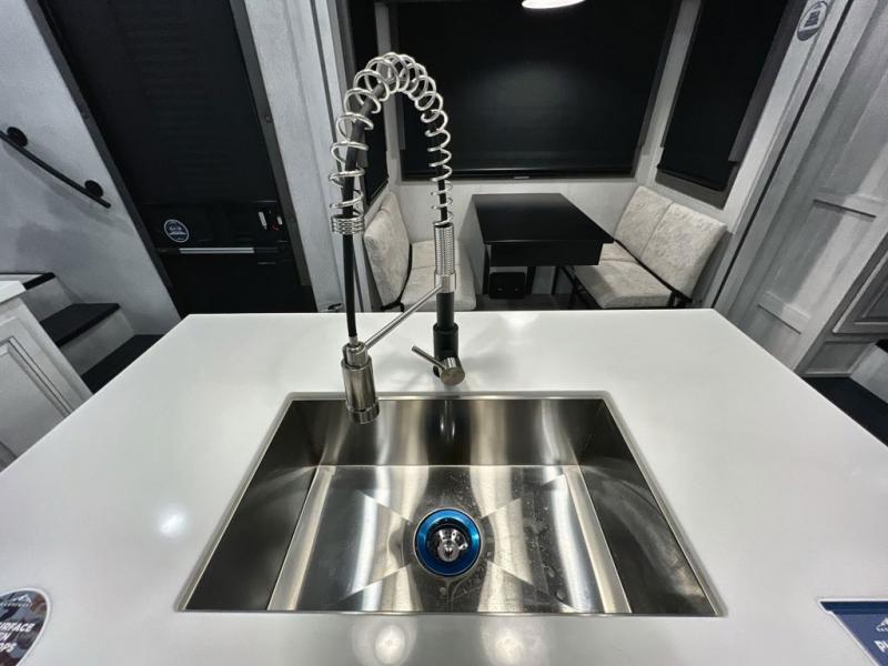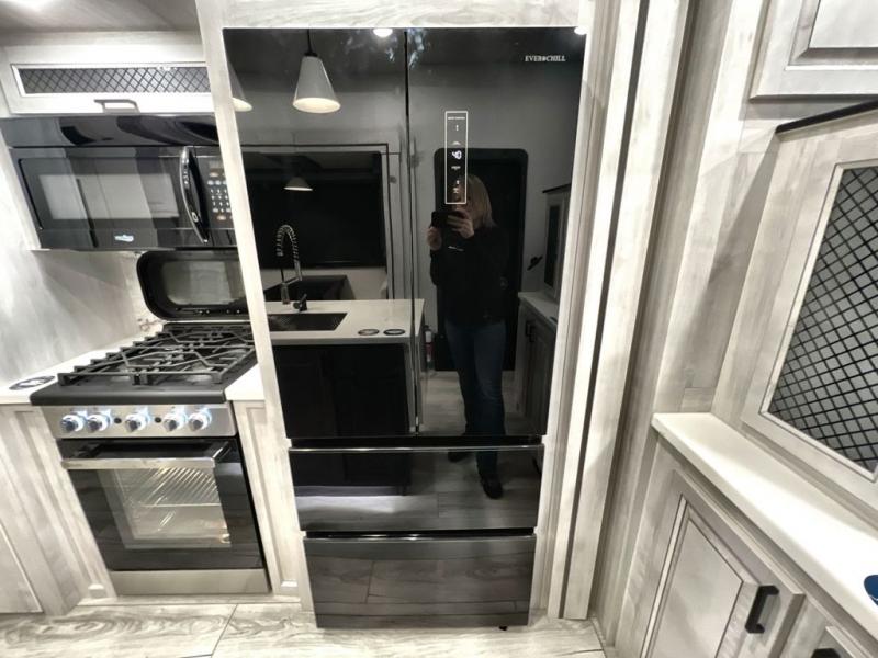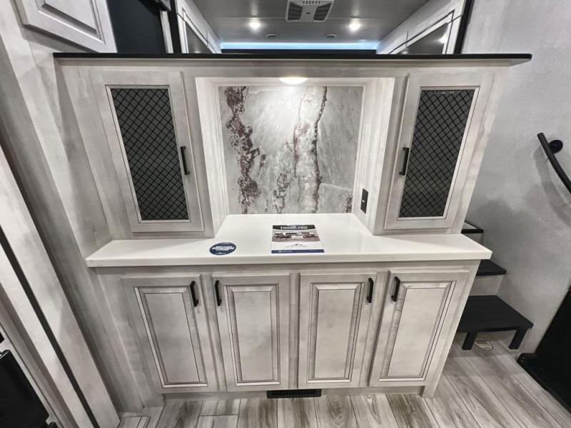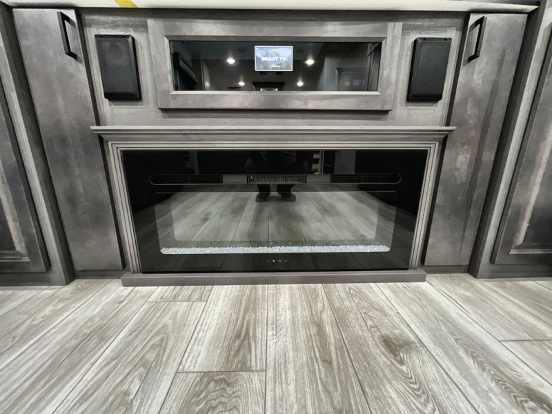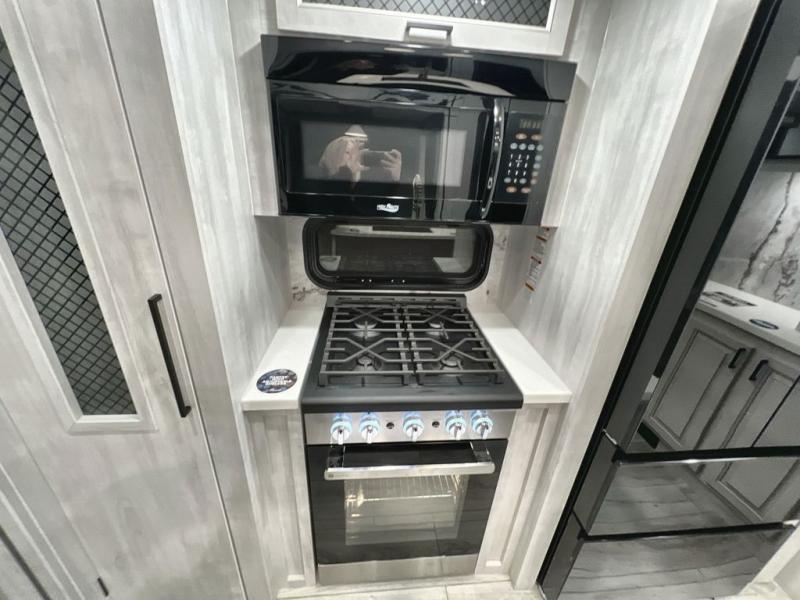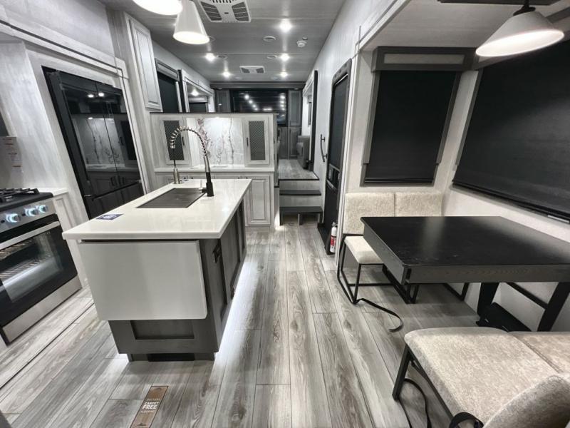 If you've been looking for a luxury fifth wheel to call your new home away from home, take a look at this Ahara! The front living area will be a favorite hangout spot with its dual hide-a-bed sofa, theater seating, and 65" TV with a fireplace. And since there are dual opposing slides here, your guests will have plenty of space to fold down the sofas at night for a great night's rest. If you're looking for your bedroom, head to the back and you'll enjoy a king bed slide out, a dresser with TV, two closets, plus your own full rear bath. The dual bath sinks are sure to come in handy when you're both getting ready for bed, and the spacious shower with a skylight will provide natural light as you clean up in the morning. There is even a closet with washer and dryer prep if you plan to go full-time. In the morning you can prepare breakfast on the four burner cooktop or in the 30" over-the-range residential microwave, and the 16 cu. ft. 12V French door refrigerator includes a double drawer freezer to hold more food. There is a free-standing dinette, a hutch to store nice dishes, and the half bath is located off of this room for convenience!