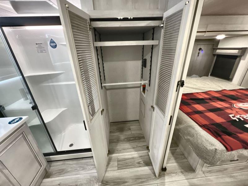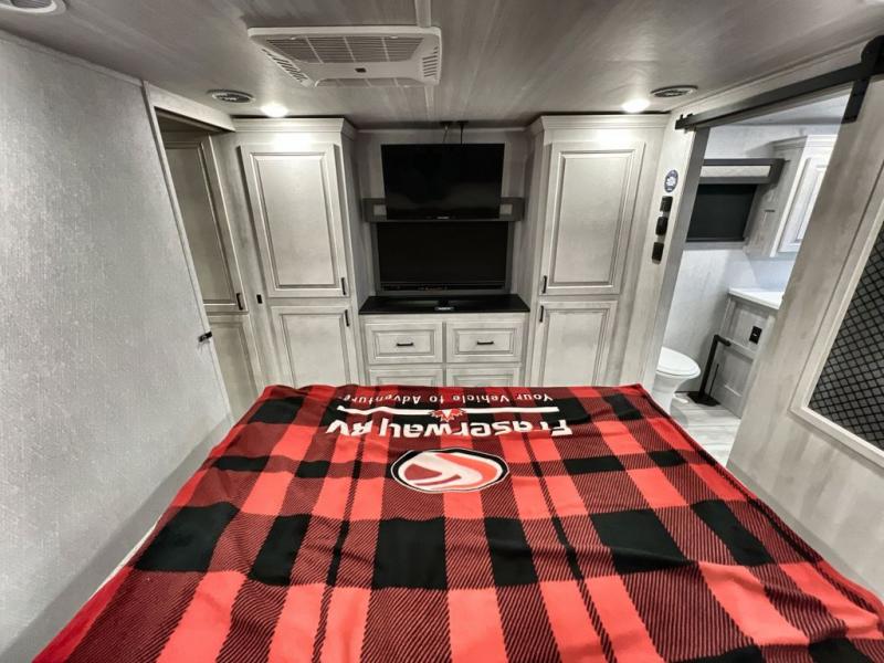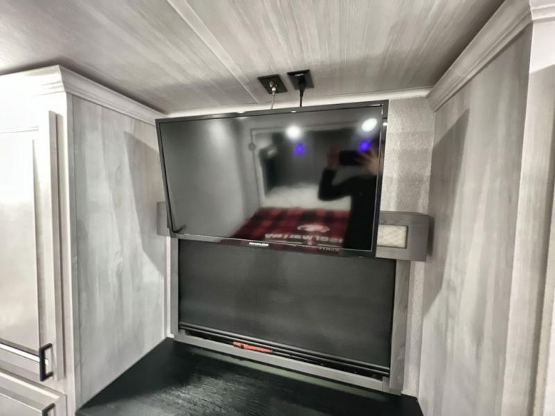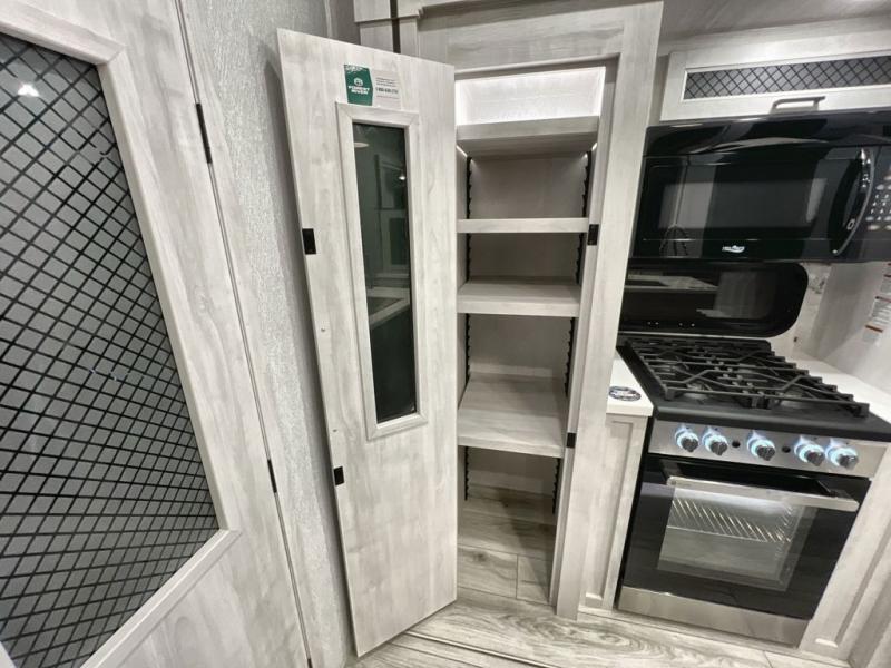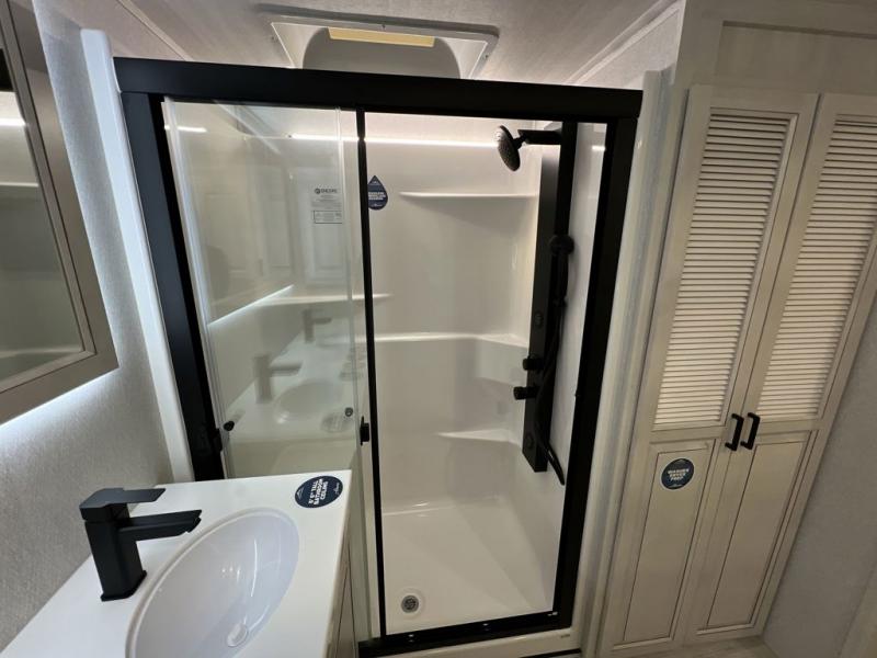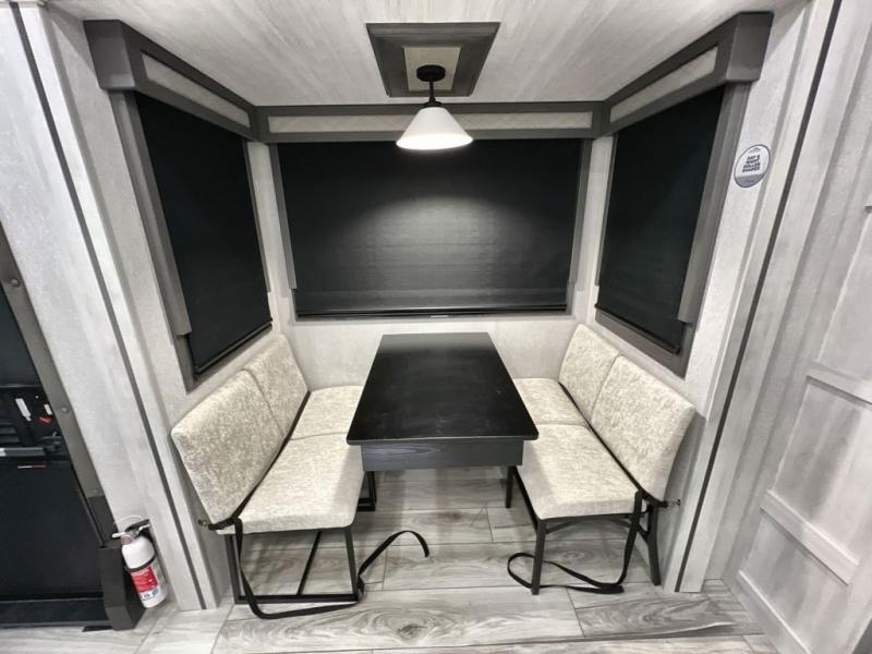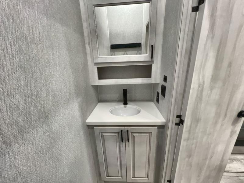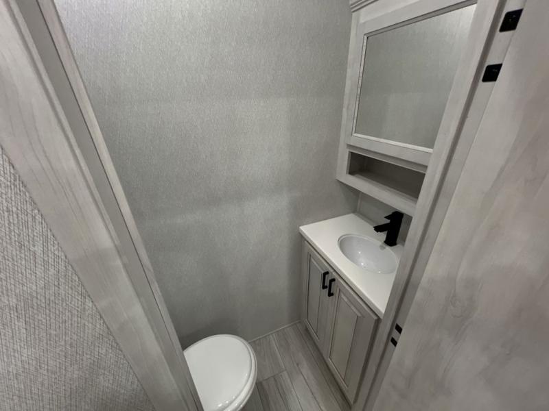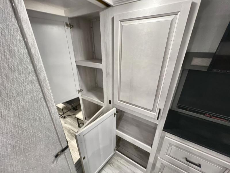 If you've been looking for a luxury fifth wheel to call your new home away from home, take a look at this Ahara! The front living area will be a favorite hangout spot with its dual hide-a-bed sofa, theater seating, and 65" TV with a fireplace. And since there are dual opposing slides here, your guests will have plenty of space to fold down the sofas at night for a great night's rest. If you're looking for your bedroom, head to the back and you'll enjoy a king bed slide out, a dresser with TV, two closets, plus your own full rear bath. The dual bath sinks are sure to come in handy when you're both getting ready for bed, and the spacious shower with a skylight will provide natural light as you clean up in the morning. There is even a closet with washer and dryer prep if you plan to go full-time. In the morning you can prepare breakfast on the four burner cooktop or in the 30" over-the-range residential microwave, and the 16 cu. ft. 12V French door refrigerator includes a double drawer freezer to hold more food. There is a free-standing dinette, a hutch to store nice dishes, and the half bath is located off of this room for convenience!