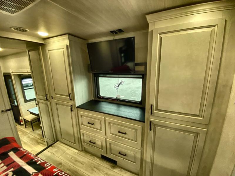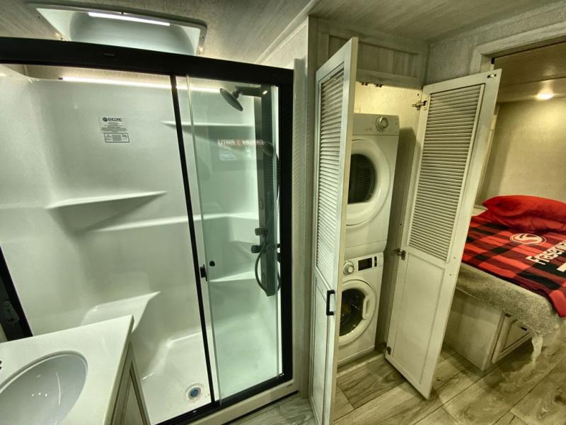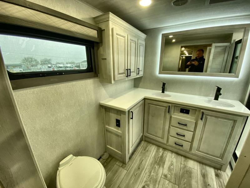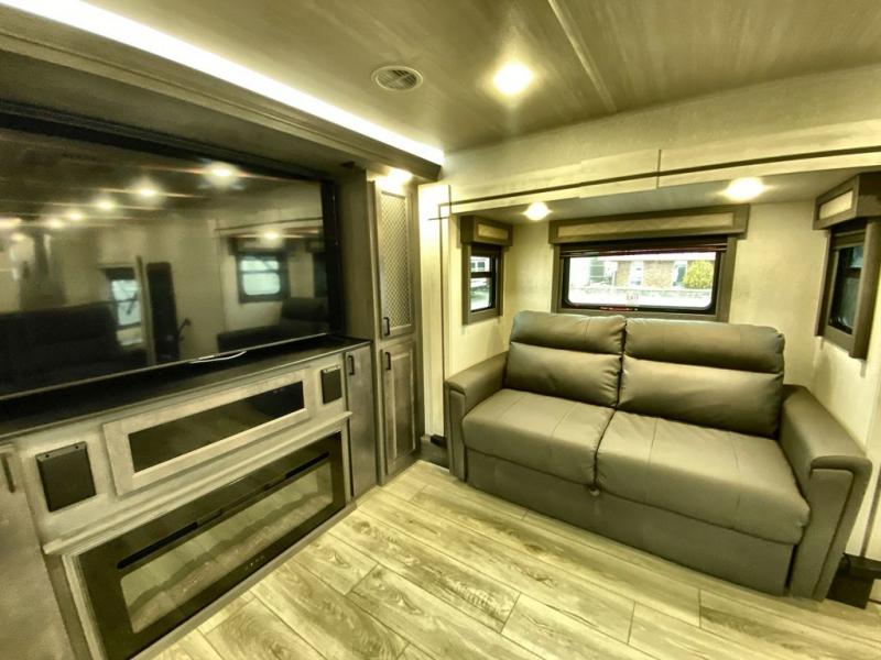 If you've been looking for a luxury fifth wheel to call your new home away from home, take a look at this Ahara! The front living area will be a favorite hangout spot with its dual hide-a-bed sofa, theater seating, and 65" TV with a fireplace. And since there are dual opposing slides here, your guests will have plenty of space to fold down the sofas at night for a great night's rest. If you're looking for your bedroom, head to the back and you'll enjoy a king bed slide out, a dresser with TV, two closets, plus your own full rear bath. The dual bath sinks are sure to come in handy when you're both getting ready for bed, and the spacious shower with a skylight will provide natural light as you clean up in the morning. There is even a closet with washer and dryer prep if you plan to go full-time. In the morning you can prepare breakfast on the four burner cooktop or in the 30" over-the-range residential microwave, and the 16 cu. ft. 12V French door refrigerator includes a double drawer freezer to hold more food. There is a free-standing dinette, a hutch to store nice dishes, and the half bath is located off of this room for convenience!
