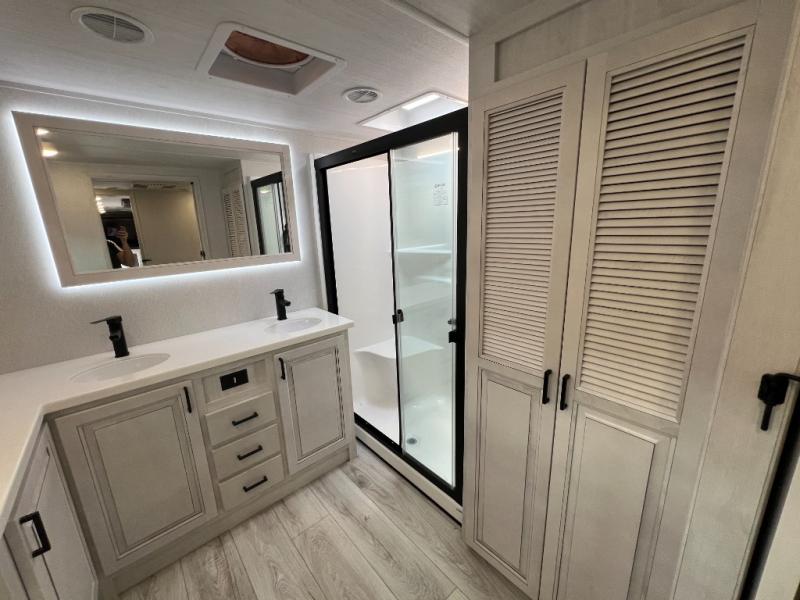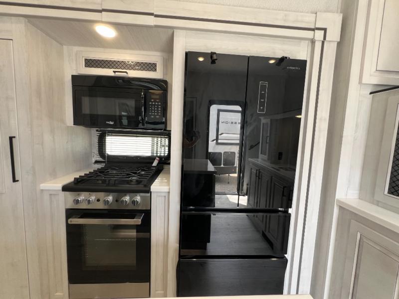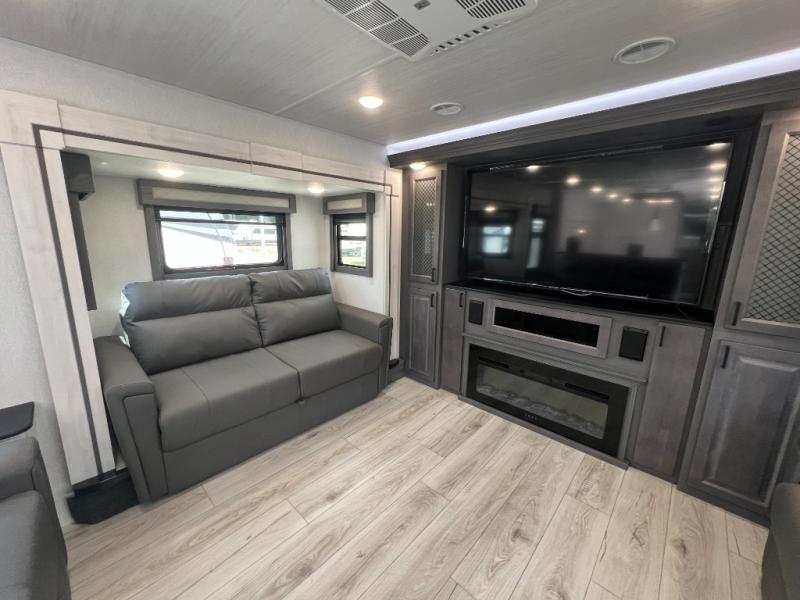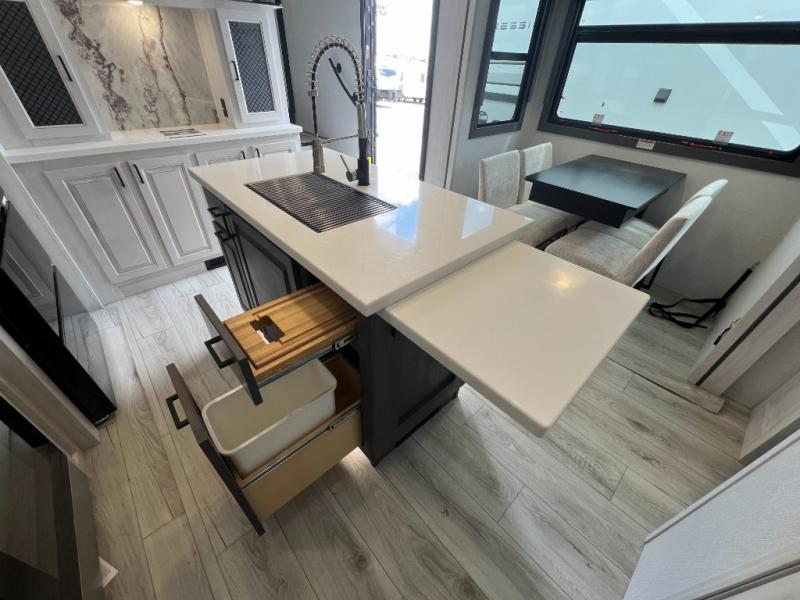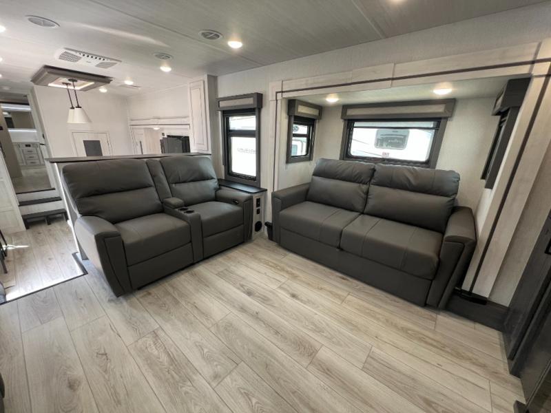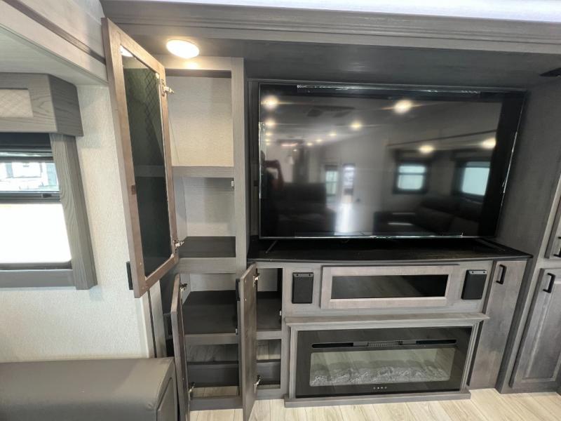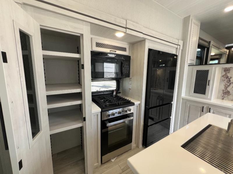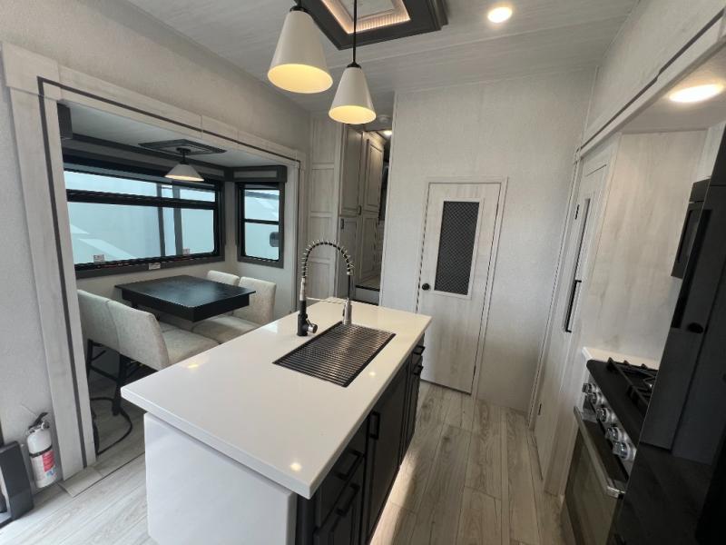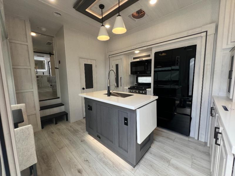 If you've been looking for a luxury fifth wheel to call your new home away from home, take a look at this Ahara! The front living area will be a favorite hangout spot with its dual hide-a-bed sofa, theater seating, and 65" TV with a fireplace. And since there are dual opposing slides here, your guests will have plenty of space to fold down the sofas at night for a great night's rest. If you're looking for your bedroom, head to the back and you'll enjoy a king bed slide out, a dresser with TV, two closets, plus your own full rear bath. The dual bath sinks are sure to come in handy when you're both getting ready for bed, and the spacious shower with a skylight will provide natural light as you clean up in the morning. There is even a closet with washer and dryer prep if you plan to go full-time. In the morning you can prepare breakfast on the four burner cooktop or in the 30" over-the-range residential microwave, and the 16 cu. ft. 12V French door refrigerator includes a double drawer freezer to hold more food. There is a free-standing dinette, a hutch to store nice dishes, and the half bath is located off of this room for convenience!