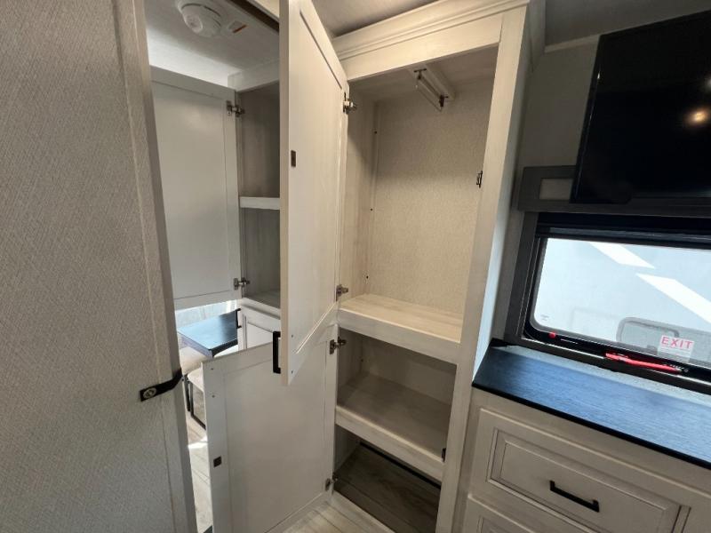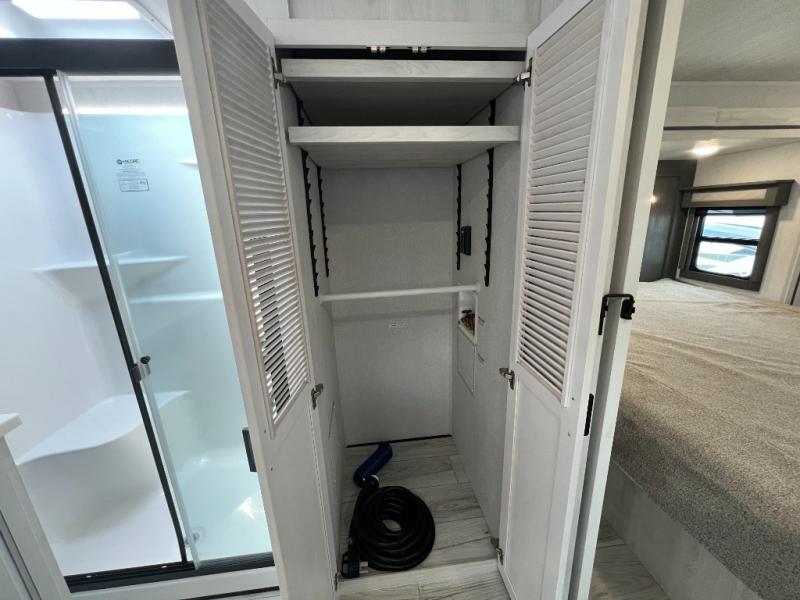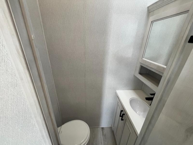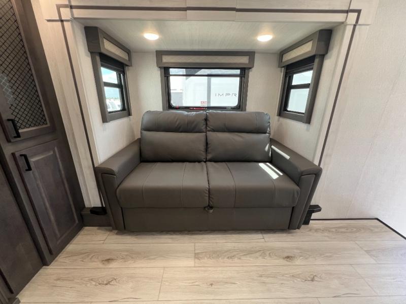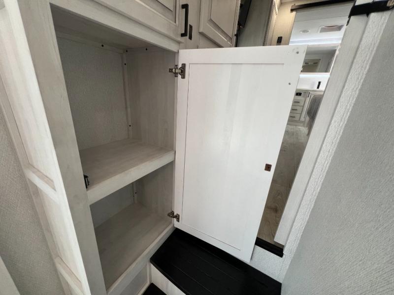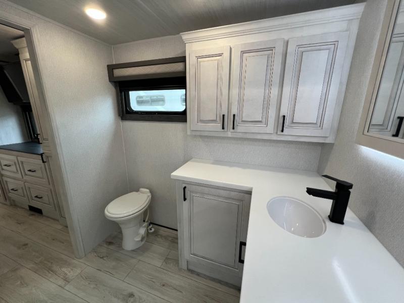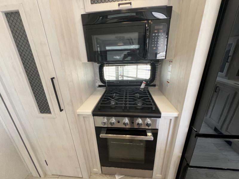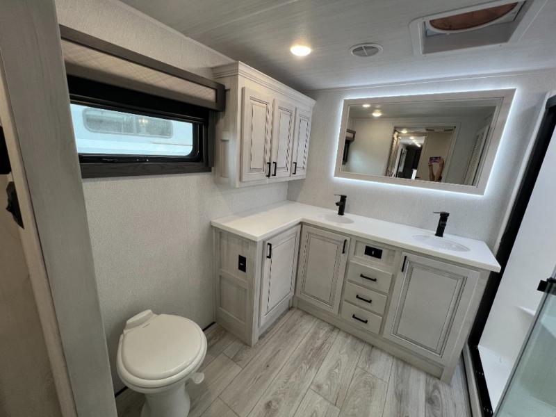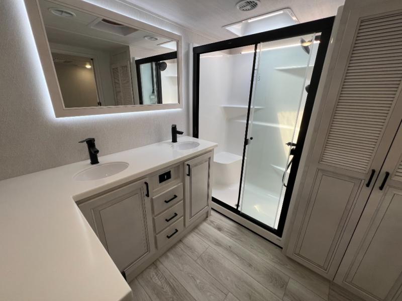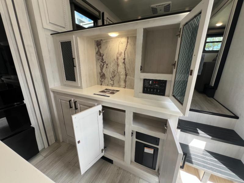 If you've been looking for a luxury fifth wheel to call your new home away from home, take a look at this Ahara! The front living area will be a favorite hangout spot with its dual hide-a-bed sofa, theater seating, and 65" TV with a fireplace. And since there are dual opposing slides here, your guests will have plenty of space to fold down the sofas at night for a great night's rest. If you're looking for your bedroom, head to the back and you'll enjoy a king bed slide out, a dresser with TV, two closets, plus your own full rear bath. The dual bath sinks are sure to come in handy when you're both getting ready for bed, and the spacious shower with a skylight will provide natural light as you clean up in the morning. There is even a closet with washer and dryer prep if you plan to go full-time. In the morning you can prepare breakfast on the four burner cooktop or in the 30" over-the-range residential microwave, and the 16 cu. ft. 12V French door refrigerator includes a double drawer freezer to hold more food. There is a free-standing dinette, a hutch to store nice dishes, and the half bath is located off of this room for convenience!