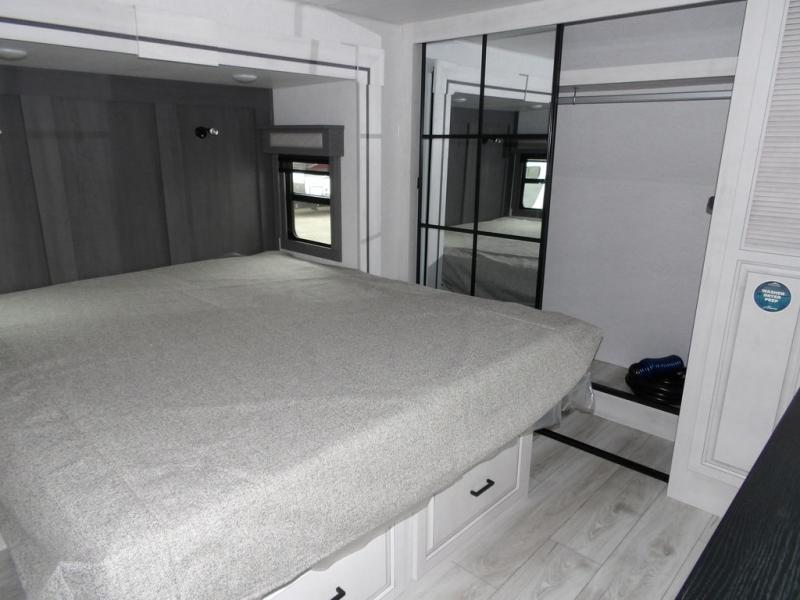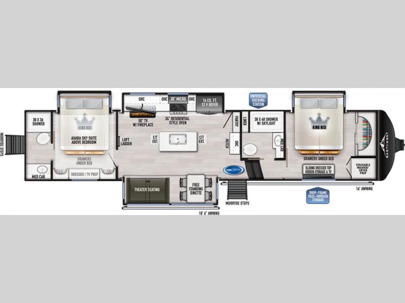 If you're looking for a luxury fifth wheel with more space for friends and family, you've found it in this Ahara! The main entry door opens up to the living area with dual opposing slides, a 50" LED TV with a fireplace, plus a full kitchen with residential appliances, a hutch, and even a pantry for dry goods and snacks. Everyone can meet here in the evenings to dine at the free-standing dinette or relax on the theater seating. You'll love the rear master suite with its king bed slide out, drawers under the bed, and full rear bath with the unique rear second entry door. And check out the Ahara Sky Suite loft above this room for even more sleeping or storage space! Your guests will find the front private bedroom to be accommodating since it includes a king bed slide out, drawers under the bed, pus a large wardrobe to keep clothes tidy. There is also a closet with washer and dryer pre. Who knows, you may just choose this bedroom for your own!