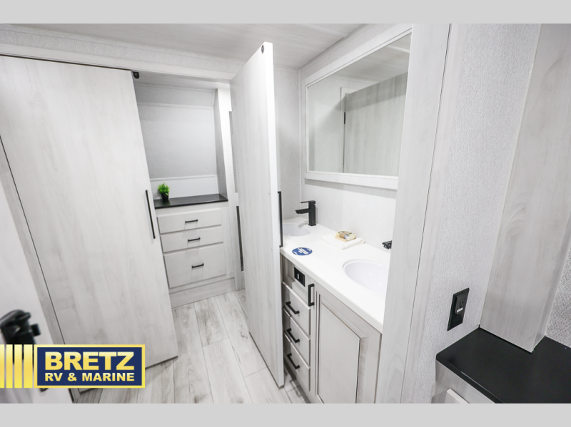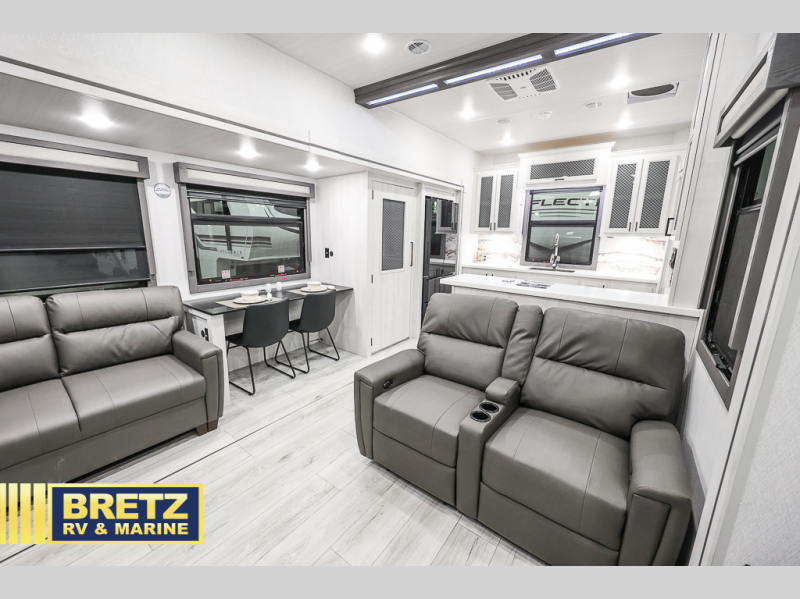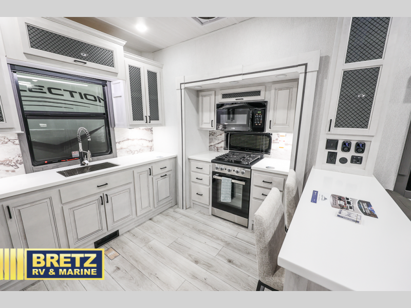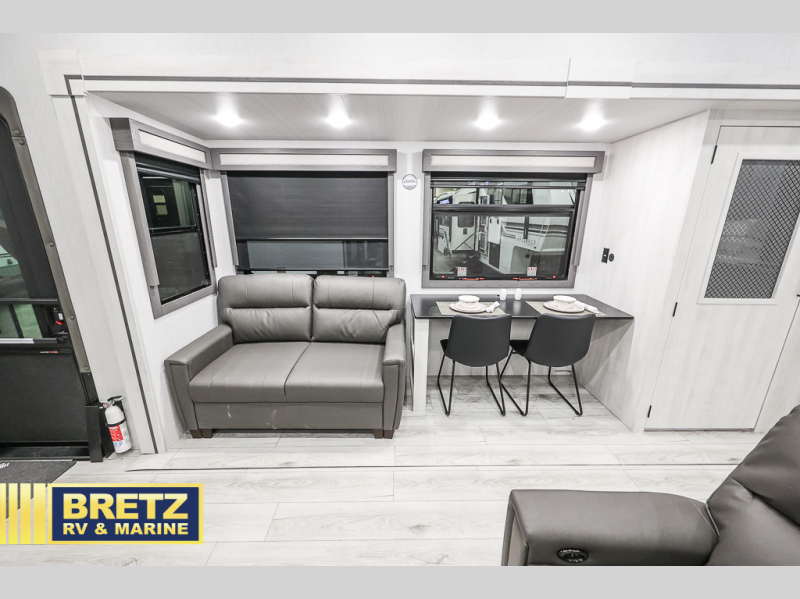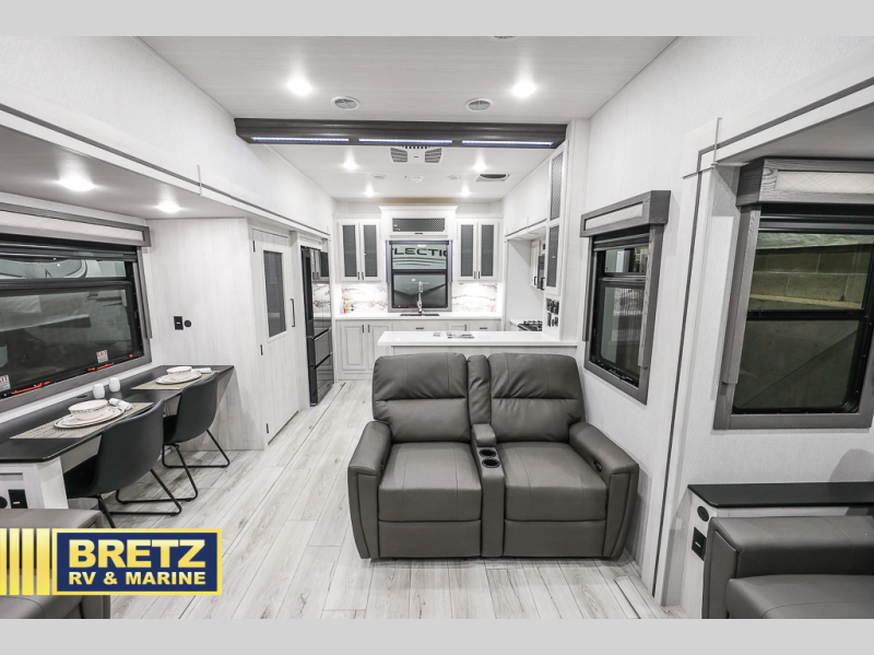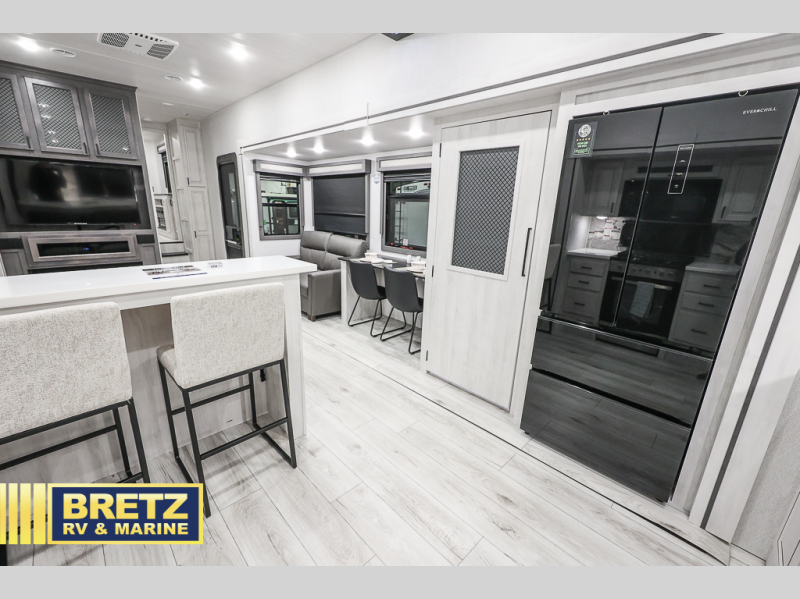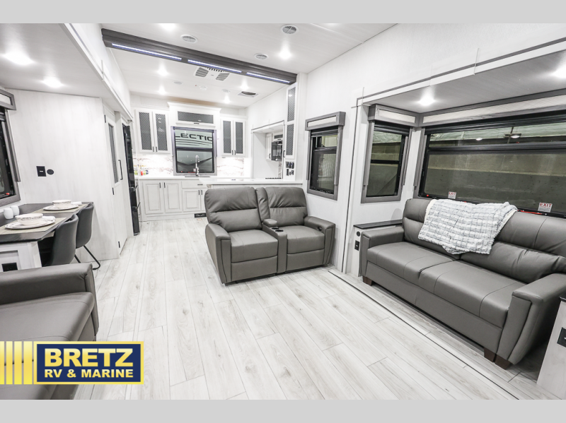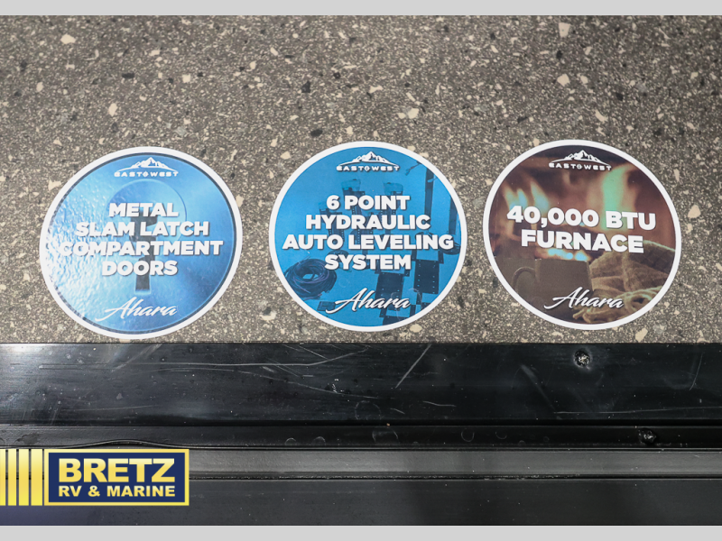 There is just too much luxury to name on the EAST TO WEST Ahara fifth wheel! These units are quite impressive, and once you see them, you'll know what we mean. The Ahara first grabs your attention with its hi-gloss gel-coated fiberglass exterior which showcases two power awnings with LED lights, an LP quick connect, an exterior cable/satellite hookup, and a universal all-in-one docking station. For towing, you'll find a MORryde CRE 3000 suspension, Dexter Gladiator thick-wall 7,000-LB axles with Nev-R-Adjust brakes, and preparations for a rearview camera. Traveling during all seasons is also made easy with the high-efficiency triple A/C system, a 40,000 BTU high-capacity furnace, a heated, insulated, and enclosed underbelly and dump valves with circulating heat, and Radiant Technology Composites insulation in the roof, front cap, and underbelly.