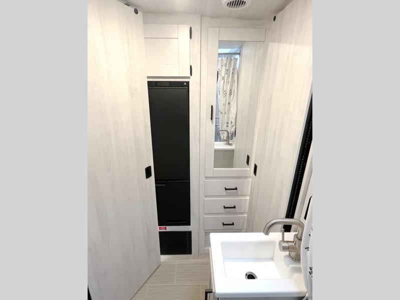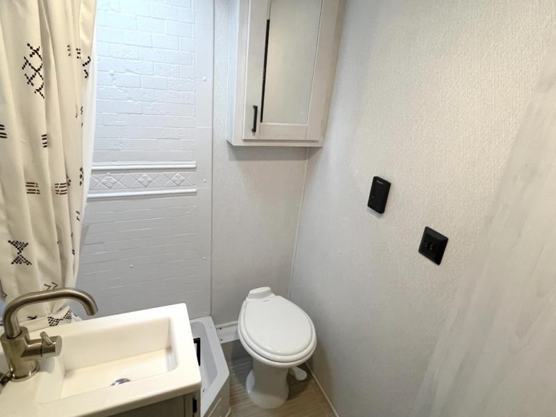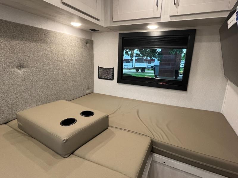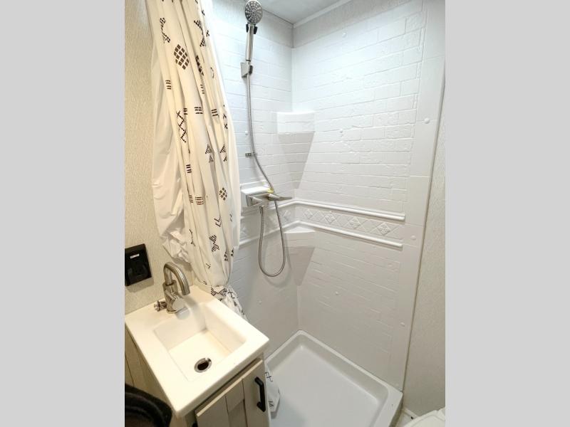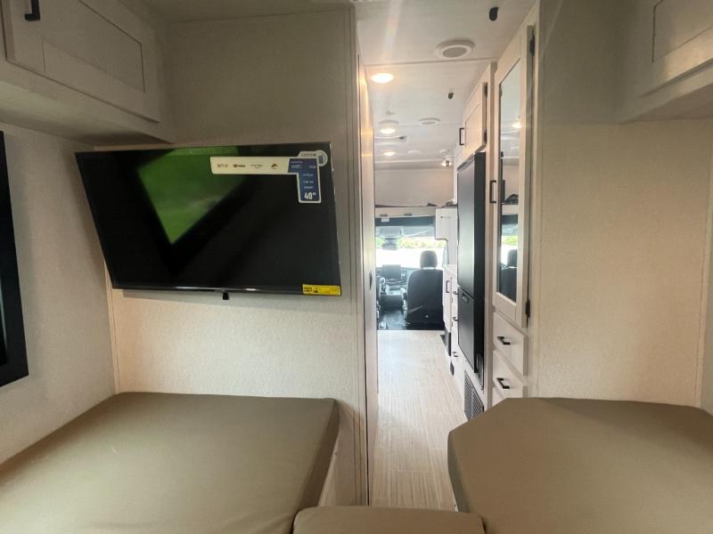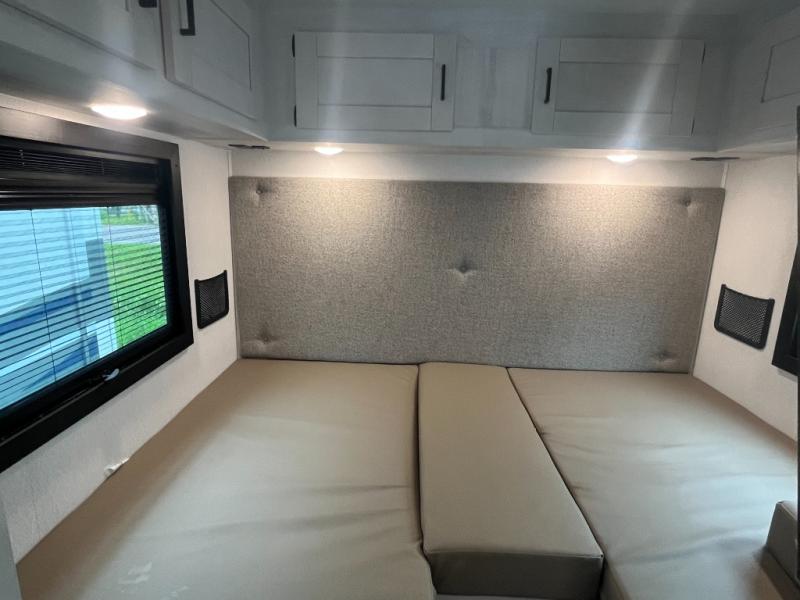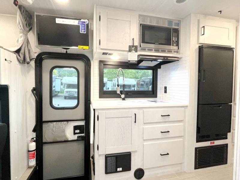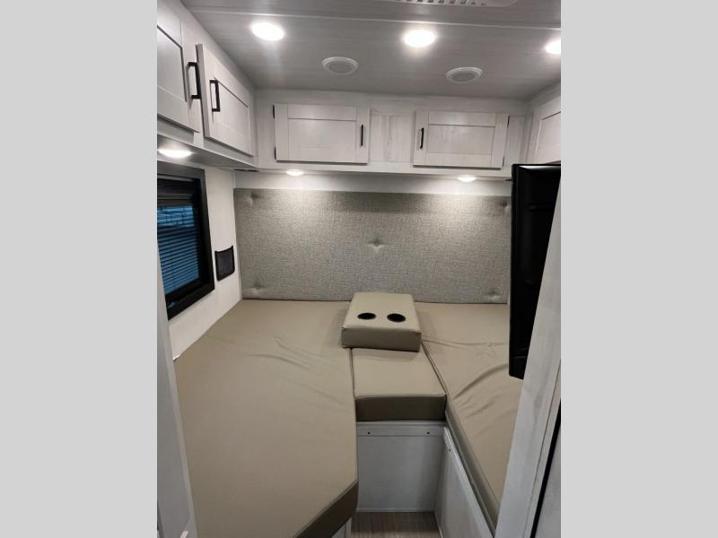 Whether you are traveling to your favorite campground or across the country, you are going to love this motorhome. You will have versatility in this coach to travel with a friend or your sweetheart with two twin beds that can easily convert to a king bed if you like. Each bed is 36" x 73" with a nightstand between and overhead storage along both sides and across the rear of the unit providing plenty of space for your things. There is also a wardrobe off the foot of the twin that is on the curbside. For relaxing and dining a slide out sofa with removeable table, and more overhead storage here. The kitchen is opposite the slide on the door side and features a round hidden sink with solid surface cover for added prep space, a 12-volt 6 cu. ft. refrigerator for your perishables, and a microwave oven and induction cooktop for easy meals as you travel. When you want to get cleaned up, a bath with an angled shower, toilet, and sink, plus medicine cabinet for your toothbrush and razor. The doors both open out so you can actually create a more open space when in the bathroom making it the width of the unit.