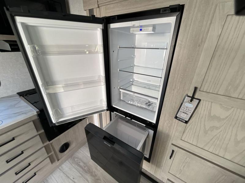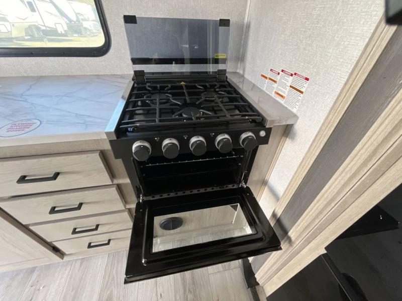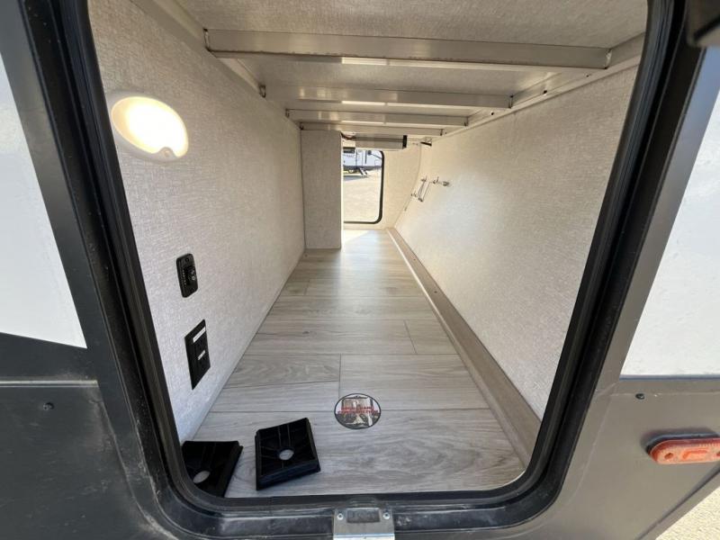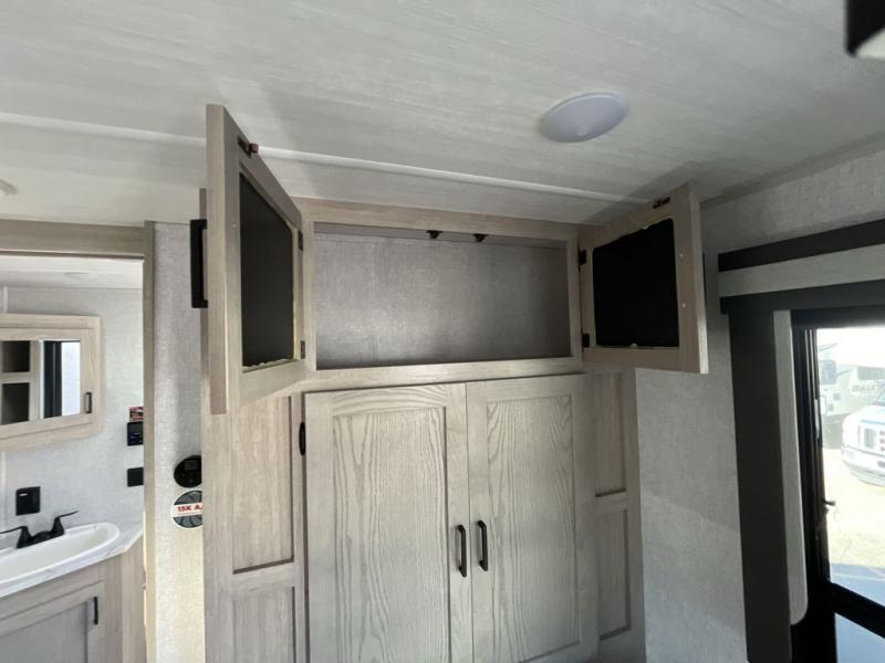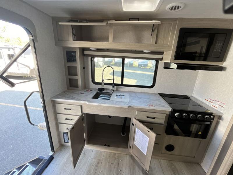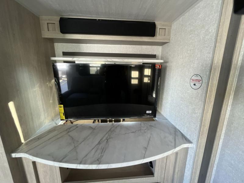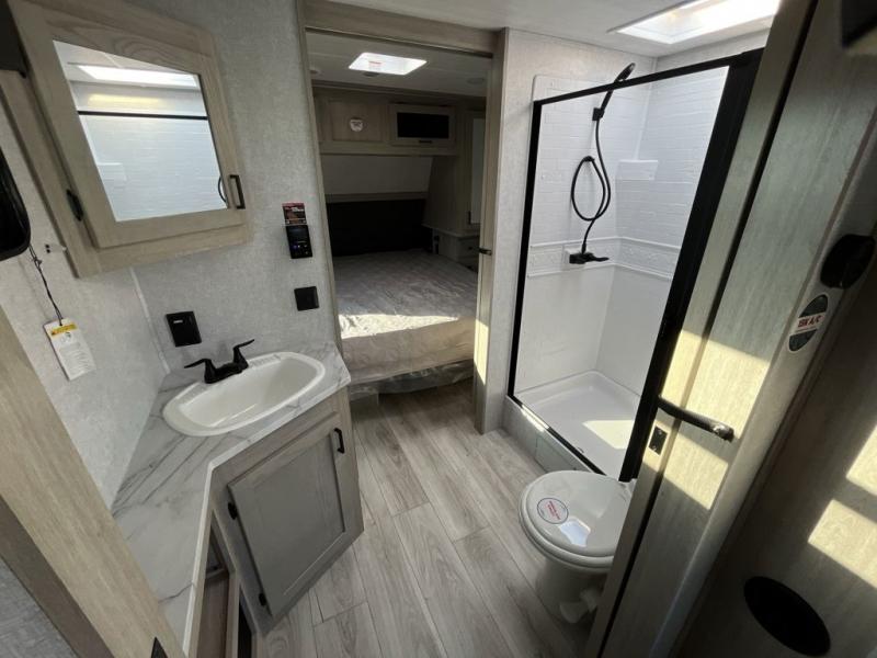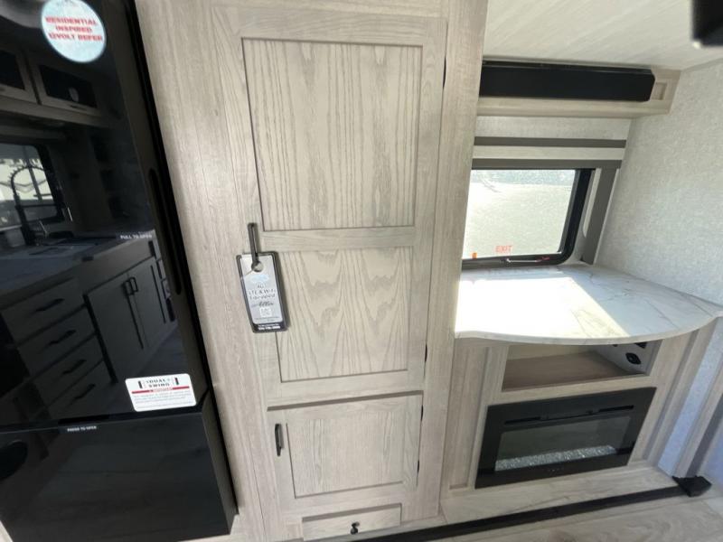 You're going to love this rear kitchen travel trailer with dual entry doors and a king bed in the front bedroom! The tri-fold sofa can be replaced by optional theater seats, plus there is a telescoping 40" TV with a fireplace for a more at-home feel. The walk-through bath will be easy for everyone to access, and there is a shower skylight here to let more natural light in. This model is also pet-friendly thanks to the pet dish under the refrigerator and the outside spray port to hose them off after a day in the river!