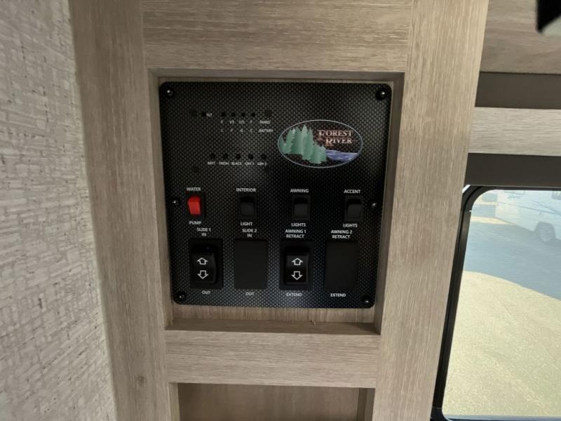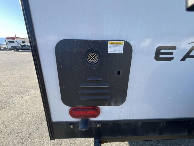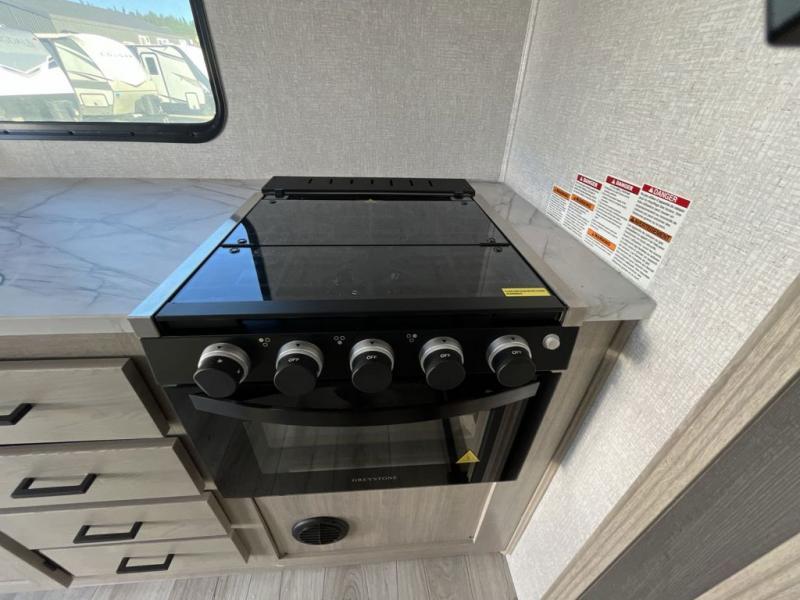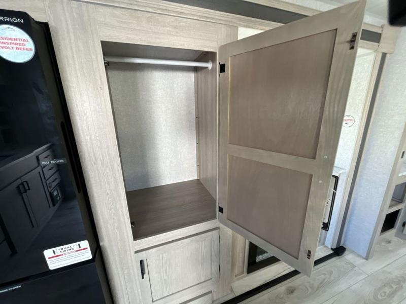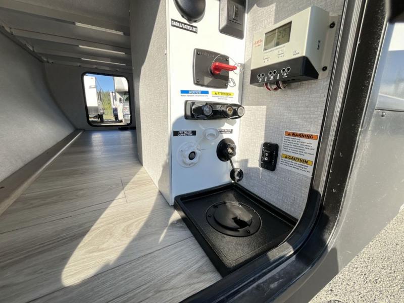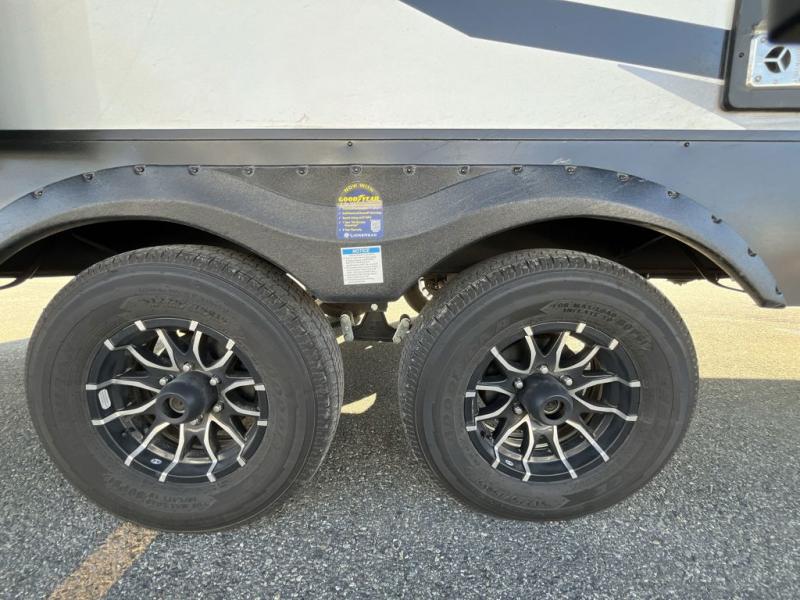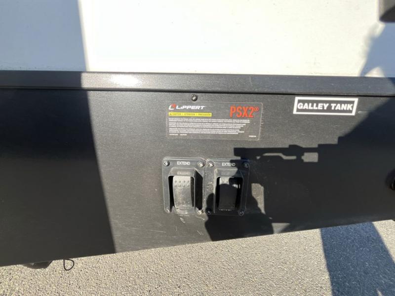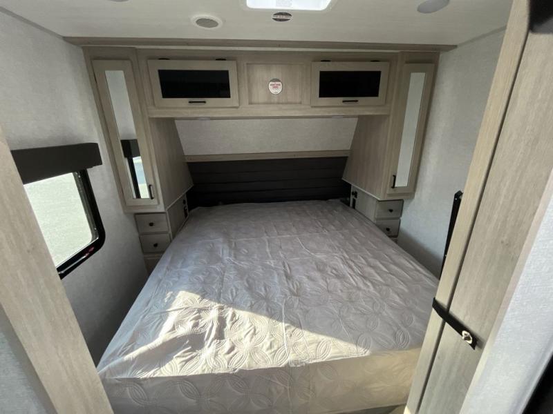 You're going to love this rear kitchen travel trailer with dual entry doors and a king bed in the front bedroom! The tri-fold sofa can be replaced by optional theater seats, plus there is a telescoping 40" TV with a fireplace for a more at-home feel. The walk-through bath will be easy for everyone to access, and there is a shower skylight here to let more natural light in. This model is also pet-friendly thanks to the pet dish under the refrigerator and the outside spray port to hose them off after a day in the river!
