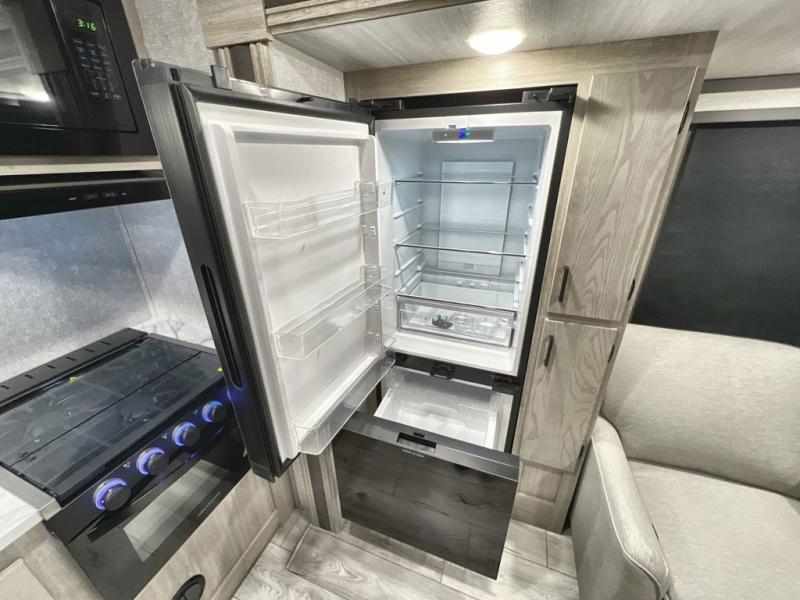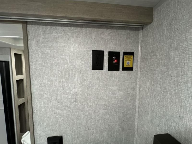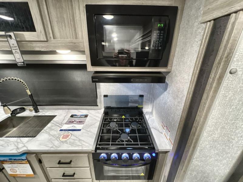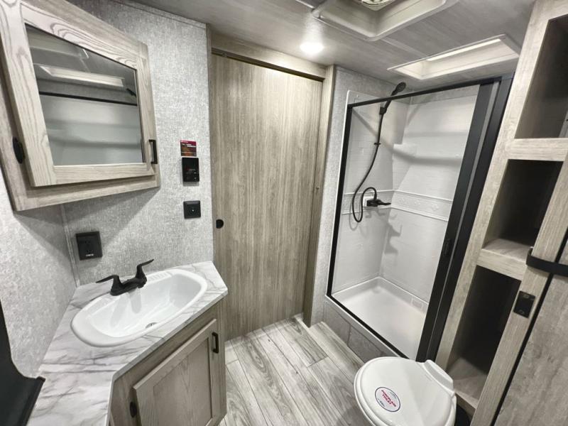 You can comfortably sleep four in this travel trailer thanks to the Tri- Fold Sofa and a king bed. There is also additional space as in the overhead cabinets, dual wardrobes and night stands. The combined living area and kitchen includes a Tri-fold Sofa with optional theater seats, a booth dinette with storage under it, plus a 50" TV. Great accessibility thanks to the two entry doors. In the exterior, there is also a 19' awning and a pass-trough storage. Finally after a long day take a comfortable and relaxing shower in our walk trough bathroom.