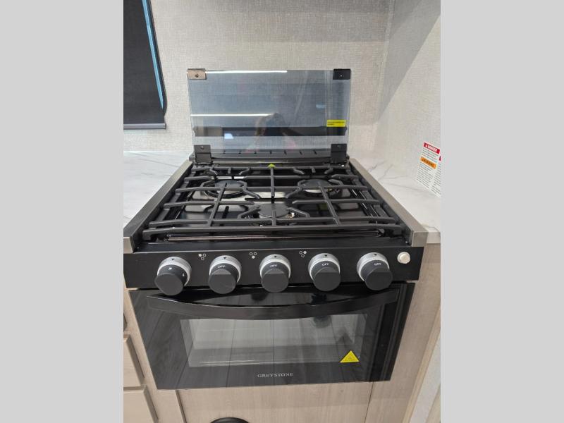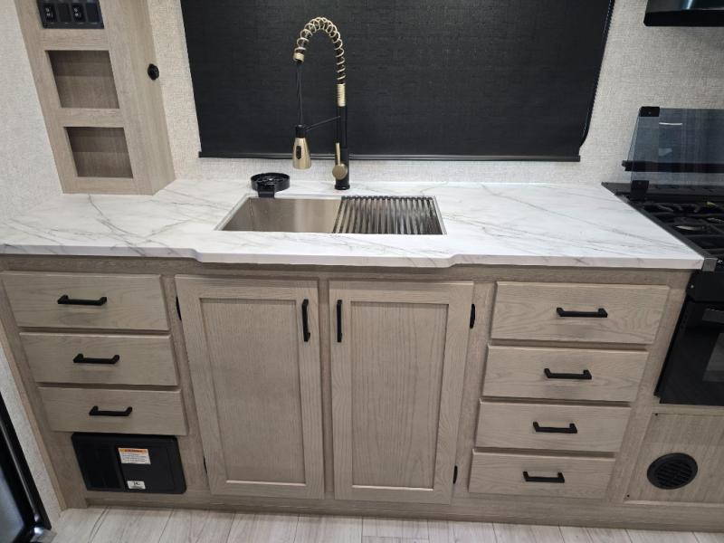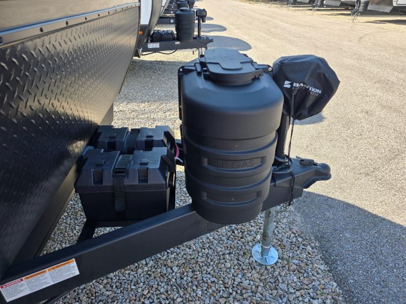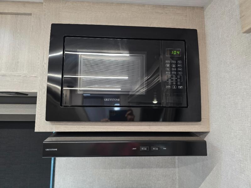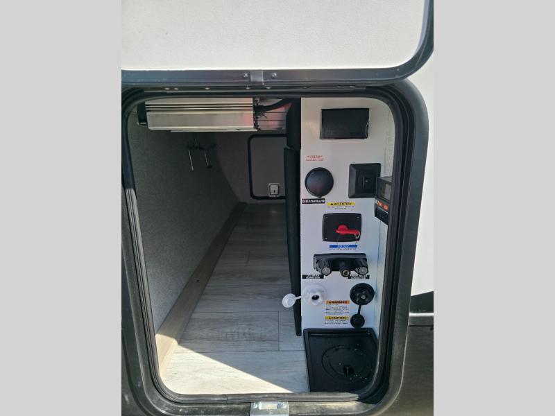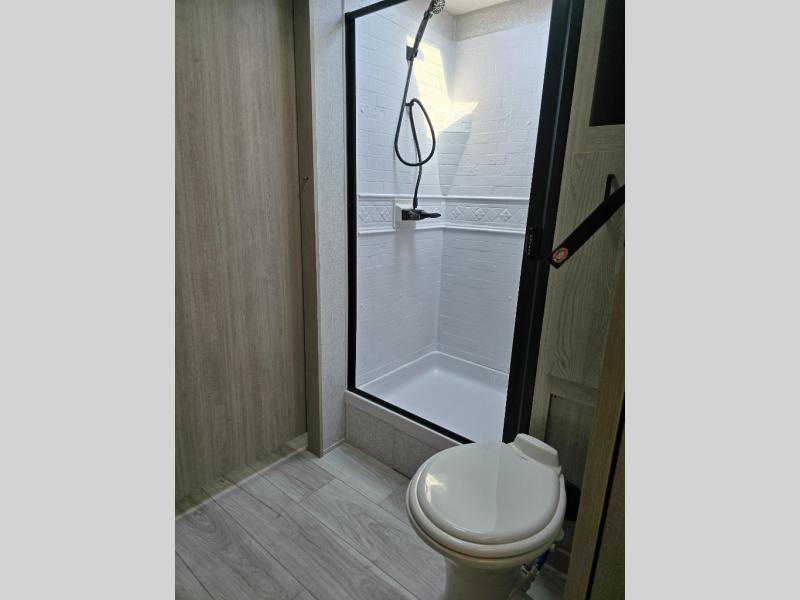 You can comfortably sleep four in this travel trailer thanks to the Tri- Fold Sofa and a king bed. There is also additional space as in the overhead cabinets, dual wardrobes and night stands. The combined living area and kitchen includes a Tri-fold Sofa with optional theater seats, a booth dinette with storage under it, plus a 50" TV. Great accessibility thanks to the two entry doors. In the exterior, there is also a 19' awning and a pass-trough storage. Finally after a long day take a comfortable and relaxing shower in our walk trough bathroom.
