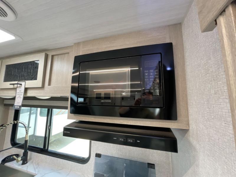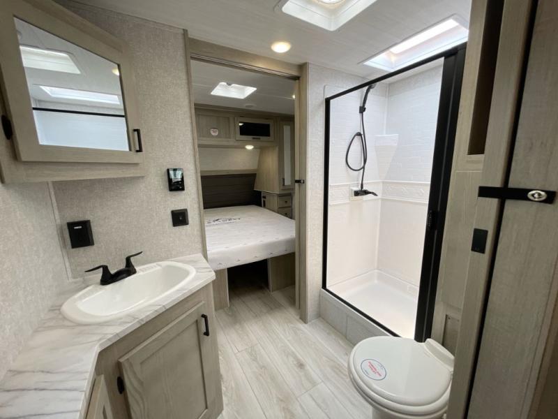 You can comfortably sleep four in this travel trailer thanks to the Tri- Fold Sofa and a king bed. There is also additional space as in the overhead cabinets, dual wardrobes and night stands. The combined living area and kitchen includes a Tri-fold Sofa with optional theater seats, a booth dinette with storage under it, plus a 50" TV. Great accessibility thanks to the two entry doors. In the exterior, there is also a 19' awning and a pass-trough storage. Finally after a long day take a comfortable and relaxing shower in our walk trough bathroom.