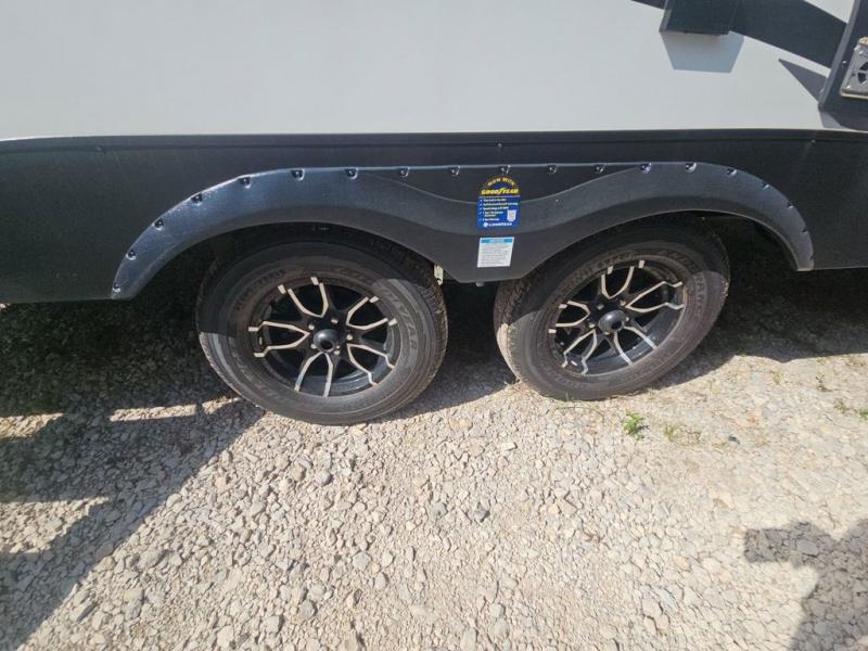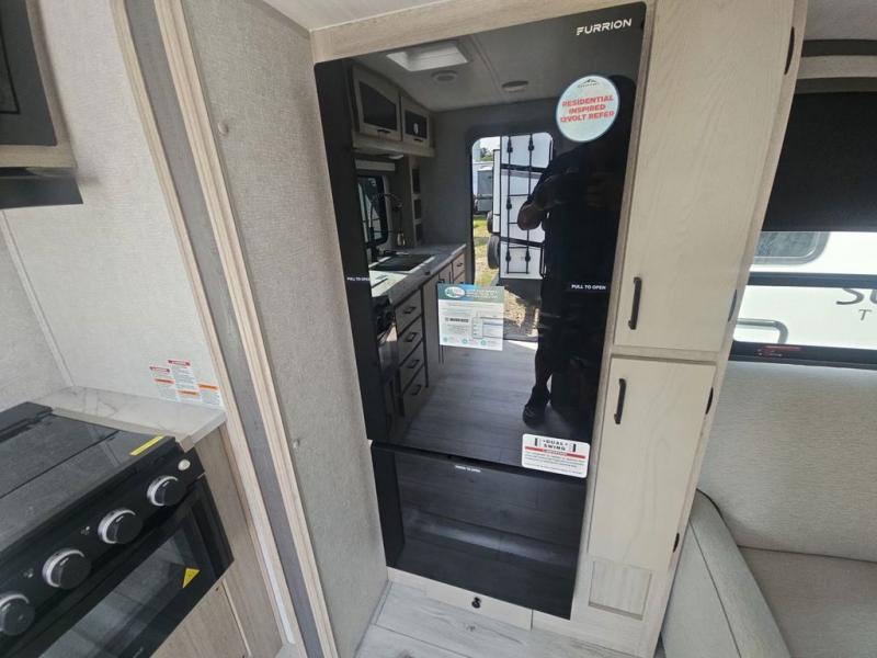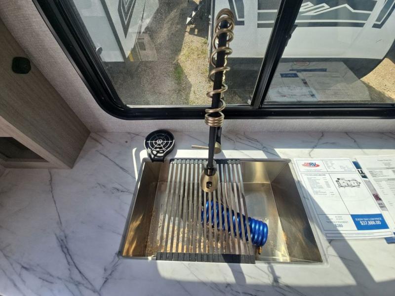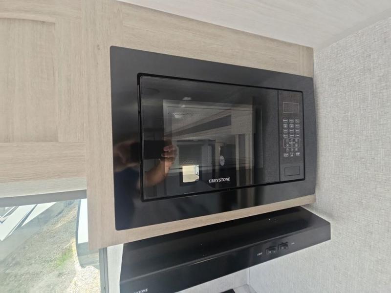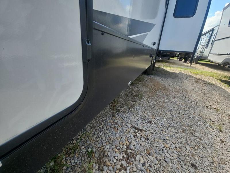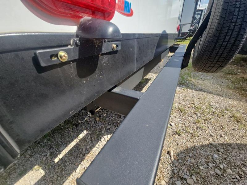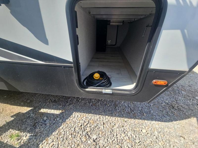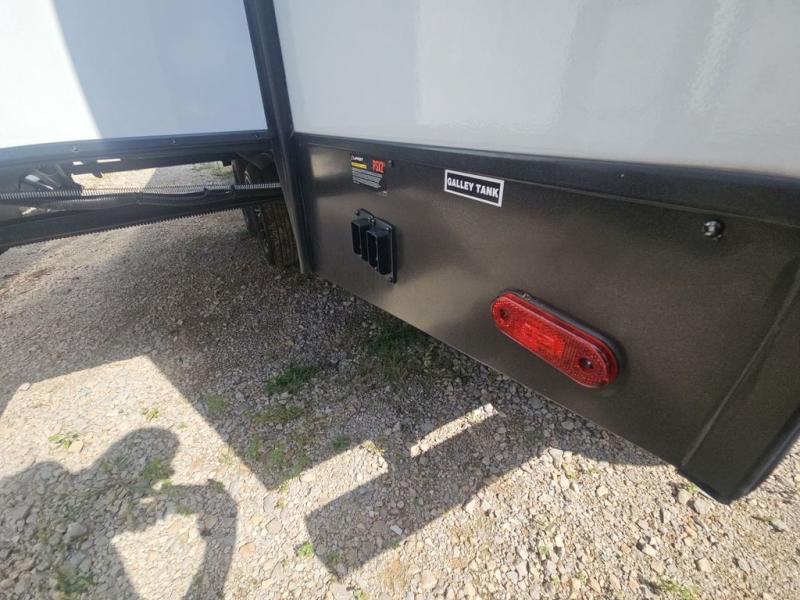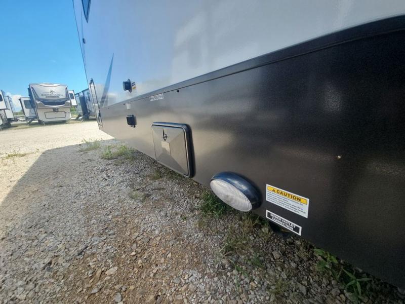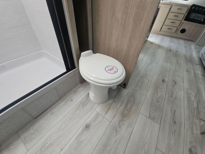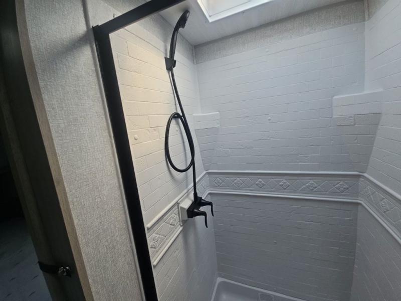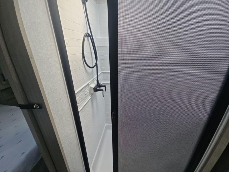 You can comfortably sleep four in this travel trailer thanks to the Tri- Fold Sofa and a king bed. There is also additional space as in the overhead cabinets, dual wardrobes and night stands. The combined living area and kitchen includes a Tri-fold Sofa with optional theater seats, a booth dinette with storage under it, plus a 50" TV. Great accessibility thanks to the two entry doors. In the exterior, there is also a 19' awning and a pass-trough storage. Finally after a long day take a comfortable and relaxing shower in our walk trough bathroom.