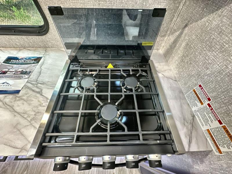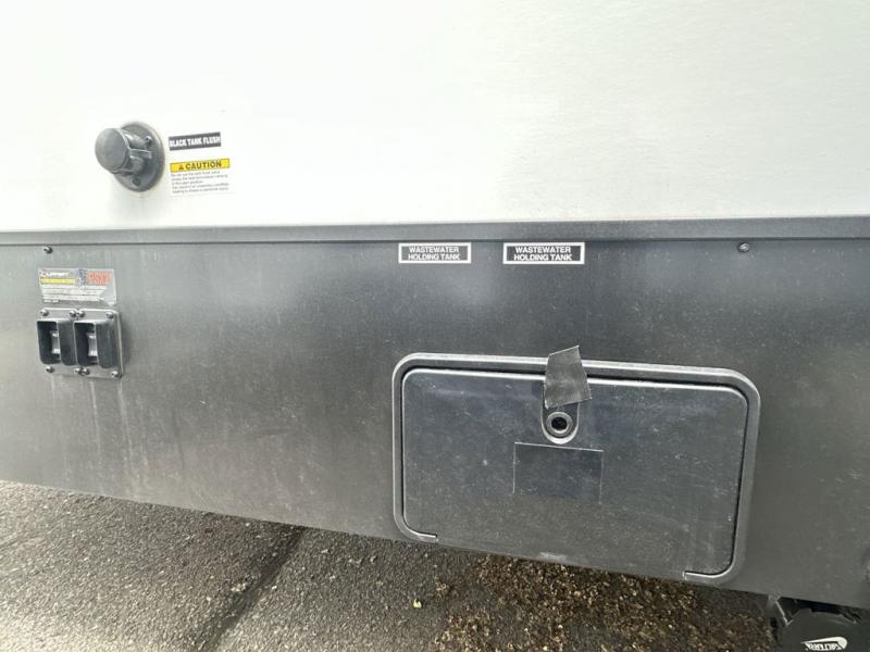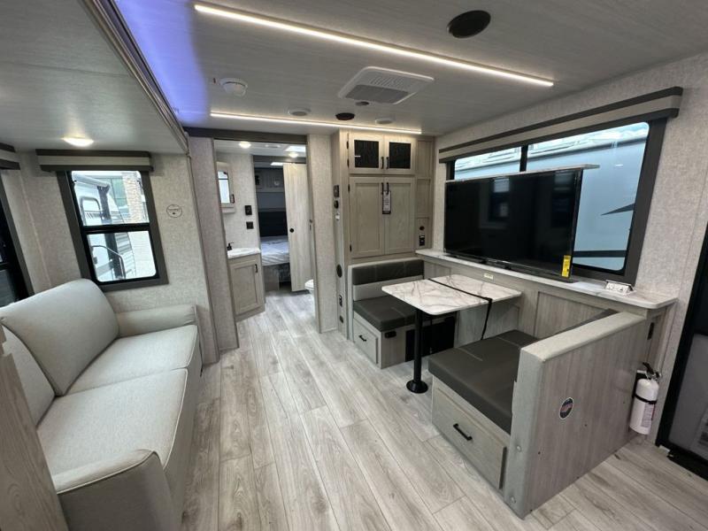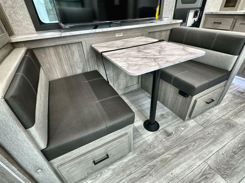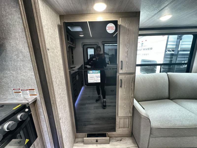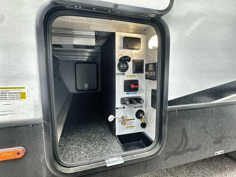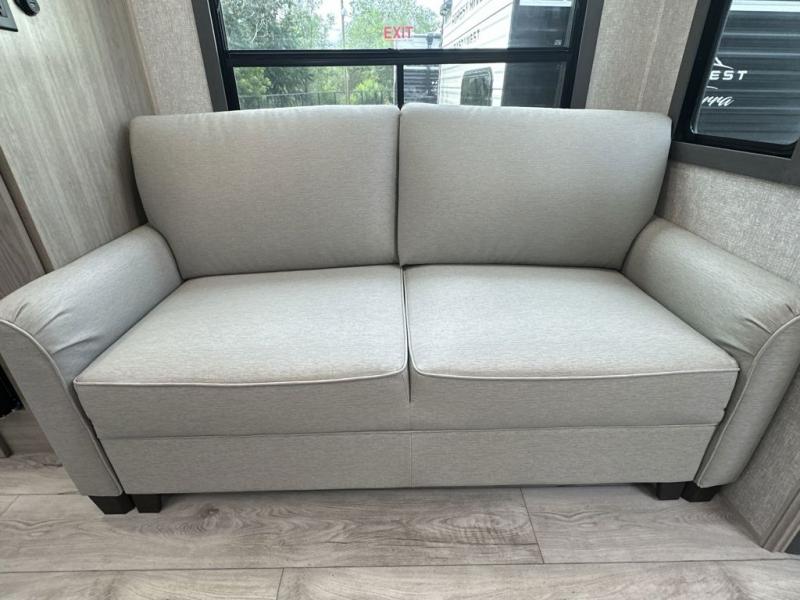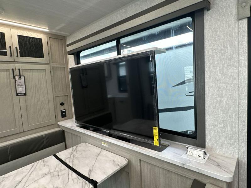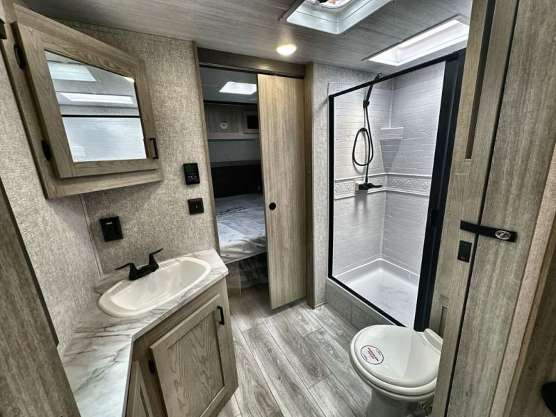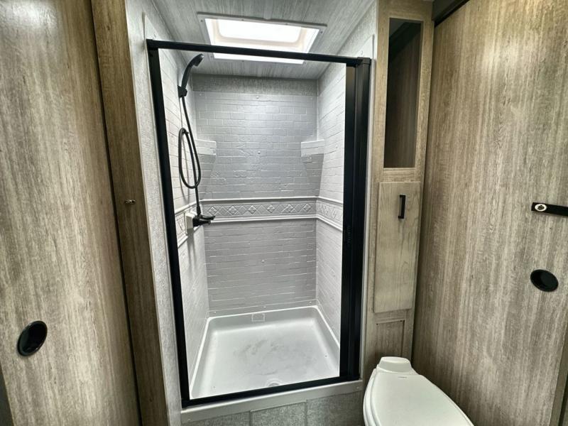 You can comfortably sleep four in this travel trailer thanks to the Tri- Fold Sofa and a king bed. There is also additional space as in the overhead cabinets, dual wardrobes and night stands. The combined living area and kitchen includes a Tri-fold Sofa with optional theater seats, a booth dinette with storage under it, plus a 50" TV. Great accessibility thanks to the two entry doors. In the exterior, there is also a 19' awning and a pass-trough storage. Finally after a long day take a comfortable and relaxing shower in our walk trough bathroom.