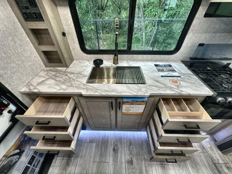 Each Alta travel trailer or toy hauler by EAST TO WEST is constructed with a 5" vacuum bonded roof, an enclosed and heated underbelly, and diamond plate front rock guard for added protection. Outside, you'll find marine-grade exterior speakers, a universal docking station, and back-up camera prep that can be added to make maneuvering in and out of campgrounds easier than ever. Inside, there are 4k interior LED lights, solid pressed membrane countertops, black roller shades, and many more interior comforts you are sure to love.