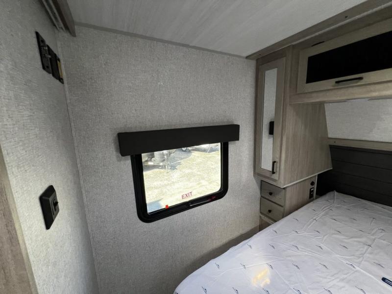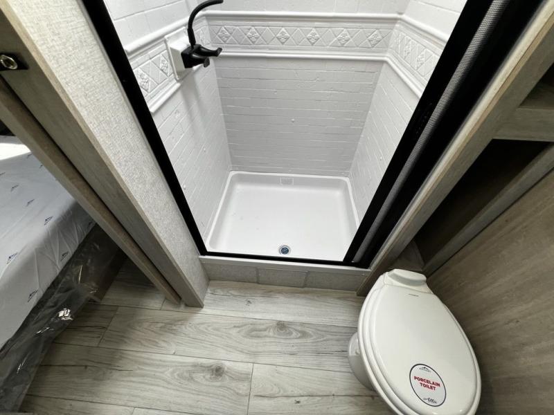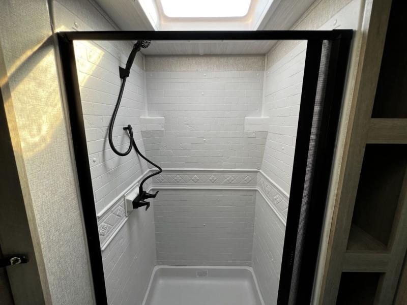 You can comfortably sleep four in this travel trailer thanks to the Tri- Fold Sofa and a king bed. There is also additional space as in the overhead cabinets, dual wardrobes and night stands. The combined living area and kitchen includes a Tri-fold Sofa with optional theater seats, a booth dinette with storage under it, plus a 50" TV. Great accessibility thanks to the two entry doors. In the exterior, there is also a 19' awning and a pass-trough storage. Finally after a long day take a comfortable and relaxing shower in our walk trough bathroom.