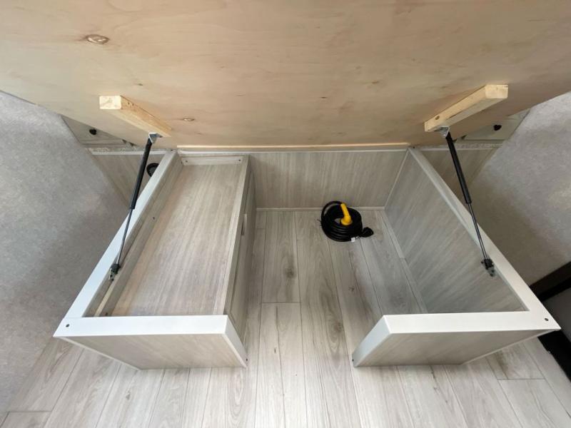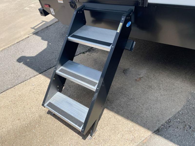 You can comfortably sleep four in this travel trailer thanks to the Tri- Fold Sofa and a king bed. There is also additional space as in the overhead cabinets, dual wardrobes and night stands. The combined living area and kitchen includes a Tri-fold Sofa with optional theater seats, a booth dinette with storage under it, plus a 50" TV. Great accessibility thanks to the two entry doors. In the exterior, there is also a 19' awning and a pass-trough storage. Finally after a long day take a comfortable and relaxing shower in our walk trough bathroom.